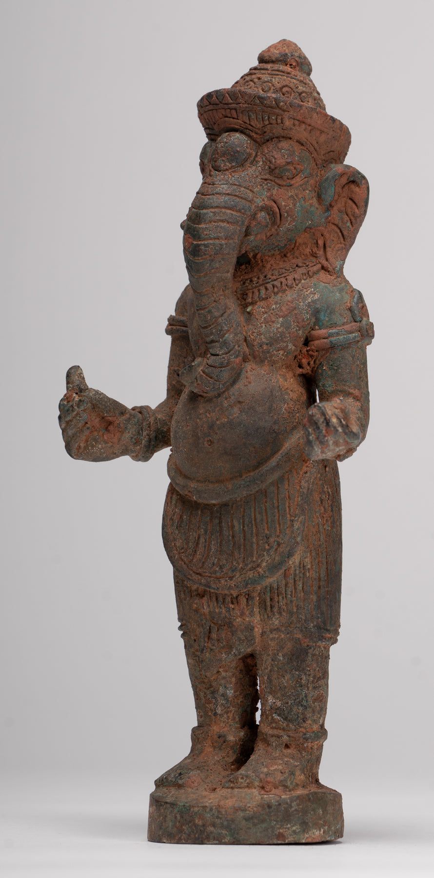 Un Ganesha debout en bronze de style thaïlandais antique. Il tient sa défense cassée dans une main.
