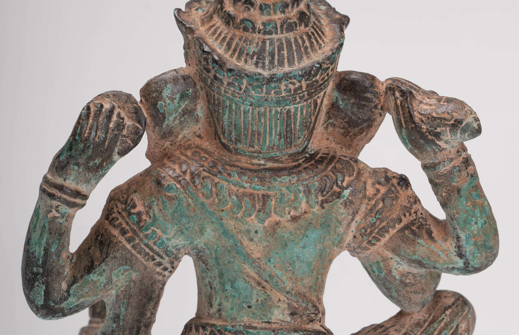 Ce magnifique Ganesha en bronze à 4 bras présente des traits du visage et des bijoux ornés typiques du style d'Angkor Wat. L'empilement cylindrique des cheveux en un chignon haut et des boucles de cheveux régimentées démontrent le caractère œcuménique de l'iconographie de la période d'Angkor Wat , la première associée à la forme suprême de Vishnu, la seconde à Shiva.