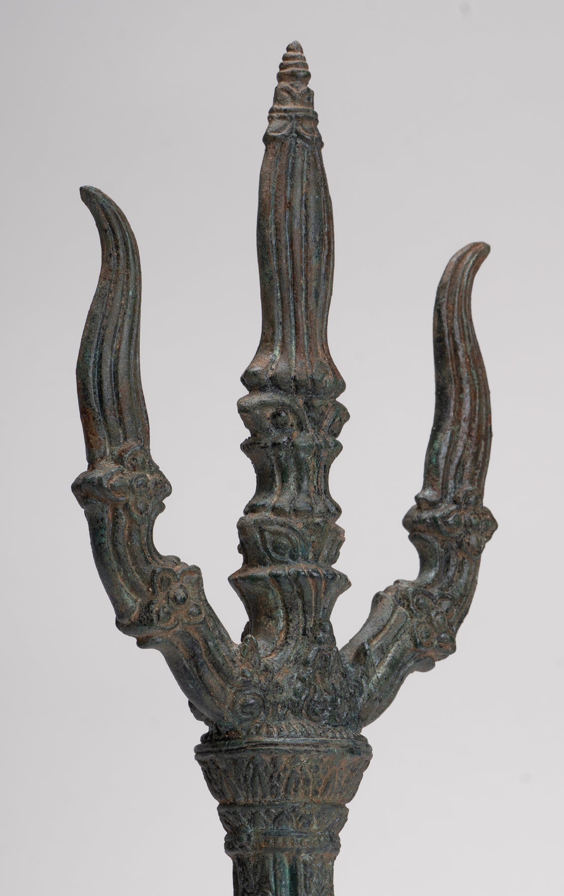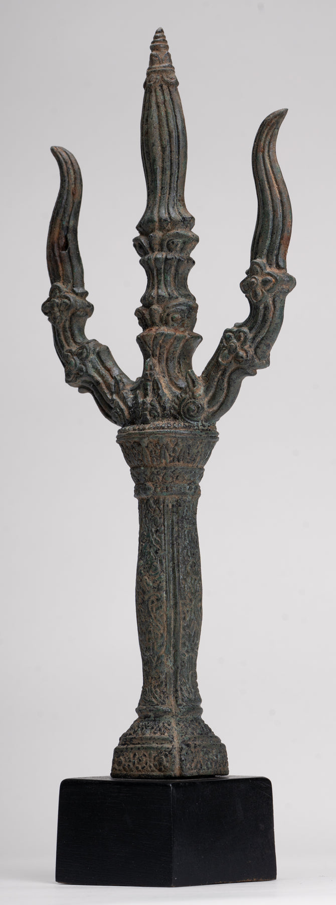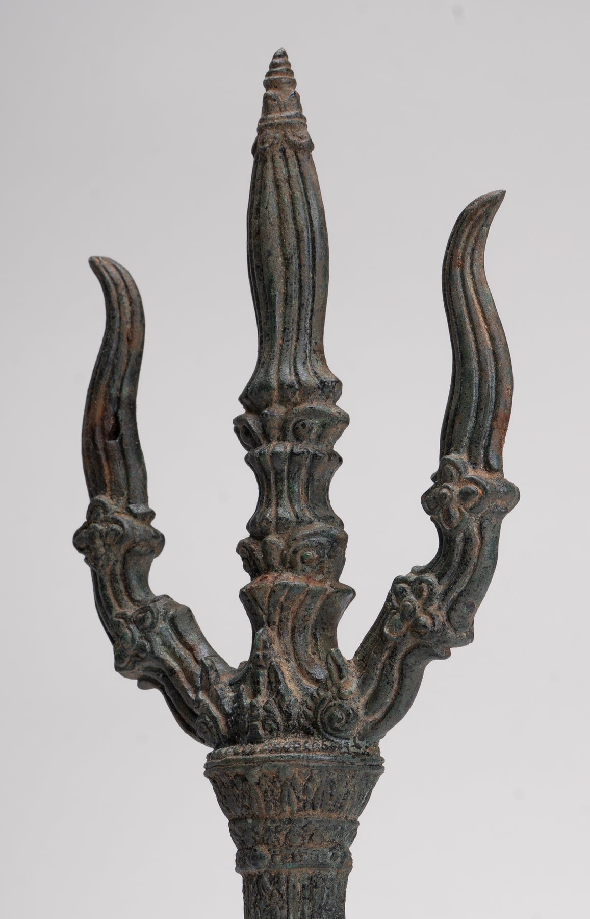 Dans ses quatre mains Ganesha tient un trident, des friandises, un nœud coulant, et son défense cassée, chacun chargé d'une signification symbolique. Le nœud coulant représente son pouvoir de capturer et de contrôler les pensées et les désirs négatifs ou capricieux, tandis que la défense brisée représente le sacrifice, la persévérance et le triomphe de la sagesse sur l'orgueil. Le trident, le plus célèbre associé à Shiva, relie Ganesha directement à son père et symbolise la destruction du mal et de l'ignorance. Aux yeux de Ganesha, cela devient un puissant emblème de sa capacité à éliminer les obstacles non seulement dans le monde physique mais aussi dans les domaines spirituel et intellectuel, combinant destruction, protection et transcendance. Ses trois volets évoquent les triades clés de la philosophie hindoue, telles que la création, la préservation et la destruction ; passé, présent et futur, soulignant le rôle global de Ganesha dans le cosmos.