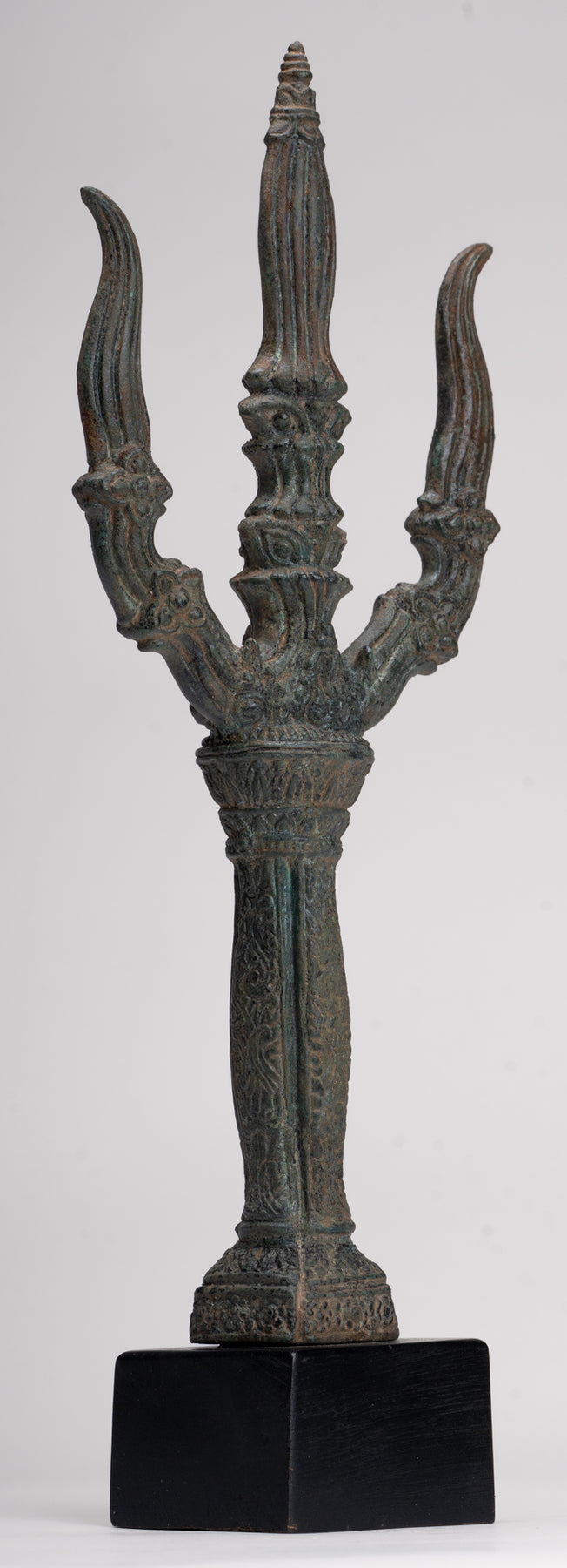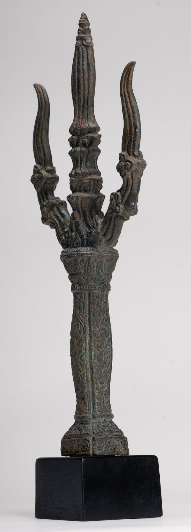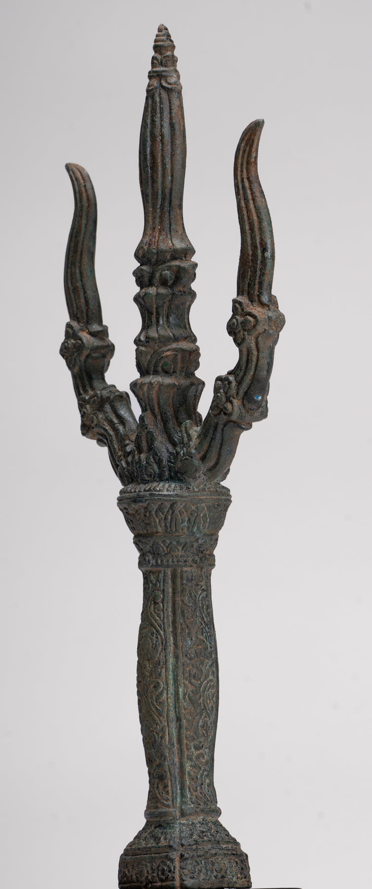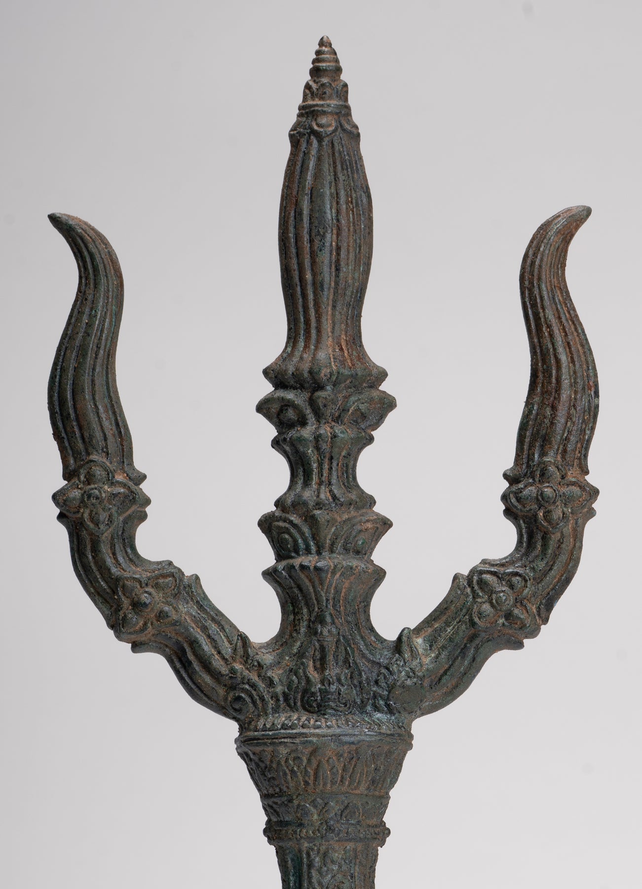 Dans ses quatre mains Ganesha tient un trident, des friandises, un nœud coulant, et son défense cassée, chacun chargé d'une signification symbolique. Le nœud coulant représente son pouvoir de capturer et de contrôler les pensées et les désirs négatifs ou capricieux, tandis que la défense brisée représente le sacrifice, la persévérance et le triomphe de la sagesse sur l'orgueil. Le trident, le plus célèbre associé à Shiva, relie Ganesha directement à son père et symbolise la destruction du mal et de l'ignorance. Aux yeux de Ganesha, cela devient un puissant emblème de sa capacité à éliminer les obstacles non seulement dans le monde physique mais aussi dans les domaines spirituel et intellectuel, combinant destruction, protection et transcendance. Ses trois volets évoquent les triades clés de la philosophie hindoue, telles que la création, la préservation et la destruction ; passé, présent et futur, soulignant le rôle global de Ganesha dans le cosmos.