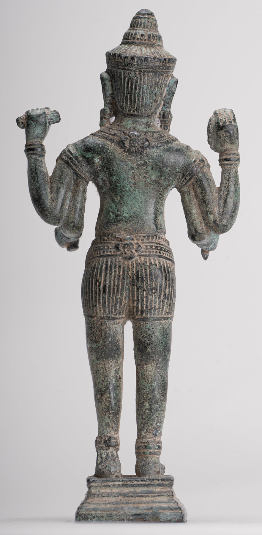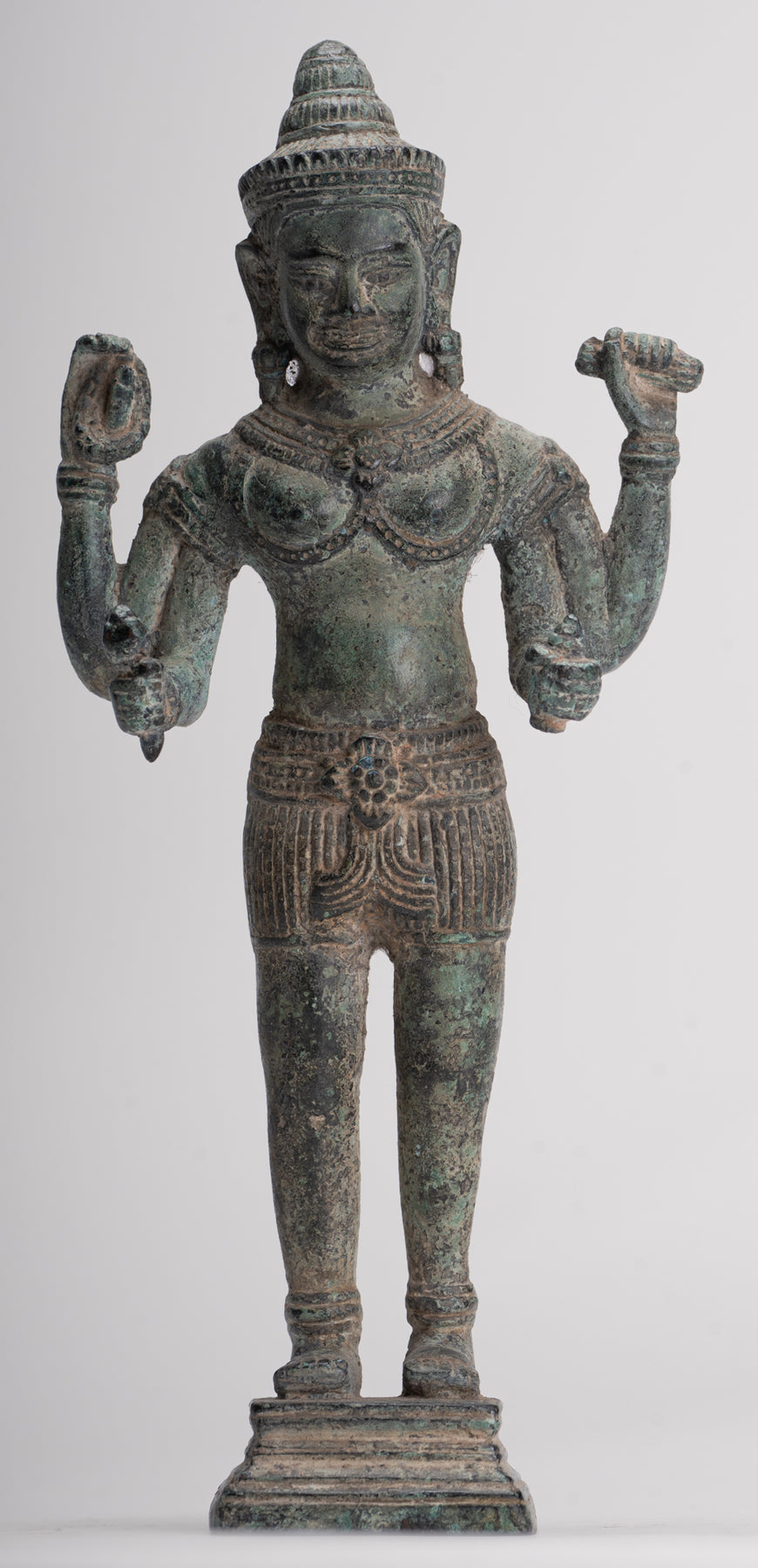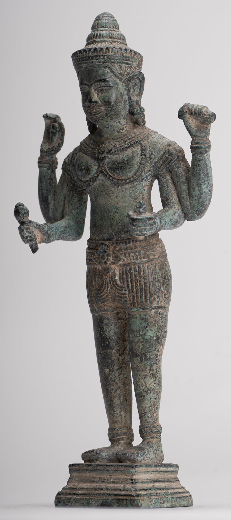 Un Khmer Vishnu antique de style Angkor Wat se dressait sur samapada. socle simple.La sculpture est dans le style d'Angkor Wat du XIIe siècle. L'ampleur des formes confère au visage une douceur qui accentue les yeux presque baissés, et les lèvres charnues et sensuelles. L'anatomie fait preuve d'un fort sens de l'observation. La silhouette générale est élégante et rappelle l’art angkorien. Dans le style d'Angkor Wat, la moustache de Vishnu est clairement visible.