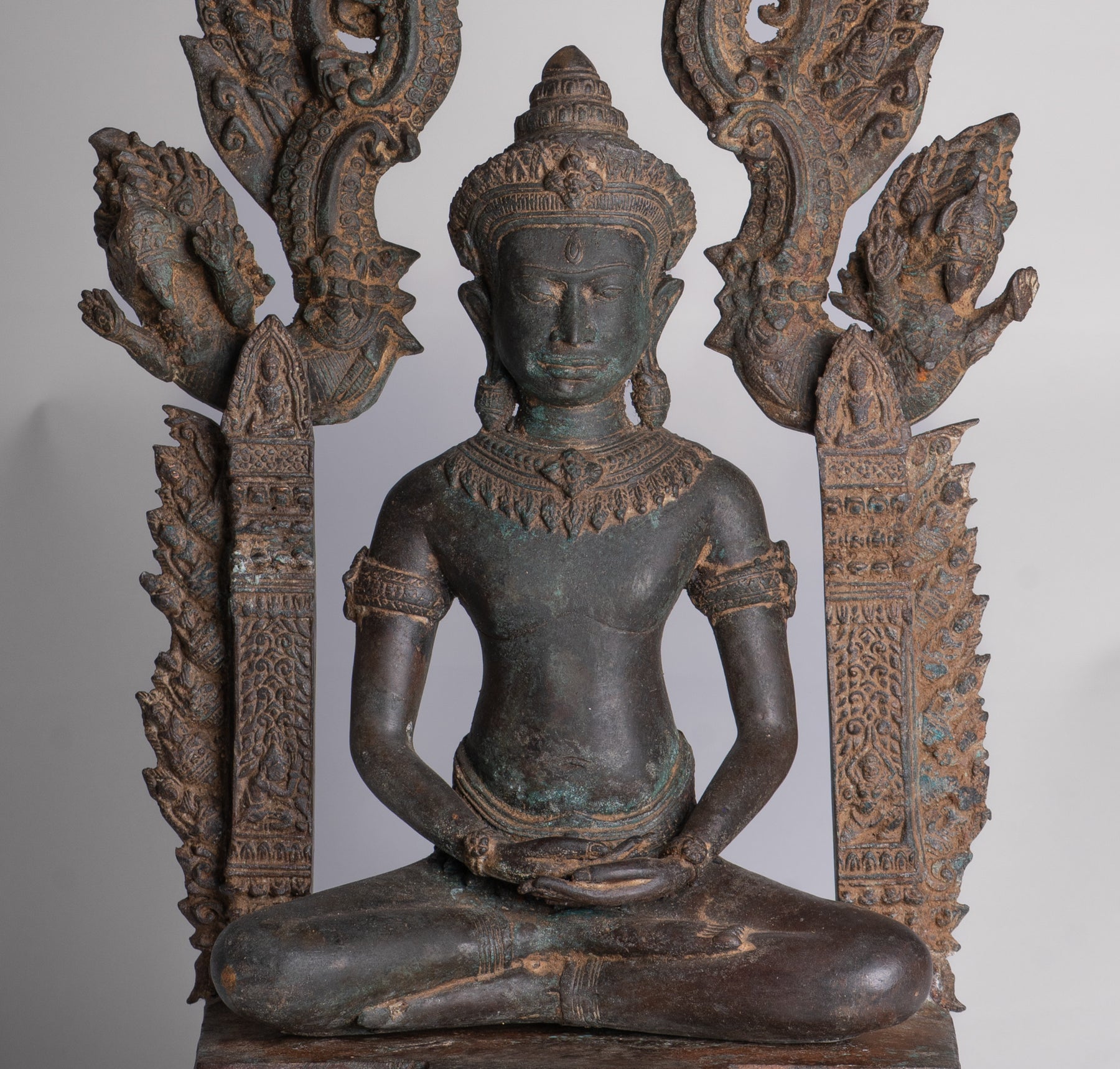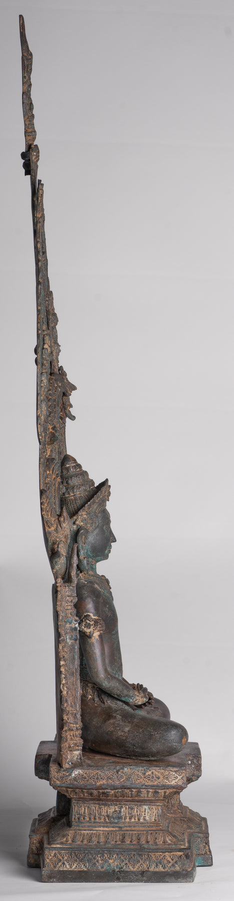 Trônant sur un piédestal orné le Bouddha de style Lopburi est réputé pour ses traits symétriques et bien proportionnés. Comme d'habitude, cette statue de Lopburi représente Bouddha en position assise, avec une expression calme et méditative. L'accent mis sur la symétrie reflète l'équilibre et l'harmonie que les bouddhistes recherchent dans leur voyage spirituel.