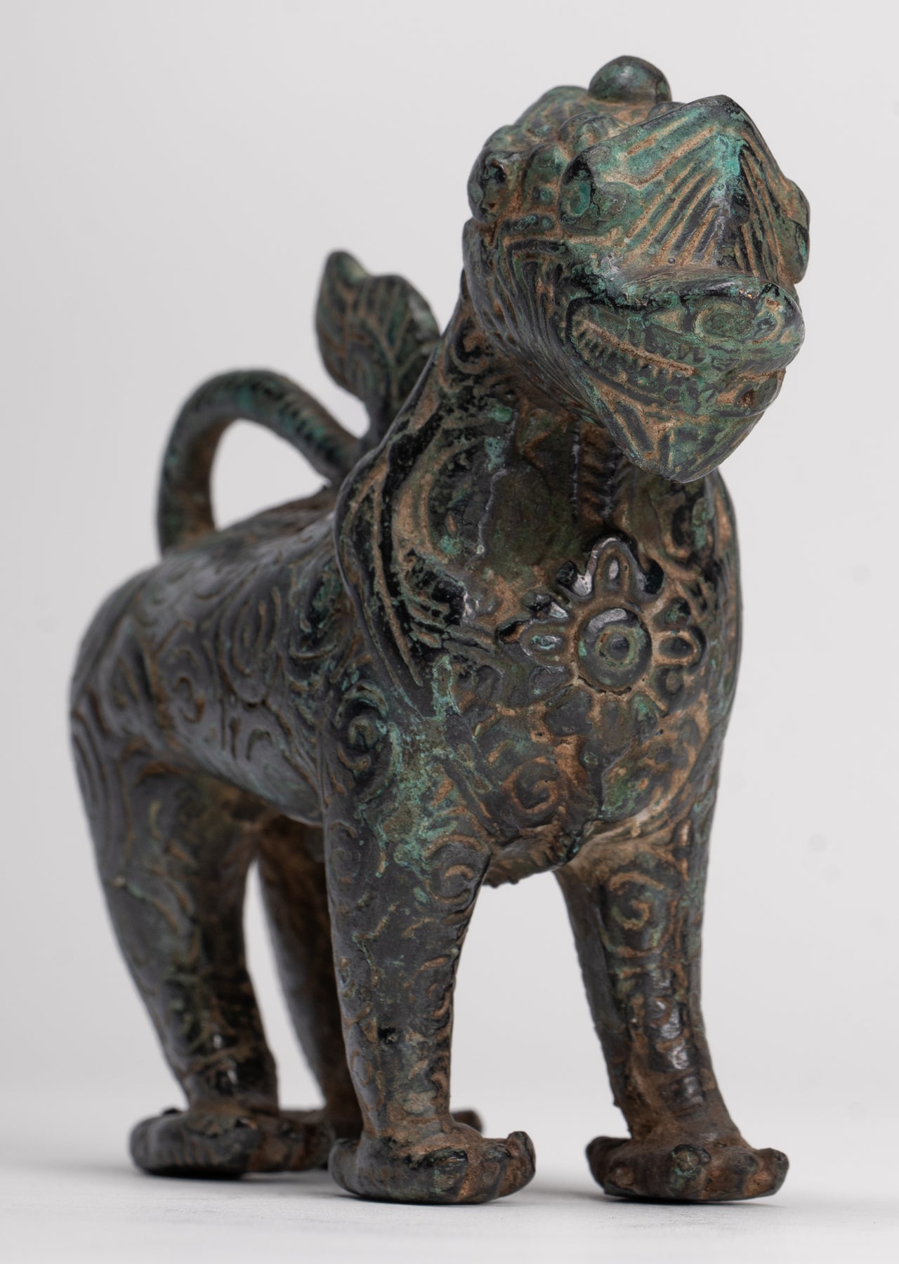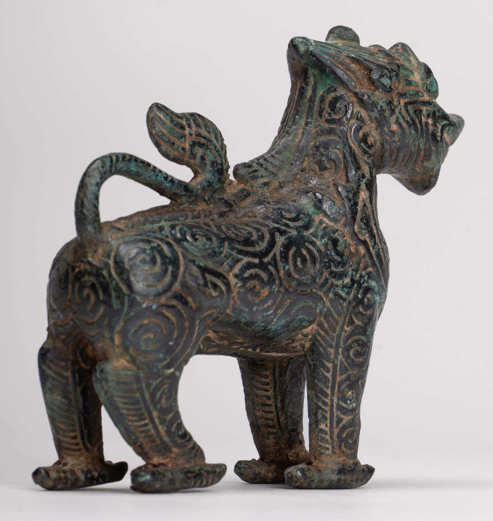 Lion du temple gardien Chinthe debout en bronze antique de style khmer - 10,5 cm/4"