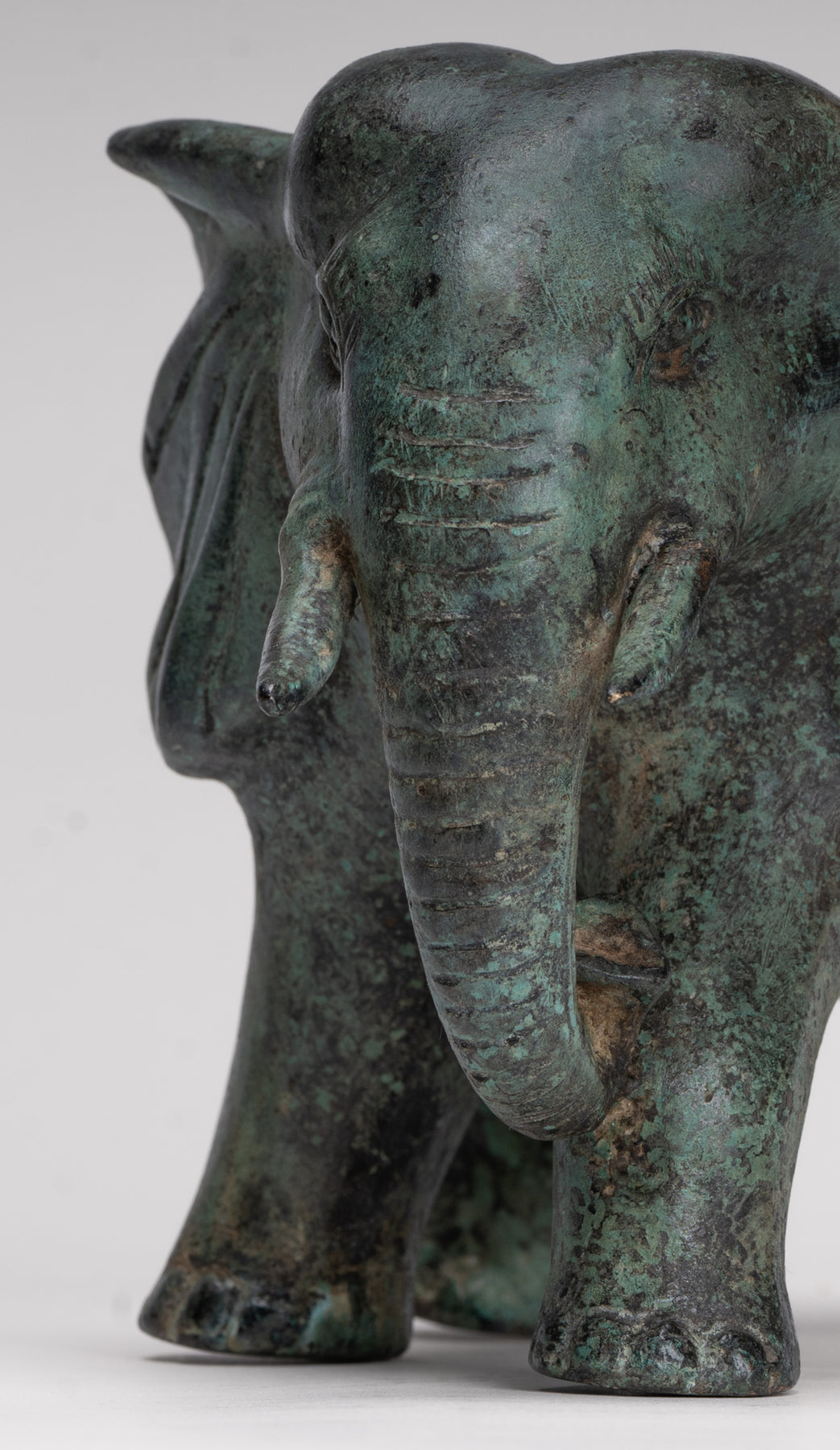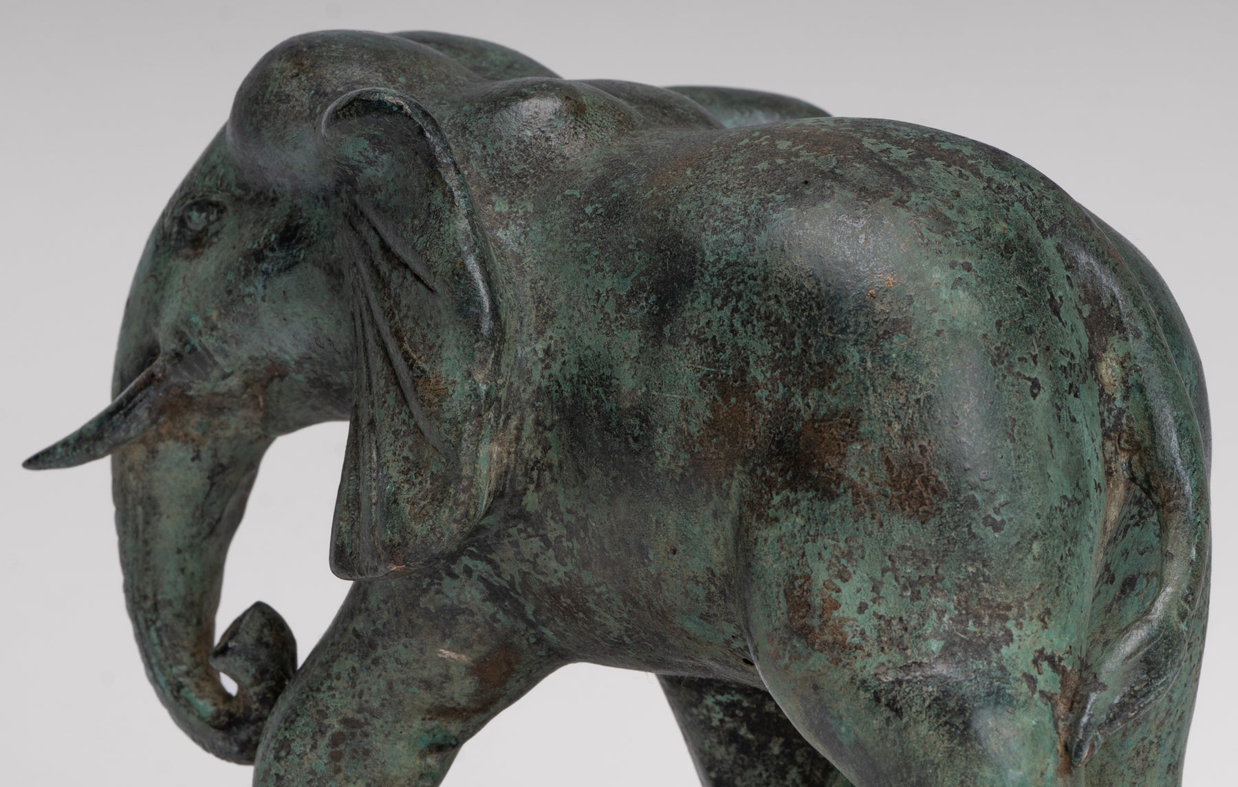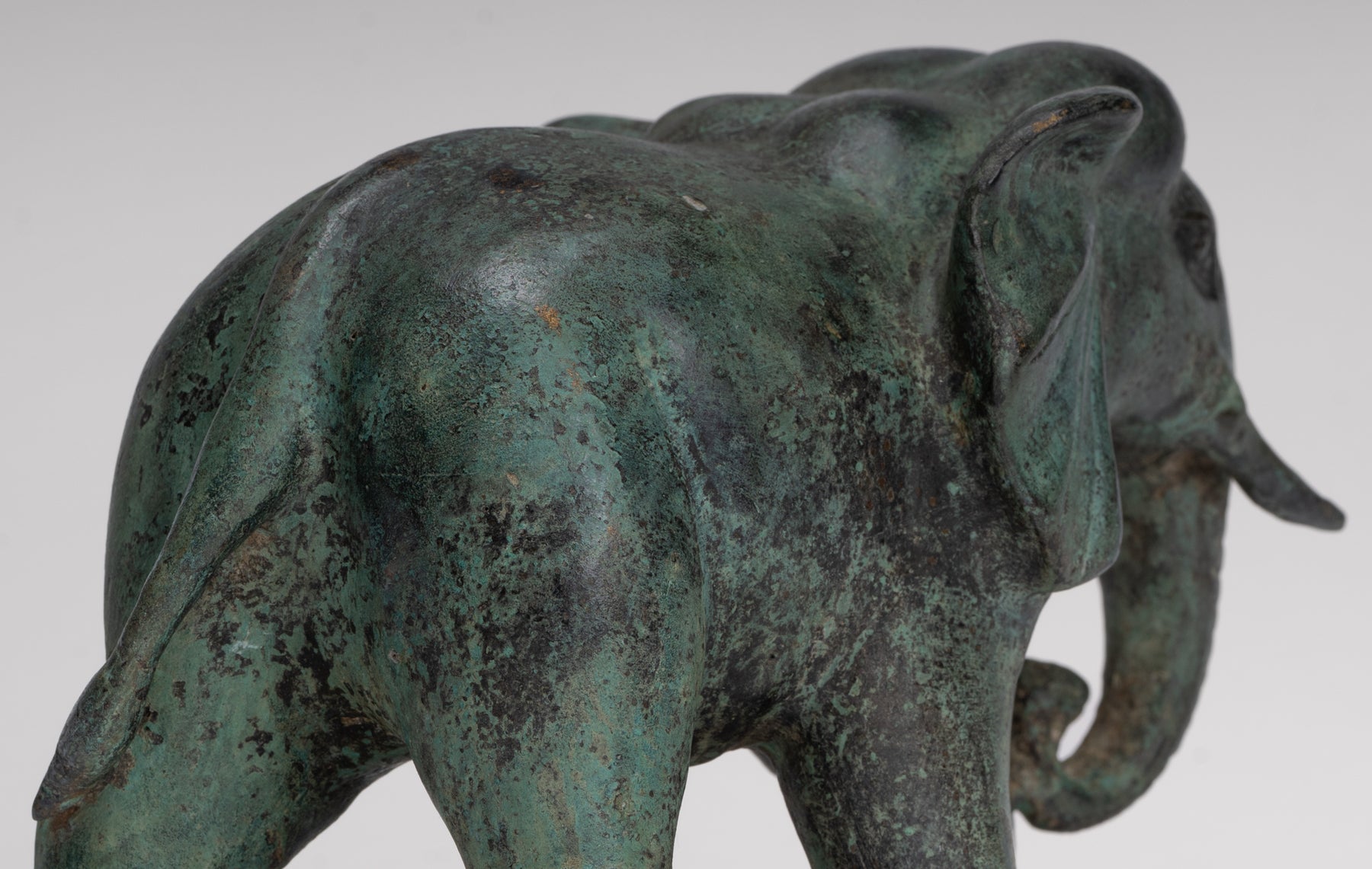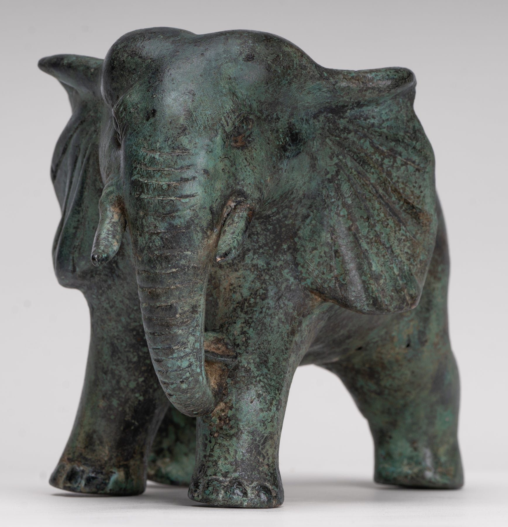 Une statue antique d'éléphant en bronze de style khmer provenant de Cambodge, avec une riche patine verte qui parle d'âge et de caractère. L’éléphant avance avec douceur et confiance, son corps attrapé à mi-pas pour suggérer un mouvement calme et une force.