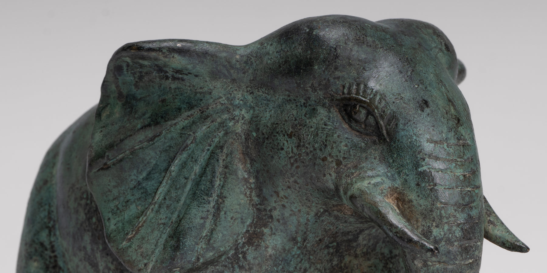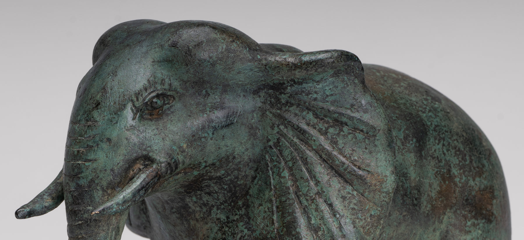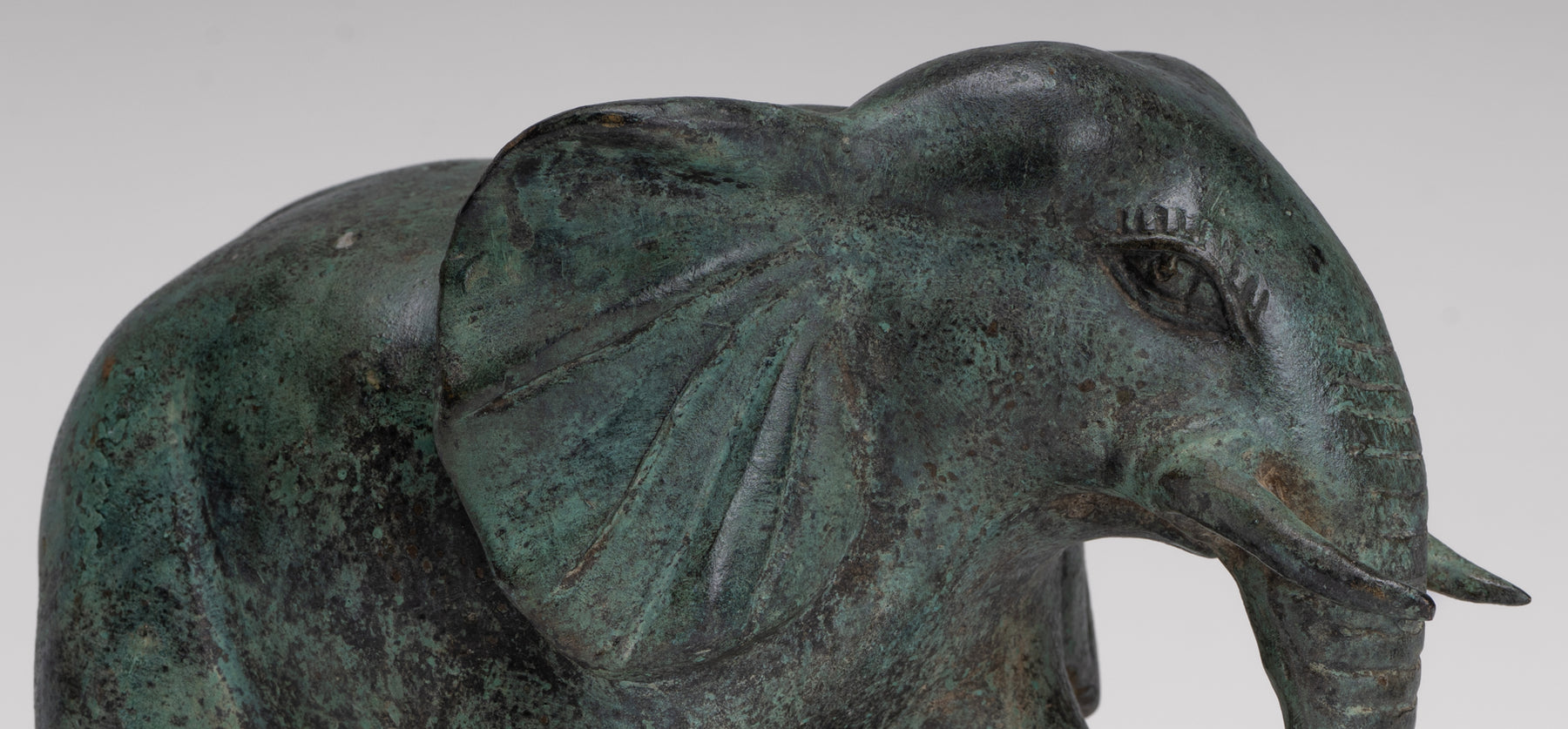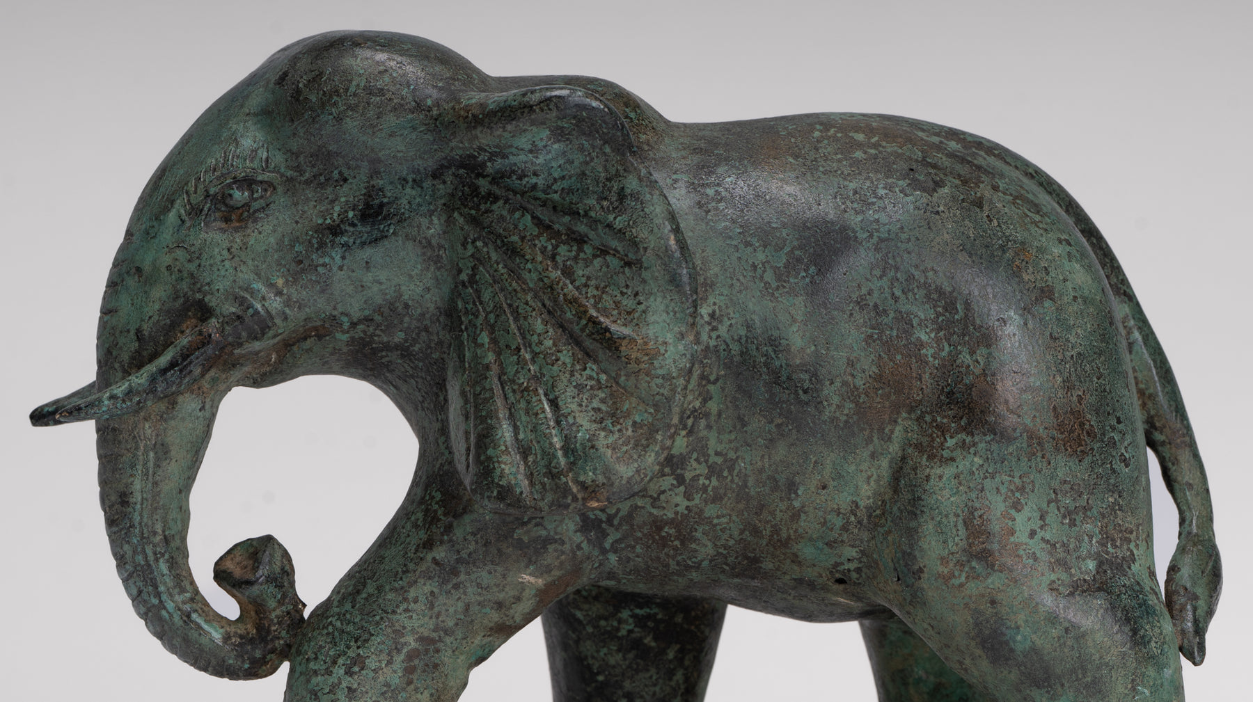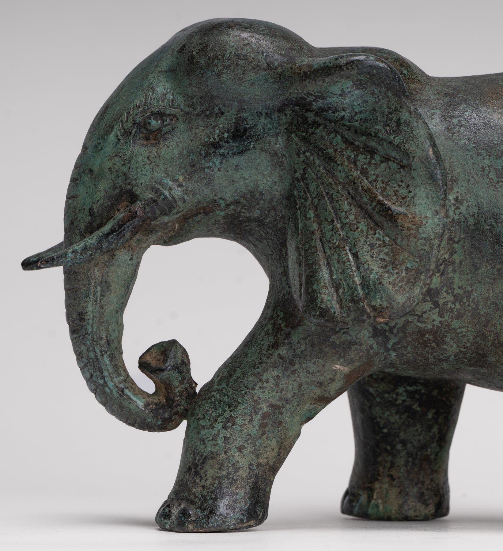 Une statue antique d'éléphant en bronze de style khmer provenant de Cambodge, avec une riche patine verte qui parle d'âge et de caractère. L’éléphant avance avec douceur et confiance, son corps attrapé à mi-pas pour suggérer un mouvement calme et une force.