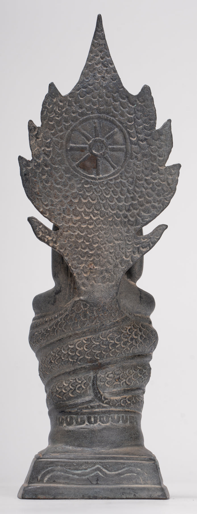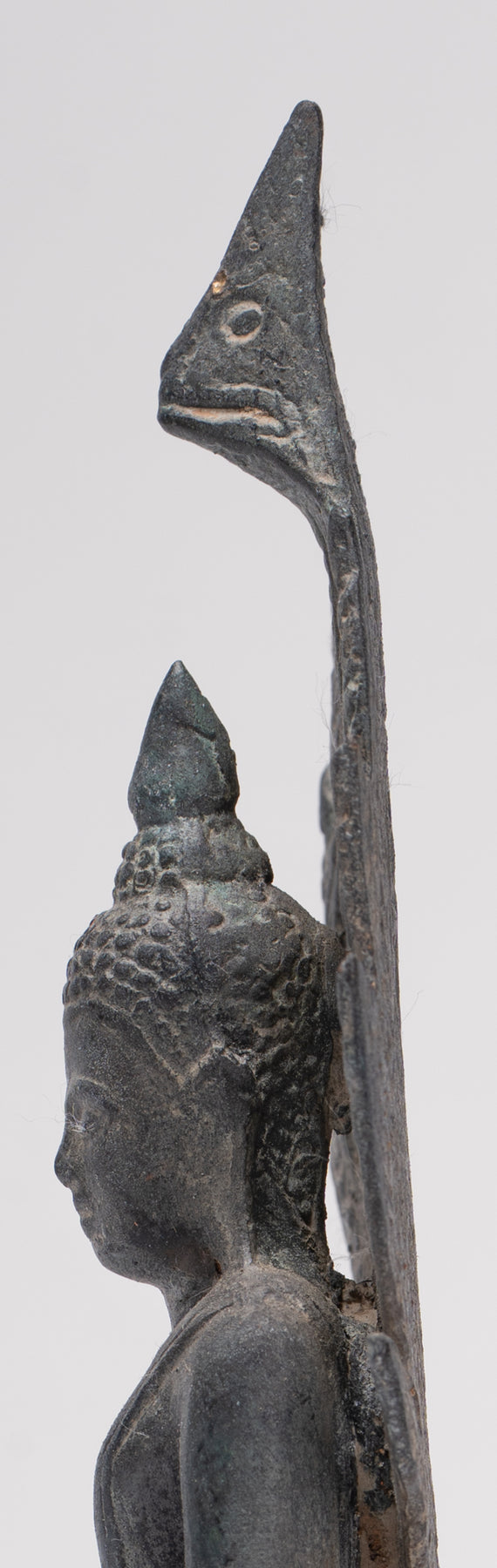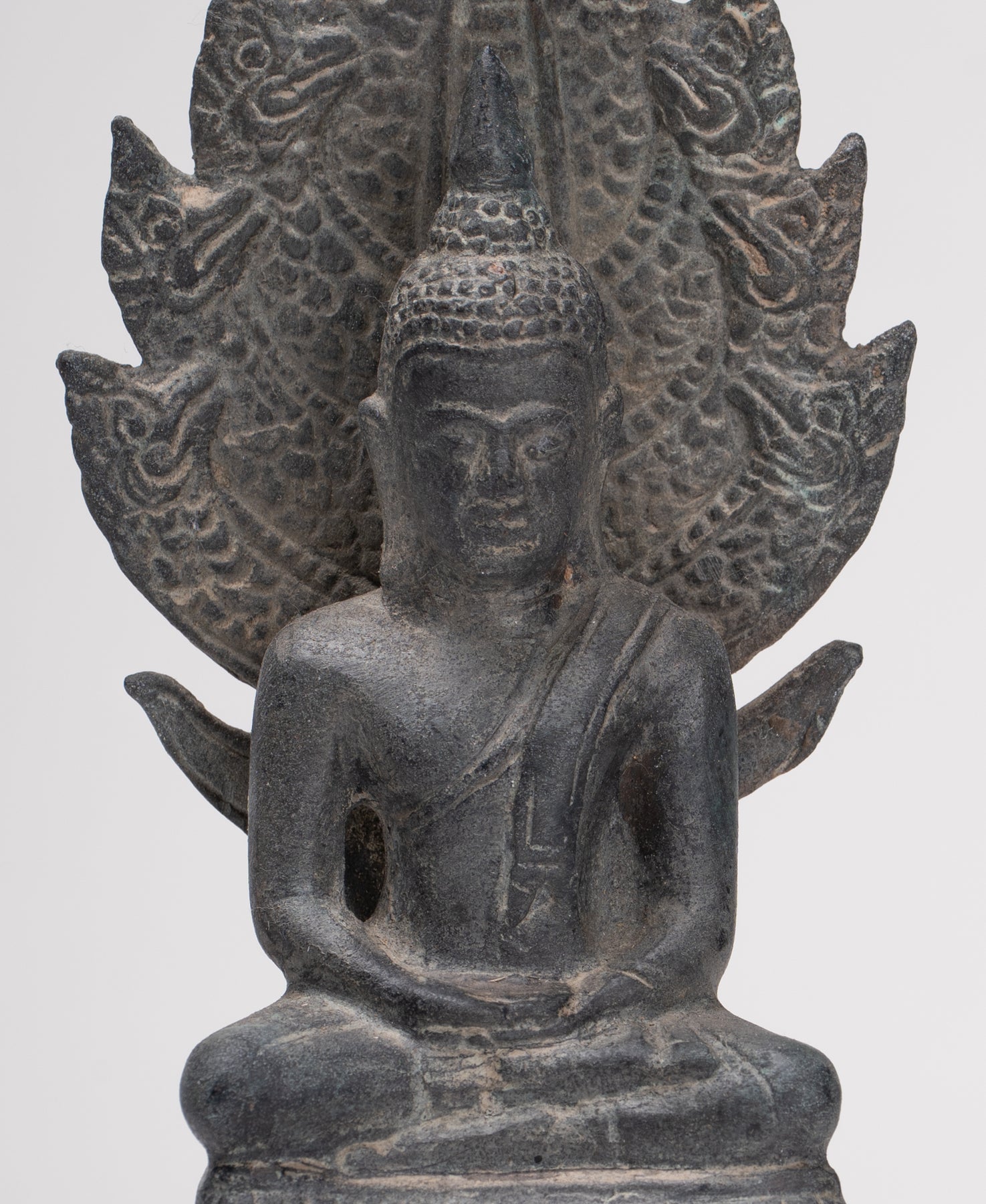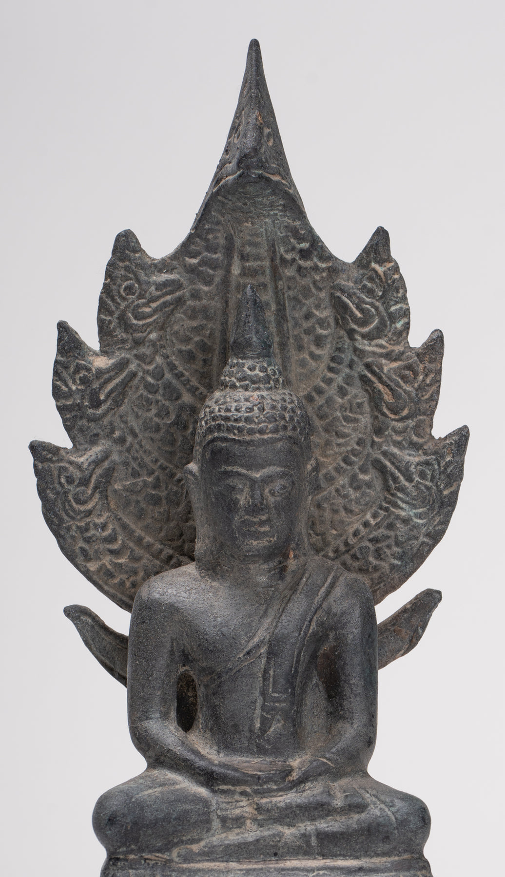 Le Le visage de Bouddha rayonne de paix et de douce introspection, avec des traits doux et naturalistes qui capturent à la fois l’humanité et la transcendance. Sa tête est couronnée d'un dessin finement détaillé Ouchnisha, caractéristique du raffiné À la manière de Sukhothaï, signifiant connaissance spirituelle et illumination. Le forme de serpent est habilement modelé, symétrique et digne, ses écailles complexes et ses têtes équilibrées incarnant à la fois la force et la dévotion.