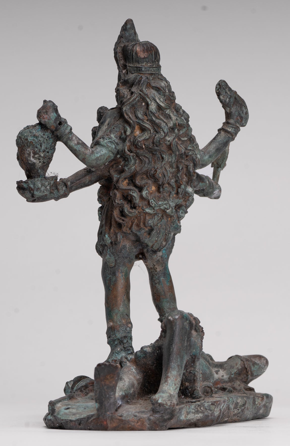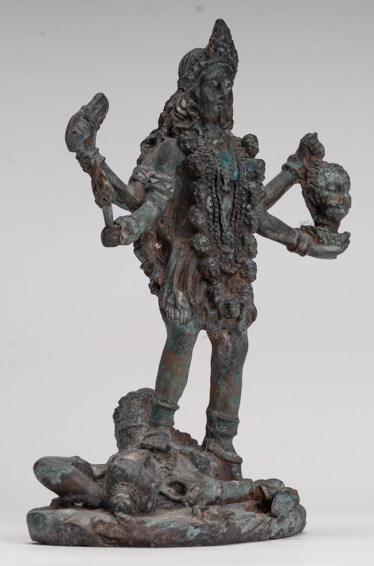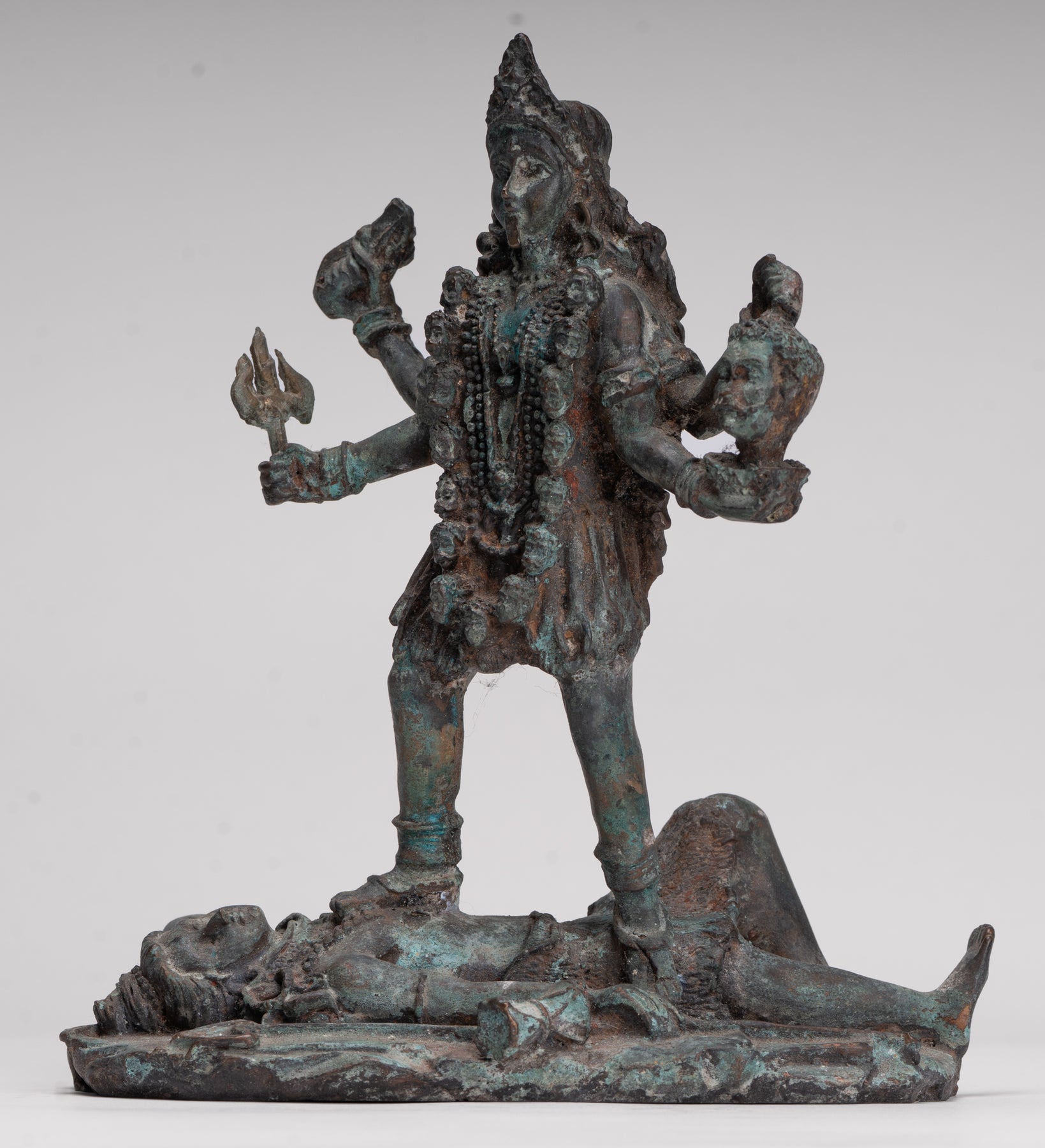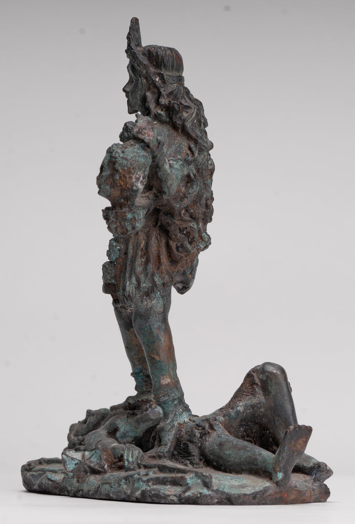 Un bronze antique de style indien Kali (Mahakali) sculpture dans une pose de victoire dynamique, cette pièce saisissante est rendue au XIIIe siècle Style Majapahit. Ici, la déesse redoutable mais protectrice se tient triomphalement sur un visage prosterné. Shiva, incarnant le triomphe ultime de la puissance divine et de l'ordre cosmique.