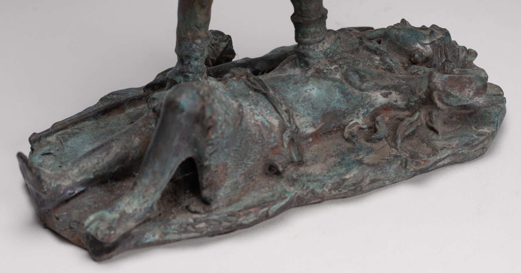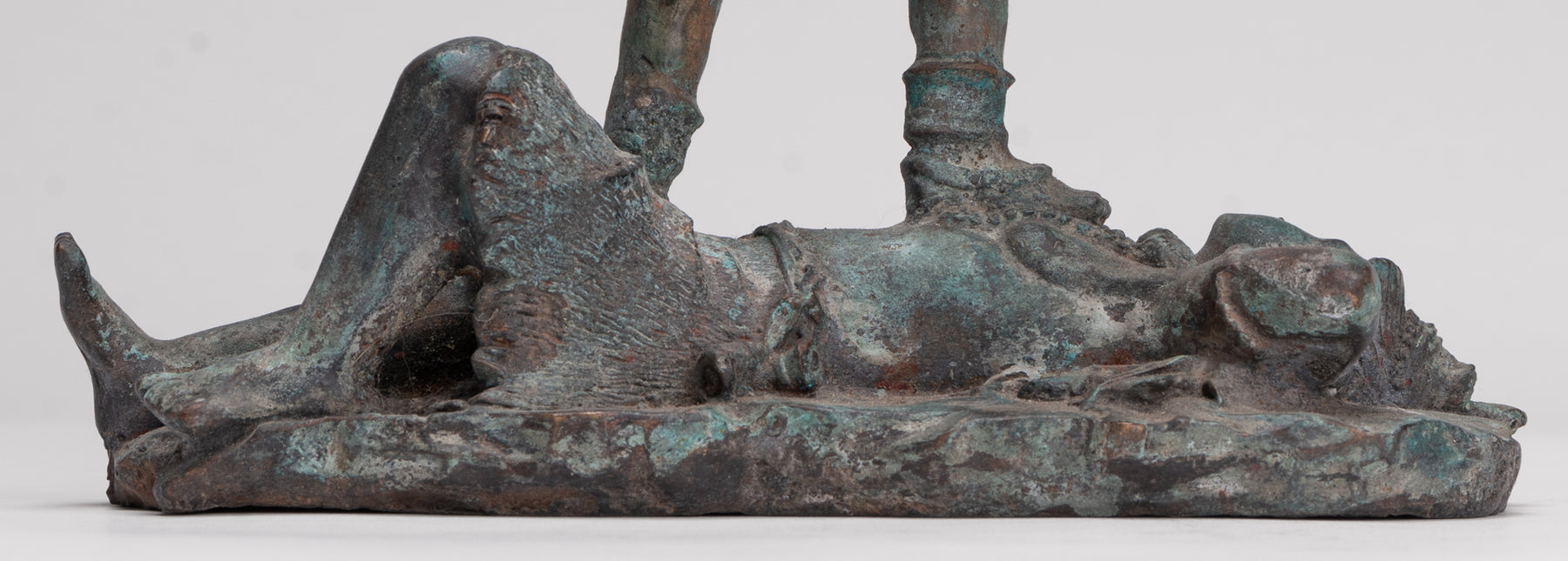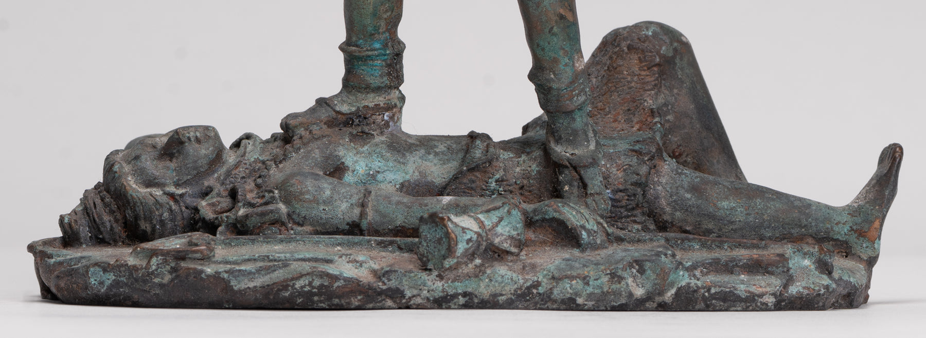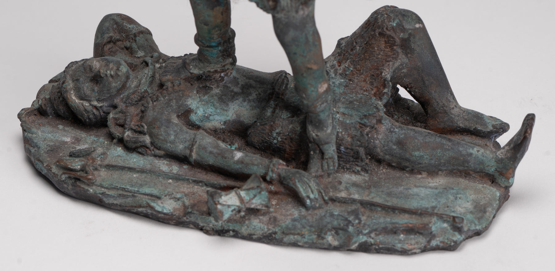 Un bronze antique de style indien Kali (Mahakali) sculpture dans une pose de victoire dynamique, cette pièce saisissante est rendue au XIIIe siècle Style Majapahit. Ici, la déesse redoutable mais protectrice se tient triomphalement sur un visage prosterné. Shiva, incarnant le triomphe ultime de la puissance divine et de l'ordre cosmique.