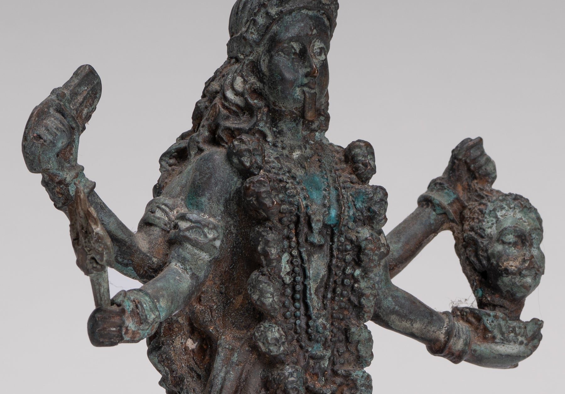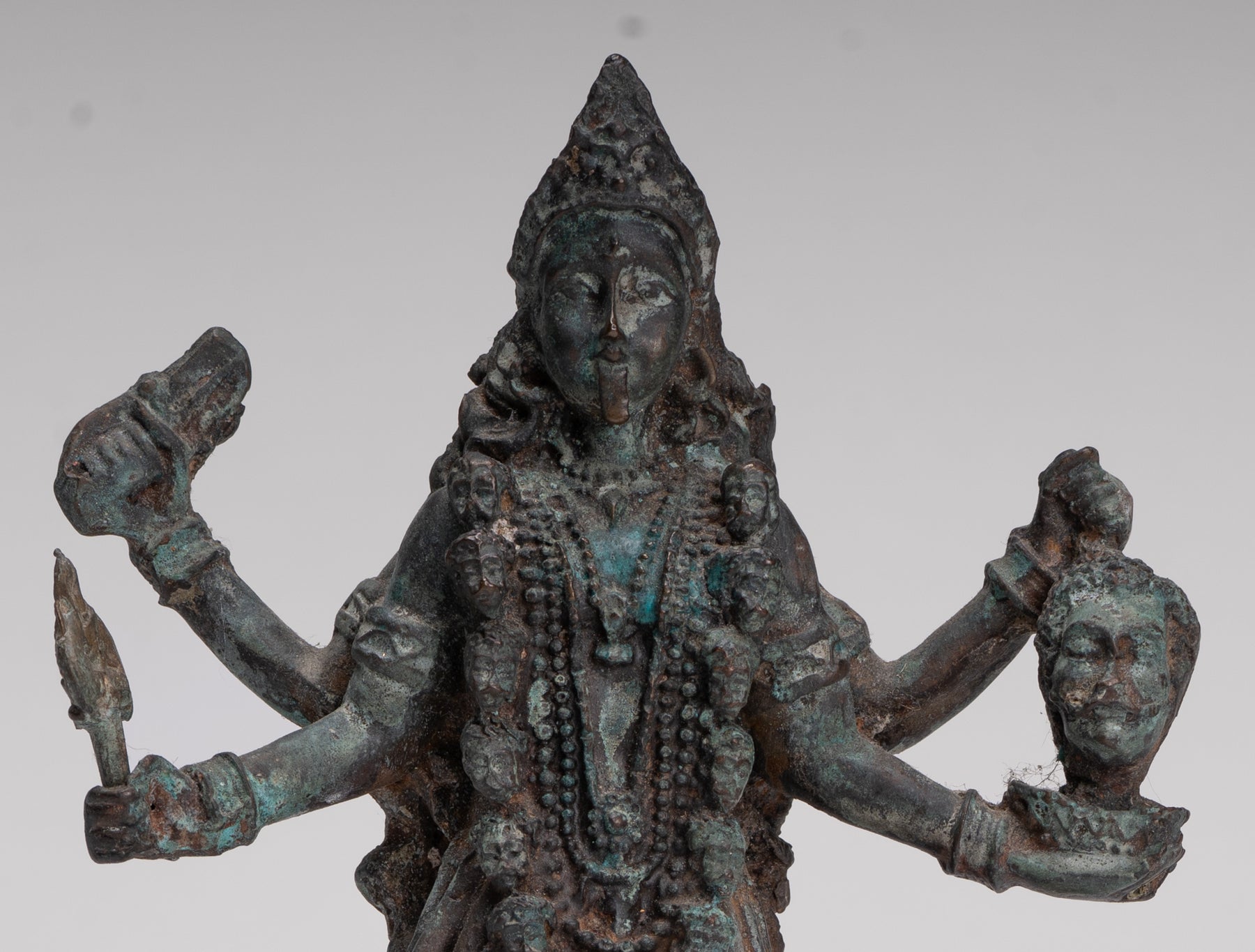 Autour de son cou pend un drame guirlande de têtes humaines, compris comme le Varnamala, la guirlande de lettres sanscrites (Devanagari). Chaque lettre est considérée comme une forme d'énergie et un aspect de Kali elle-même, affirmant son rôle de mère du langage et des mantras. Sur sa tête, elle porte un ornement de style indien diadème devant un grand Kirita-makuta (couronne conique), symbolisant la maîtrise des forces positives et négatives. Un troisième œil (urne) sur son front signifie une vision spirituelle accrue au-delà de la perception ordinaire.