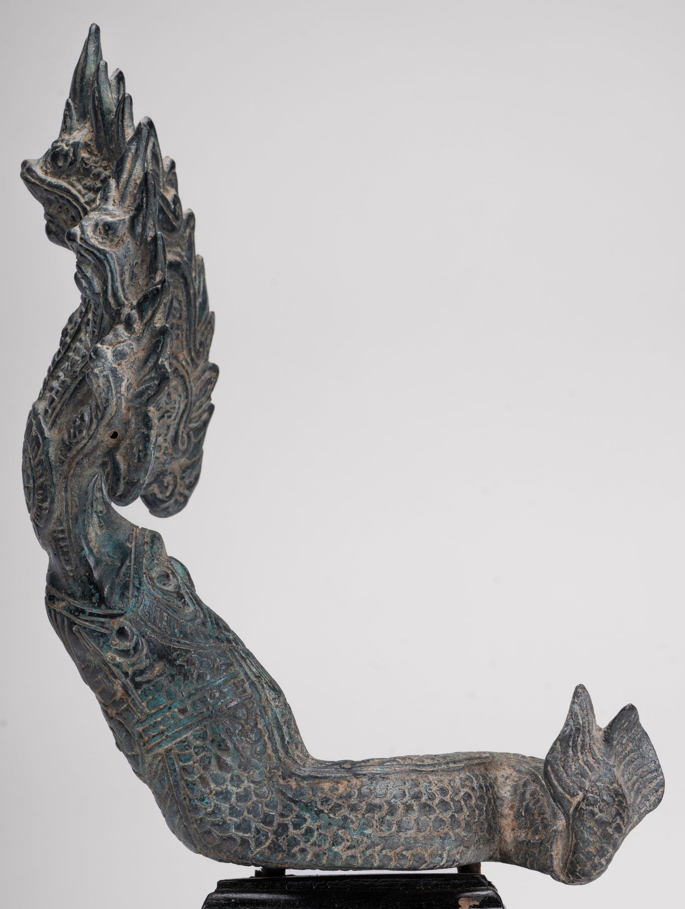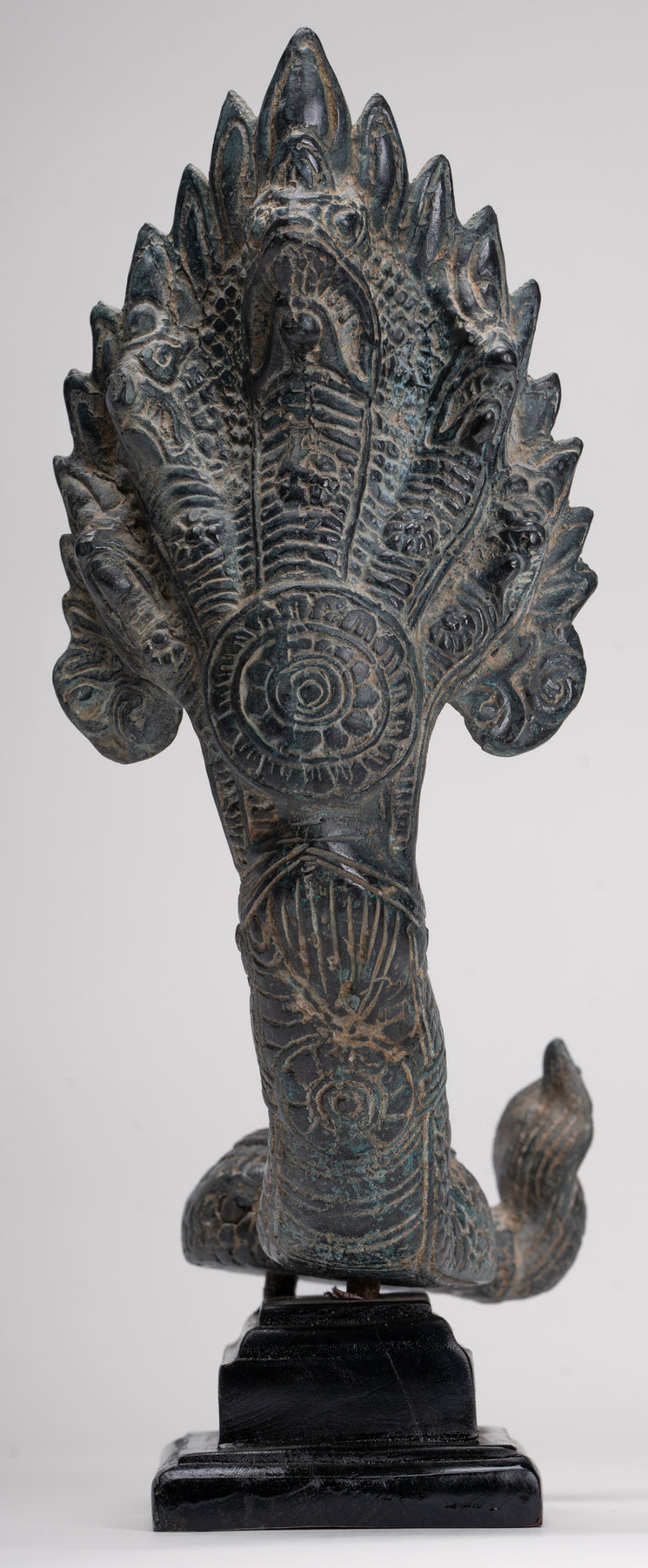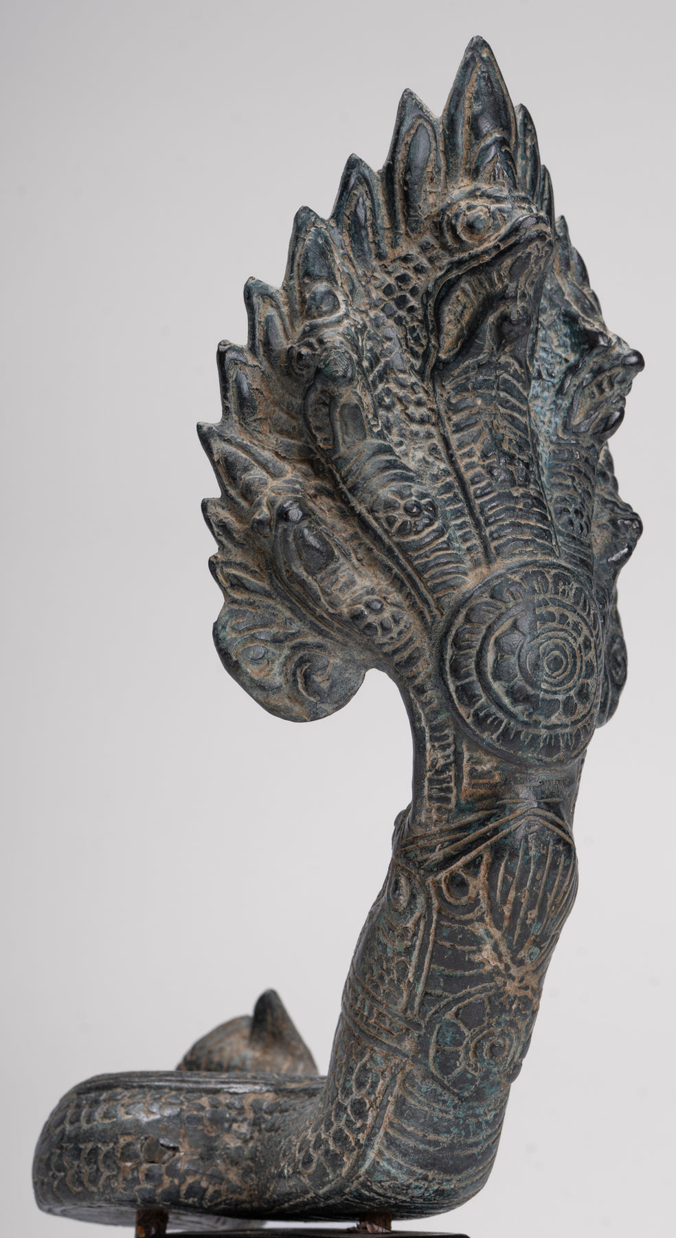 Le moulage de cette pièce est particulièrement soigné, comme en témoignent les détails complexes de chacune des têtes et des écailles du Naga. Chaque élément est rendu avec précision et la patine distinctive ajoute de la profondeur, du caractère et une impression d'âge à la sculpture.