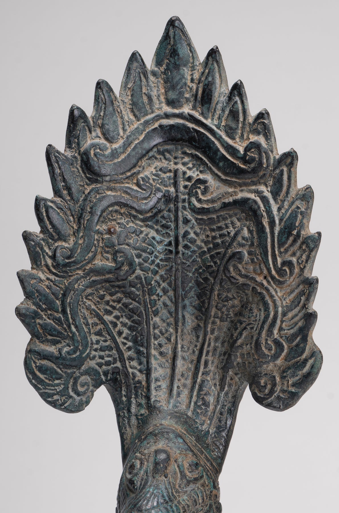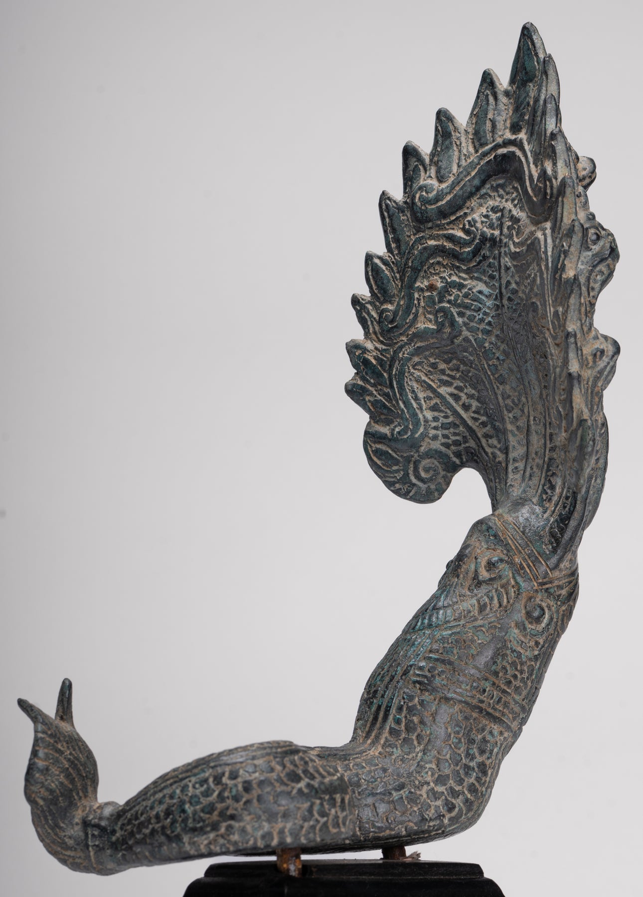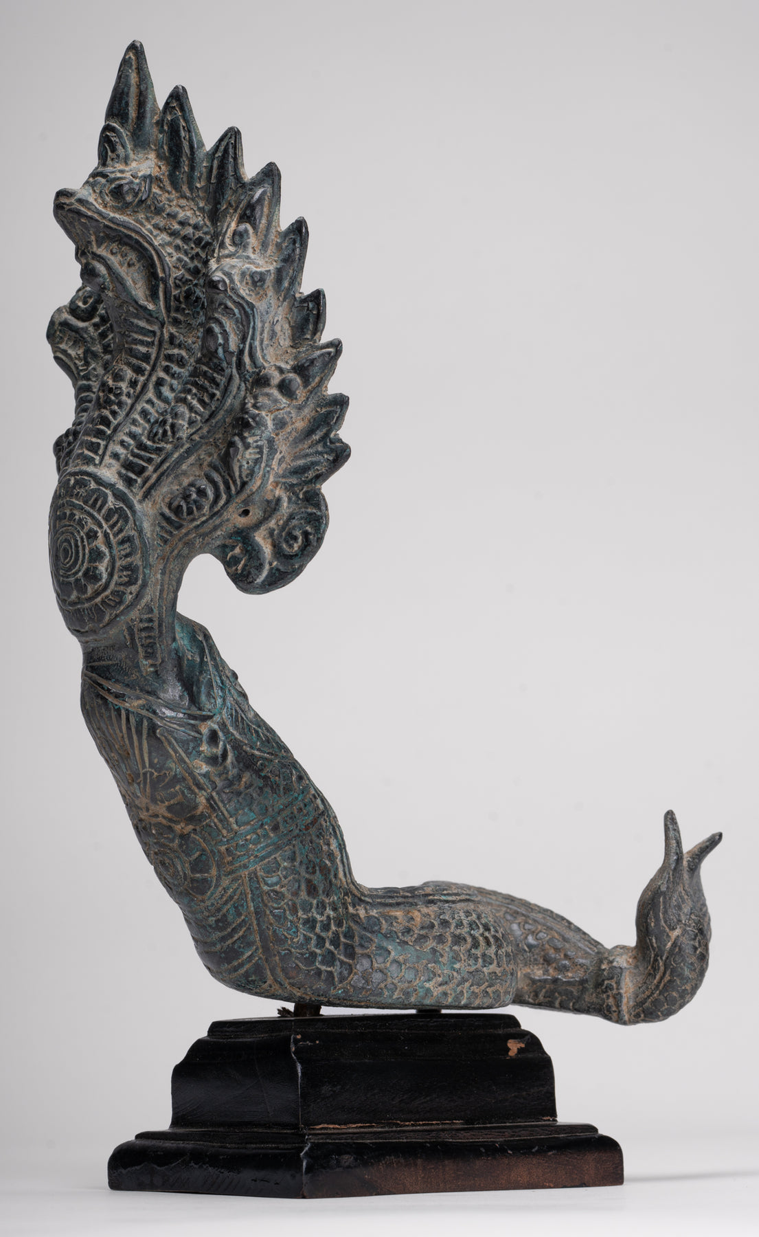 Le moulage de cette pièce est particulièrement soigné, comme en témoignent les détails complexes de chacune des têtes et des écailles du Naga. Chaque élément est rendu avec précision et la patine distinctive ajoute de la profondeur, du caractère et une impression d'âge à la sculpture.