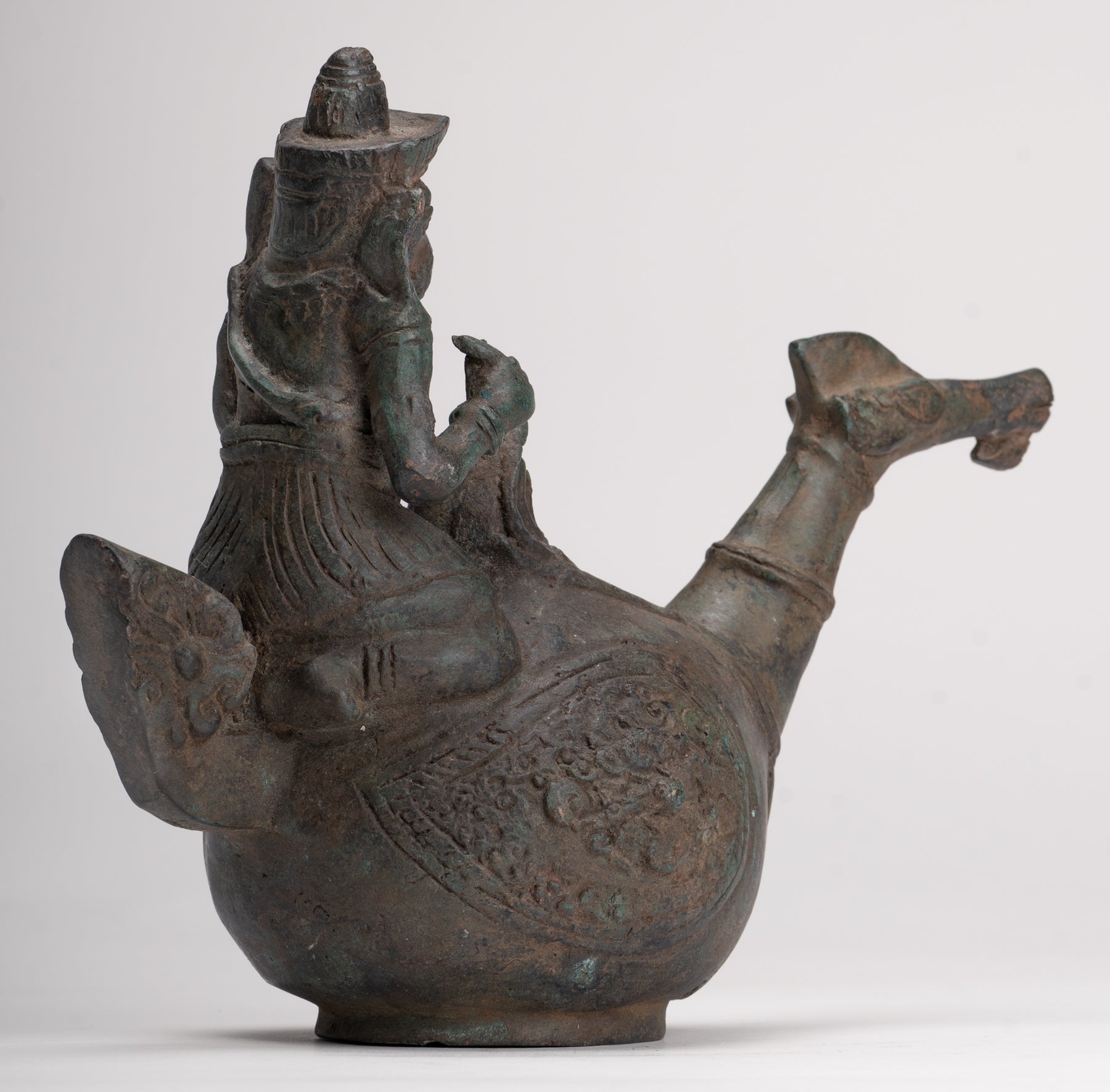 Diese außergewöhnliche Bronzestatue bietet eine seltene und eindrucksvolle Darstellung – Ganesha reitend mythischer Dracheund vereint göttlichen Intellekt mit der rohen, ungezähmten Kraft dieser legendären Kreatur.