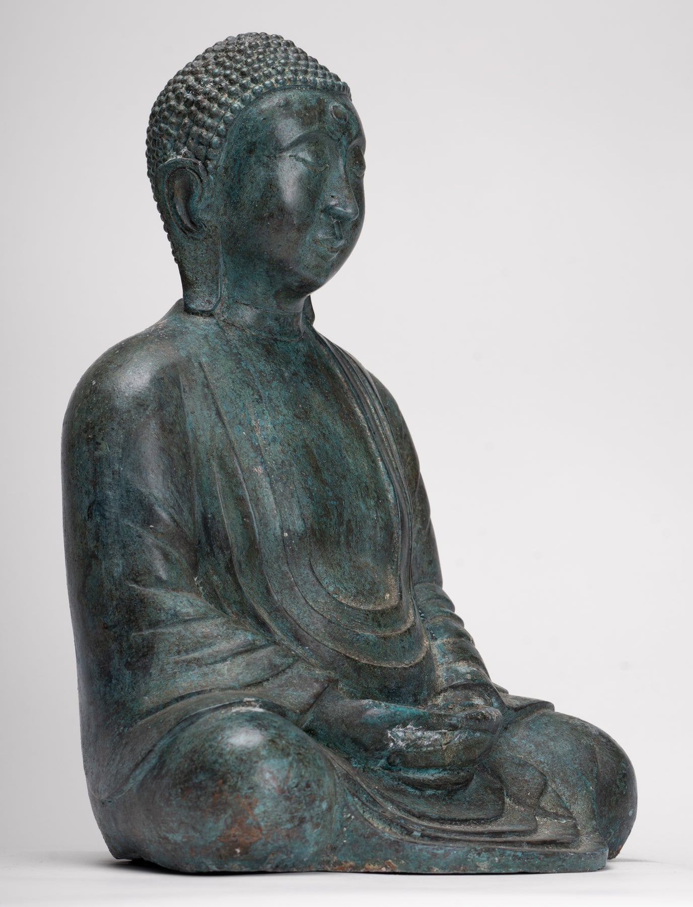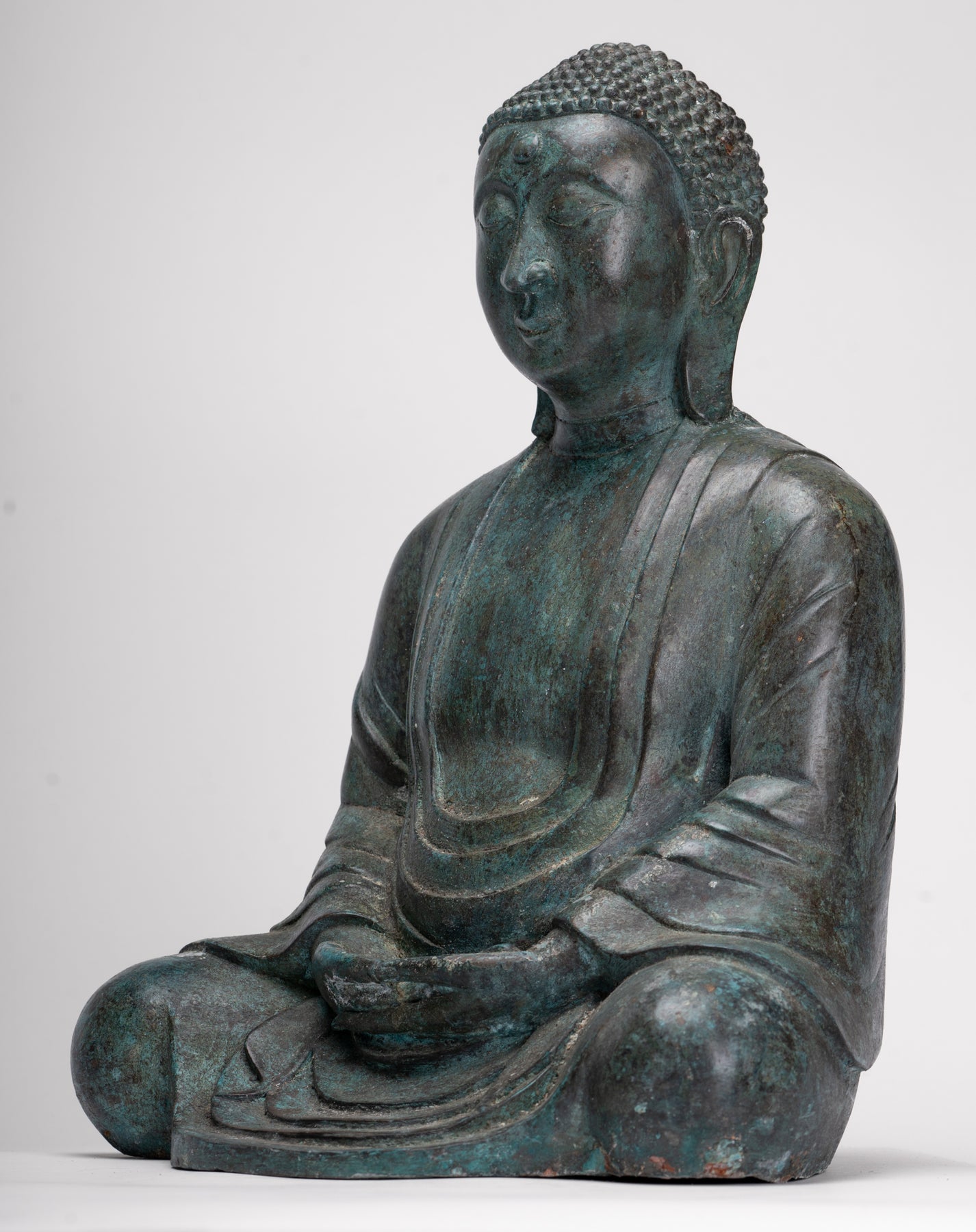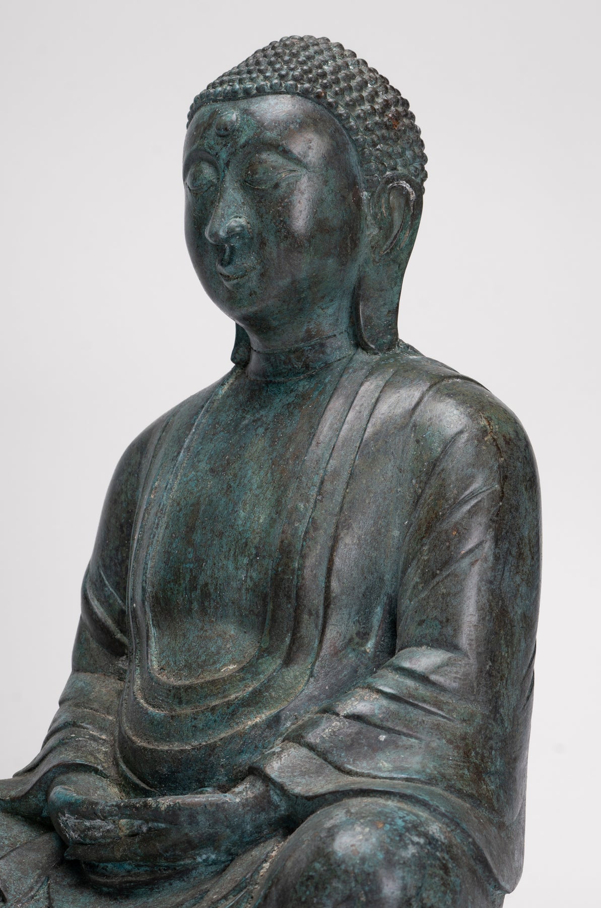 Wie es die traditionelle Ikonographie vorschreibt, wird der Buddha darin sitzend dargestellt Dhyana Mudra, auch bekannt als Meditation oder Samadhi Mudra. Beide Hände liegen anmutig in seinem Schoß, die rechte Hand liegt auf der linken Daumen berühren sich leicht ein perfektes Dreieck zu bilden – ein altes Symbol dafür Gleichgewicht, Konzentration und Einheit von Körper, Geist und Seele. Sein Rücken ist aufrecht, seine Schultern sanft nach hinten gezogen und sein Blick sanft gesenkt, was die zeitlose Haltung eines Menschen einfängt, der in tiefe Kontemplation versunken ist.