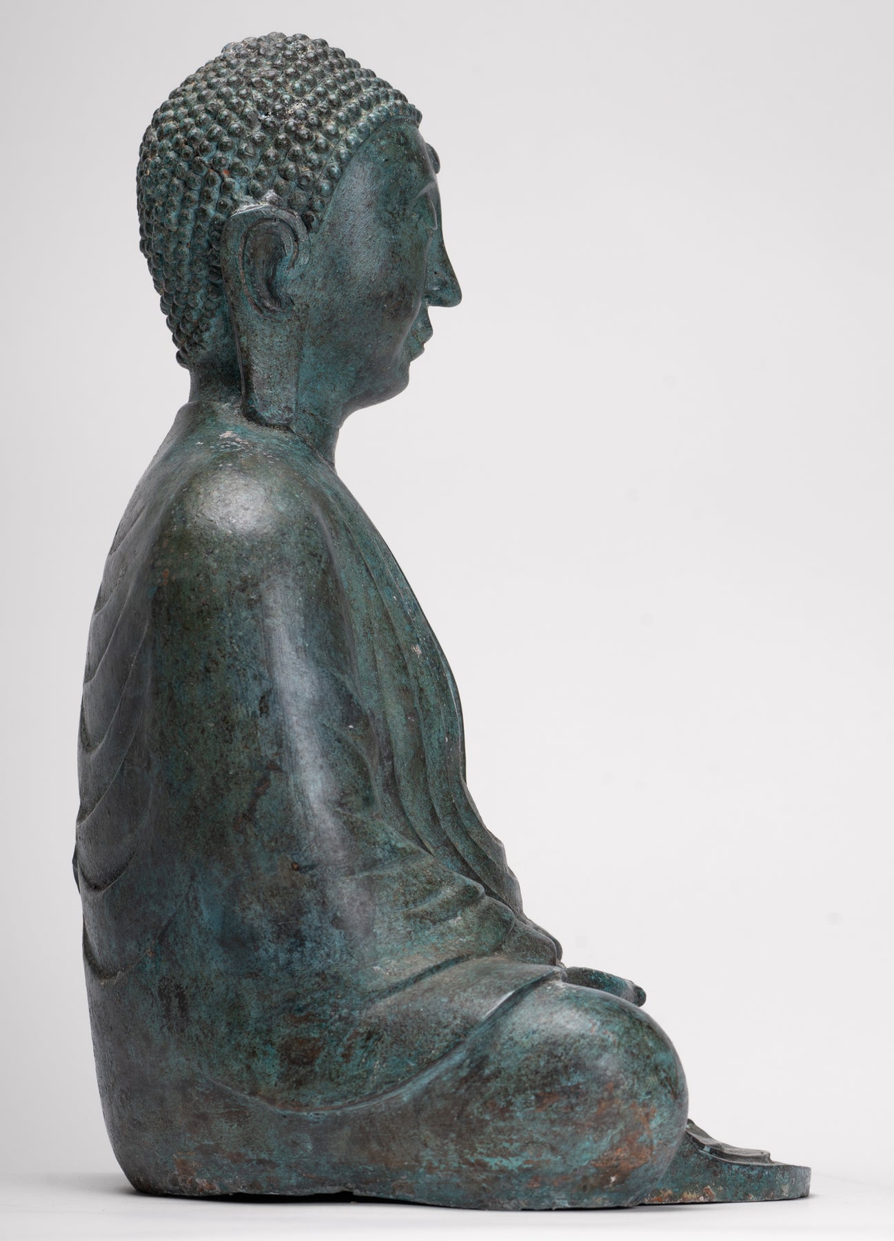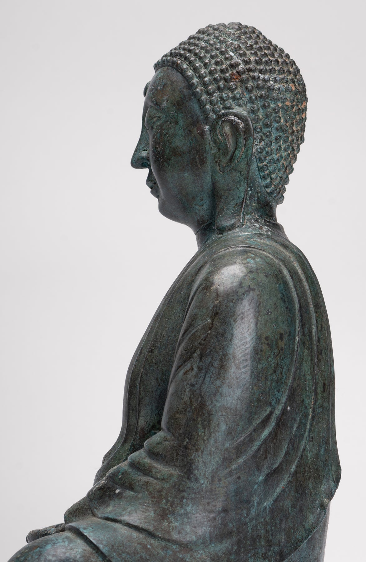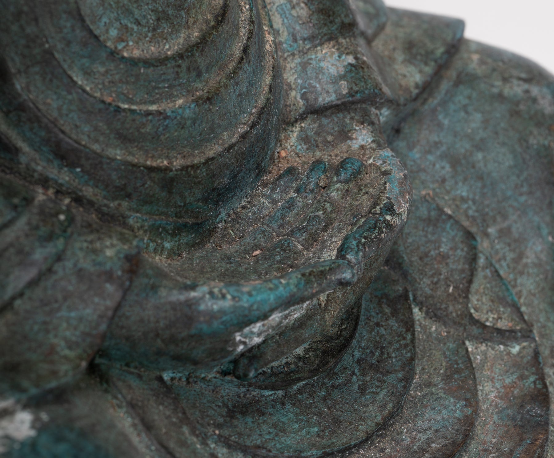 Wie es die traditionelle Ikonographie vorschreibt, wird der Buddha darin sitzend dargestellt Dhyana Mudra, auch bekannt als Meditation oder Samadhi Mudra. Beide Hände liegen anmutig in seinem Schoß, die rechte Hand liegt auf der linken Daumen berühren sich leicht ein perfektes Dreieck zu bilden – ein altes Symbol dafür Gleichgewicht, Konzentration und Einheit von Körper, Geist und Seele. Sein Rücken ist aufrecht, seine Schultern sanft nach hinten gezogen und sein Blick sanft gesenkt, was die zeitlose Haltung eines Menschen einfängt, der in tiefe Kontemplation versunken ist.