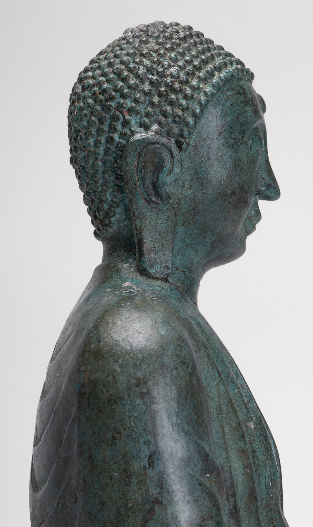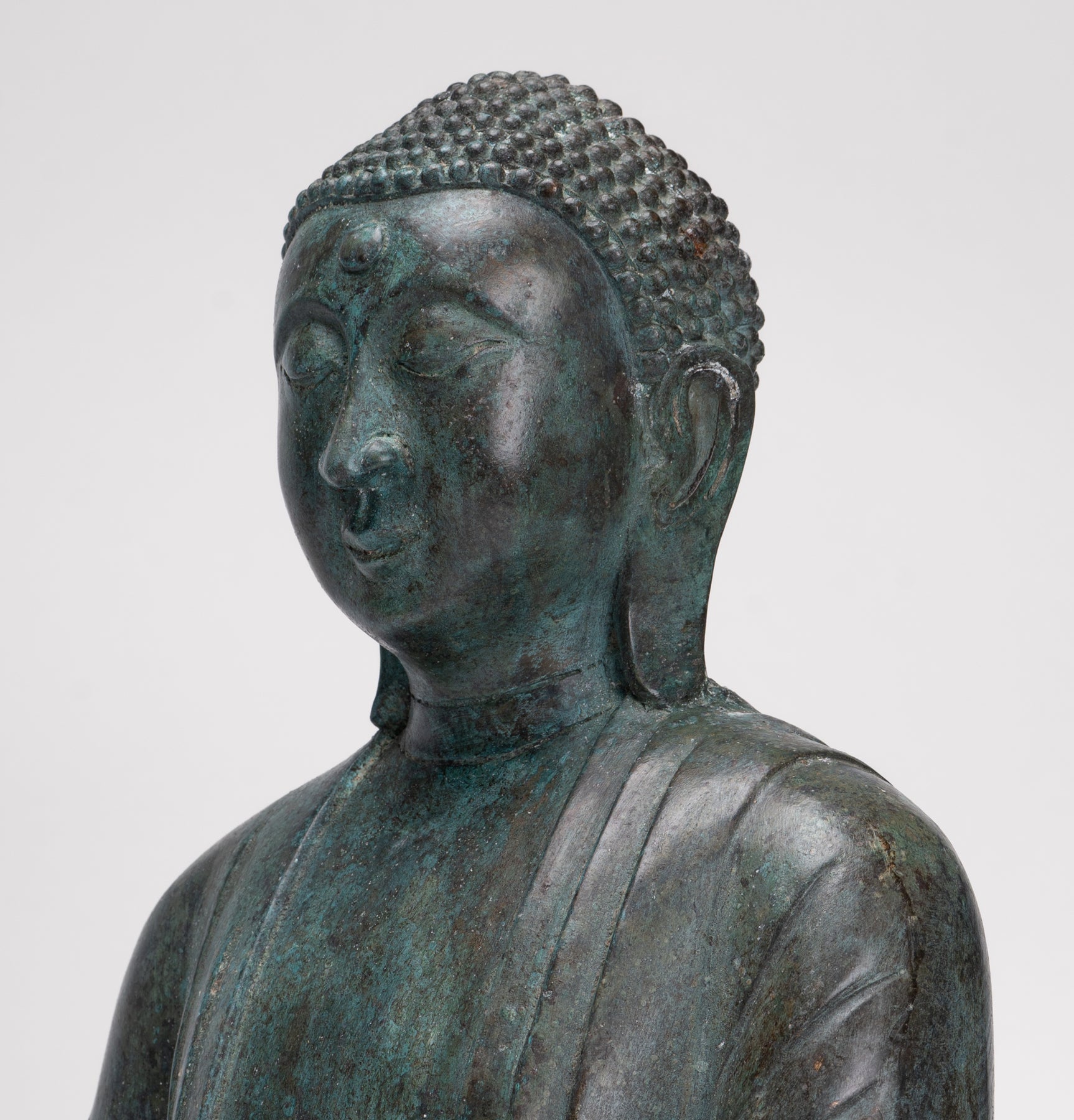 Die Gesichtsausdruck Dieser Buddha ist bemerkenswert sanft und introspektiv halbgeschlossene Augen vermittelt meditative Ruhe und Erleuchtung. Ein schwaches Lächeln mildert seine Gesichtszüge, während ein langes, verlängerte Ohrläppchen Erinnern Sie sich an seine fürstliche Herkunft und seinen Verzicht auf das weltliche Leben. Die urnaDas zart auf der Stirn platzierte dritte Auge symbolisiert transzendentale Einsicht – die Fähigkeit des Buddha, über die materielle Welt des Leidens hinauszuschauen.