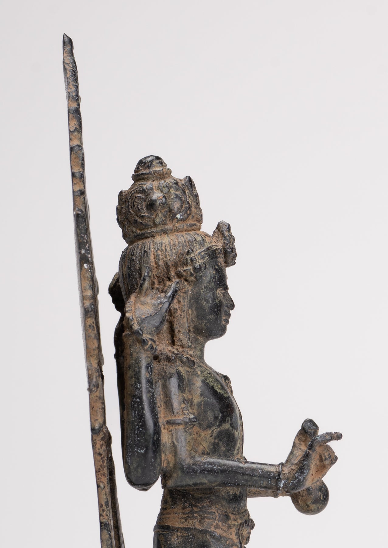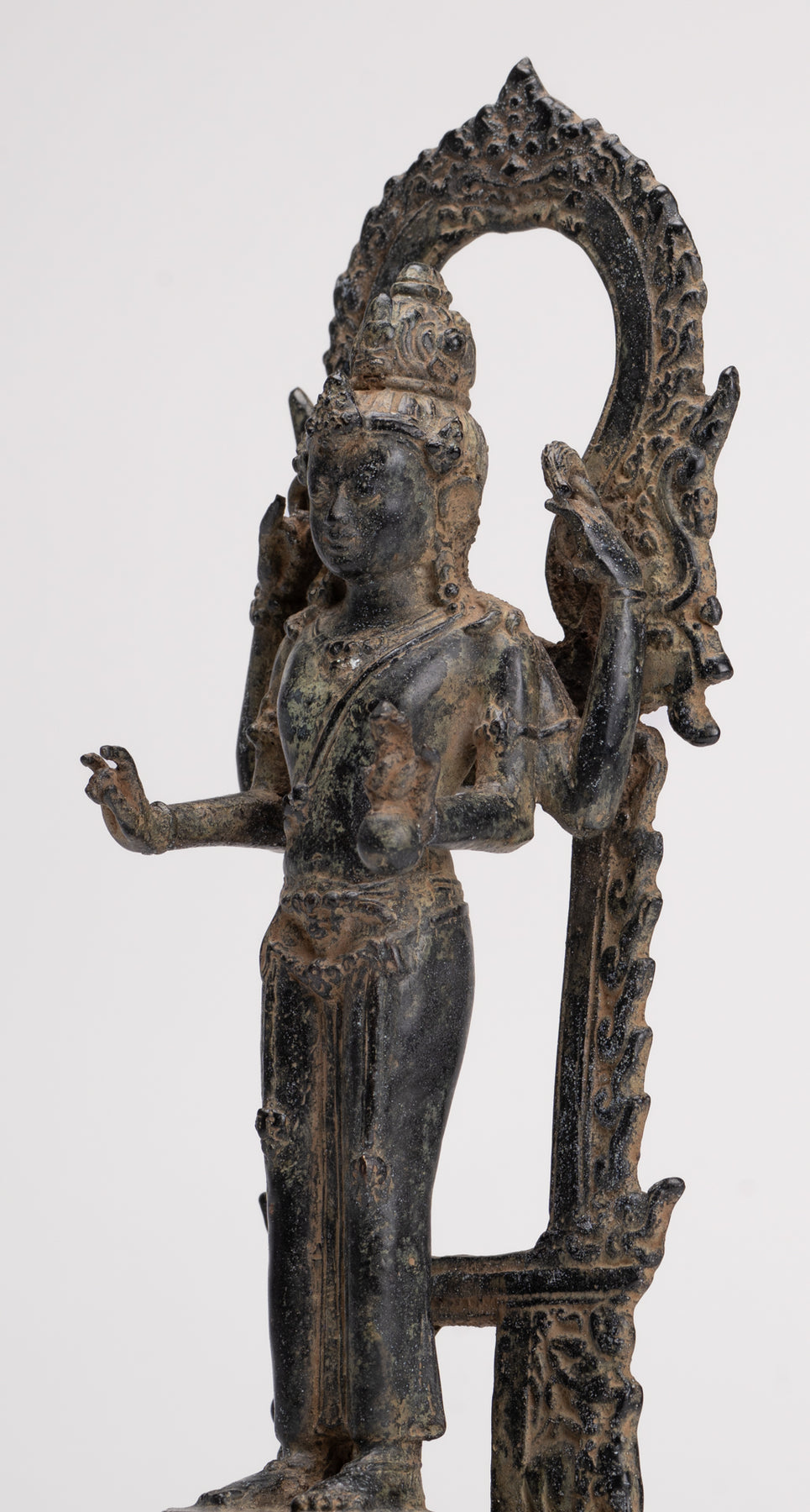 Eine antike Vishnu-Bronzeskulptur im Java-Stil im Majapahit-Stil aus dem 13. Jahrhundert. Vishnu ist sowohl der Weltbeschützer als auch der Bewahrer, der Wiederhersteller der moralischen Ordnung – er ist von Natur aus allmächtig und alles durchdringend.