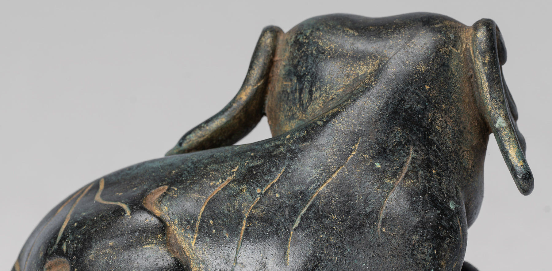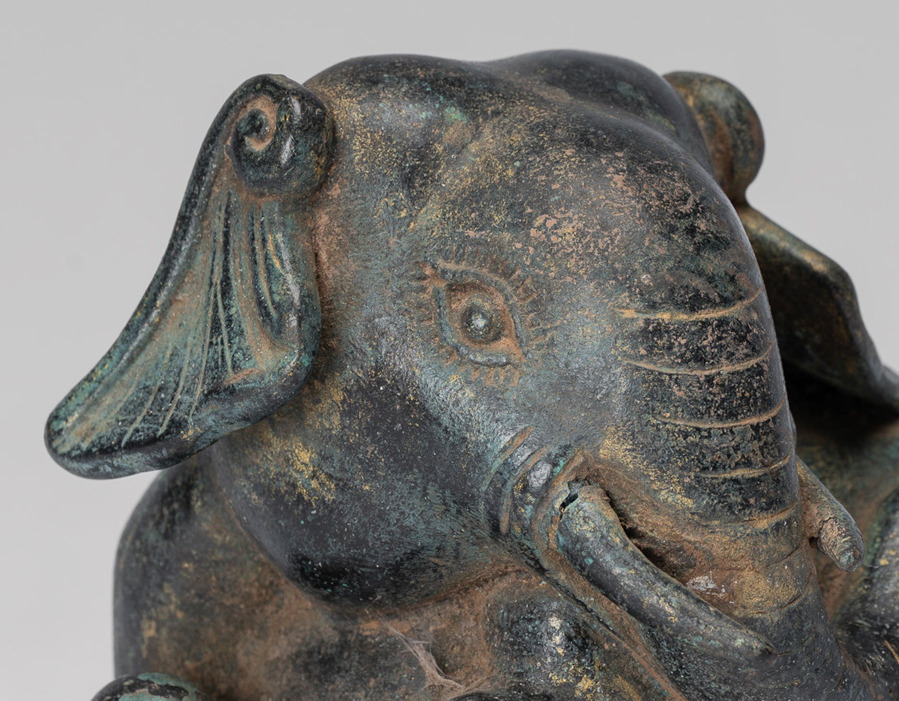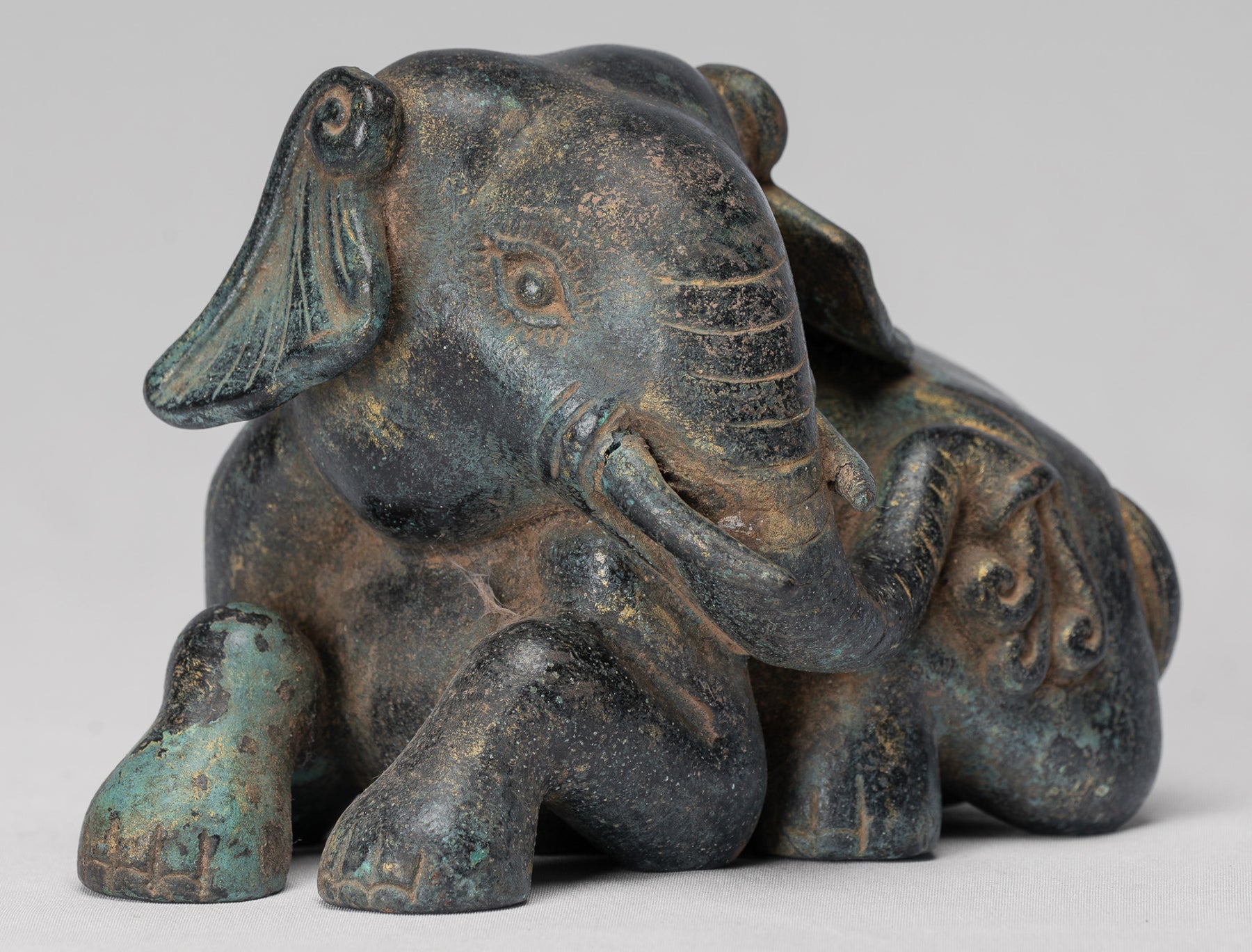 Eine antike Bronze -Elefantenstatue im Khmer -Stil. Der Elefant ist zu sehen, der sich niederlegt und sich von einem langen, geschäftigen und doch (möglicherweise!) Produktiven Tag ruht.