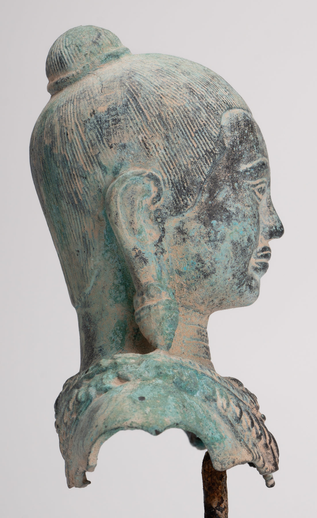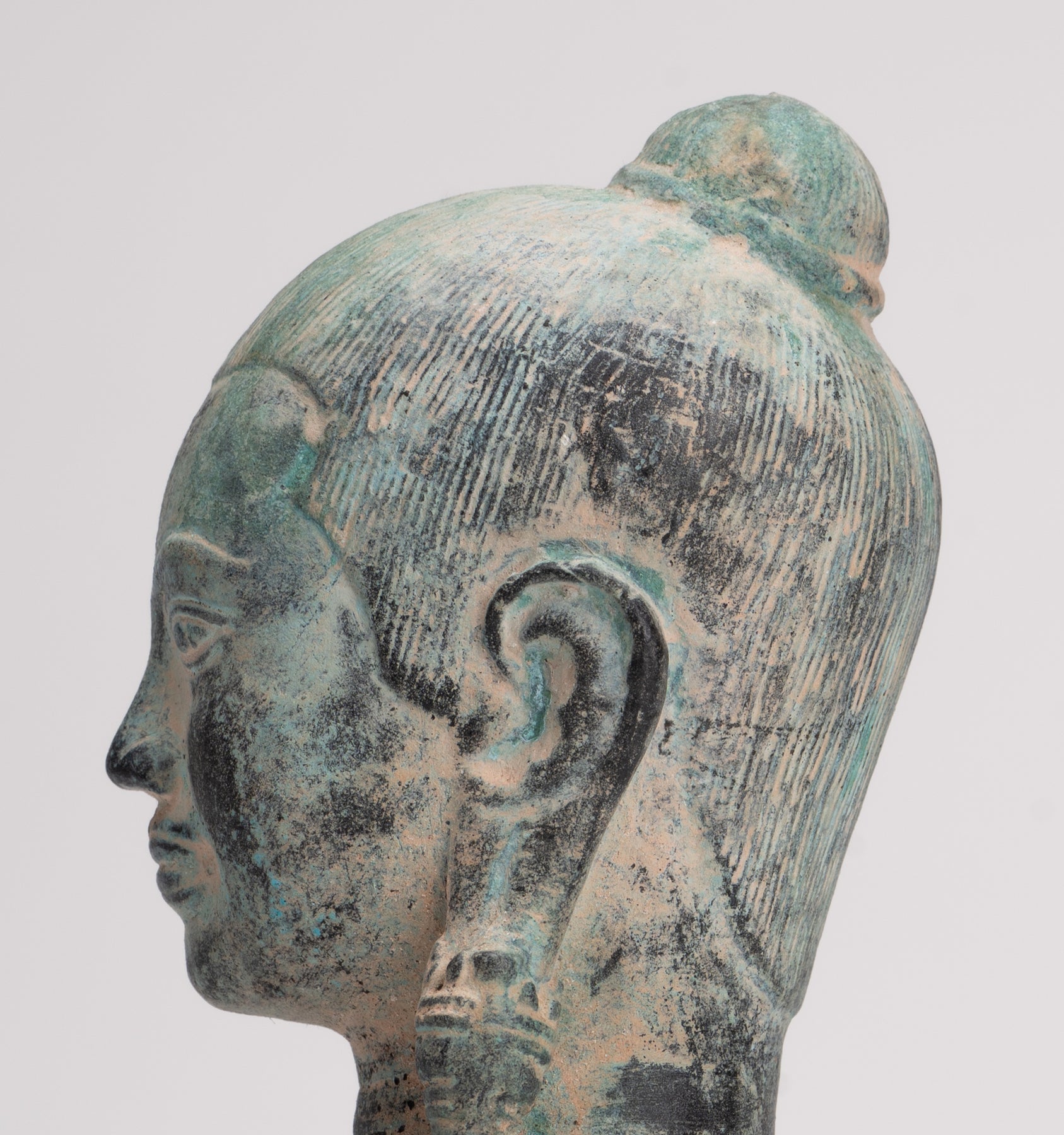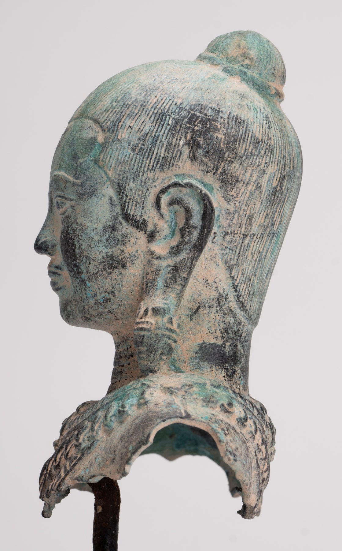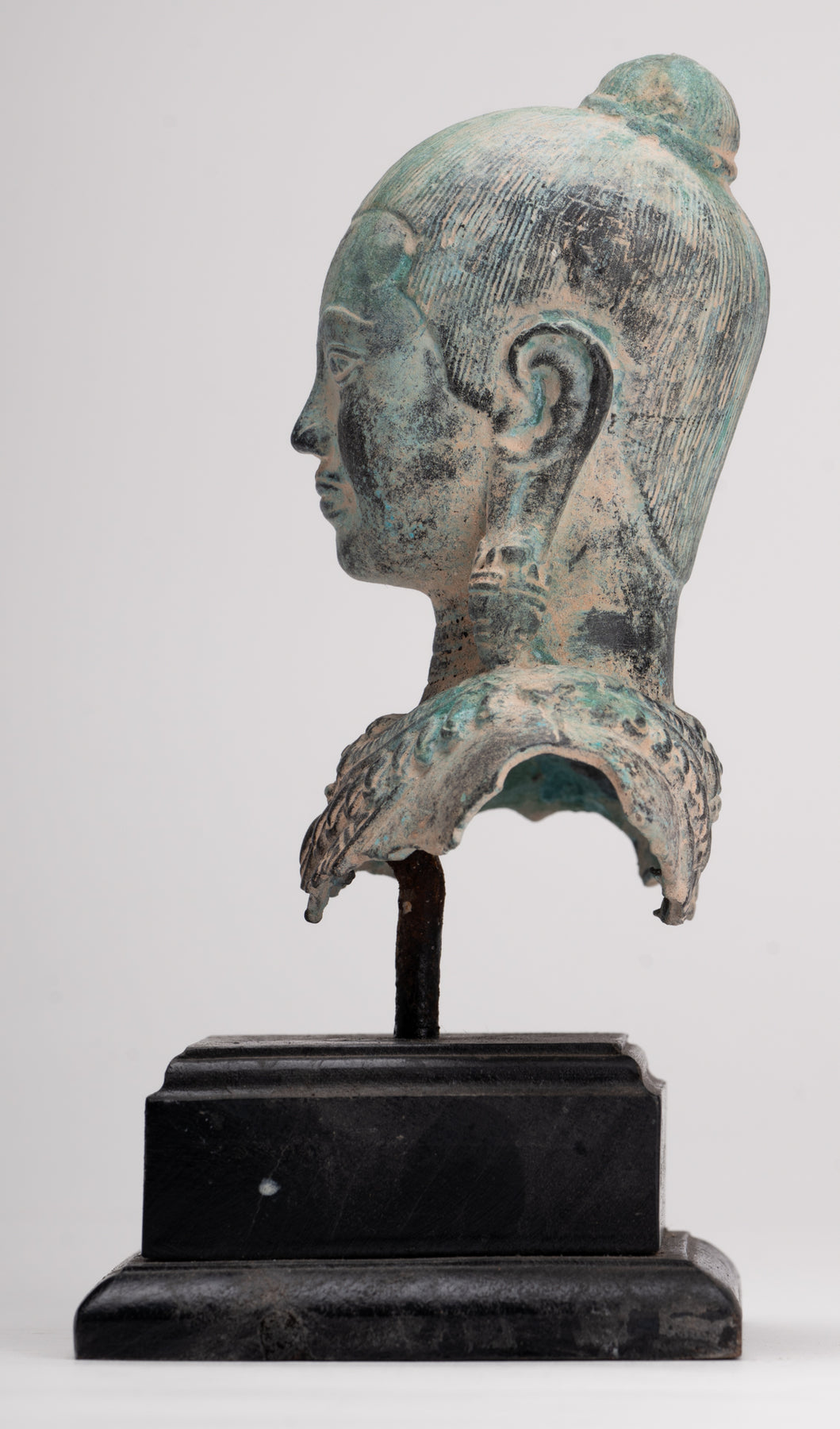 Der Guss dieses Stücks ist wunderschön, wie Sie an den feinen Details des Gesichts erkennen können. Jedes Detail ist perfekt wiedergegeben. Besonders reizvoll ist auch die charakteristische Patina des Stückes.