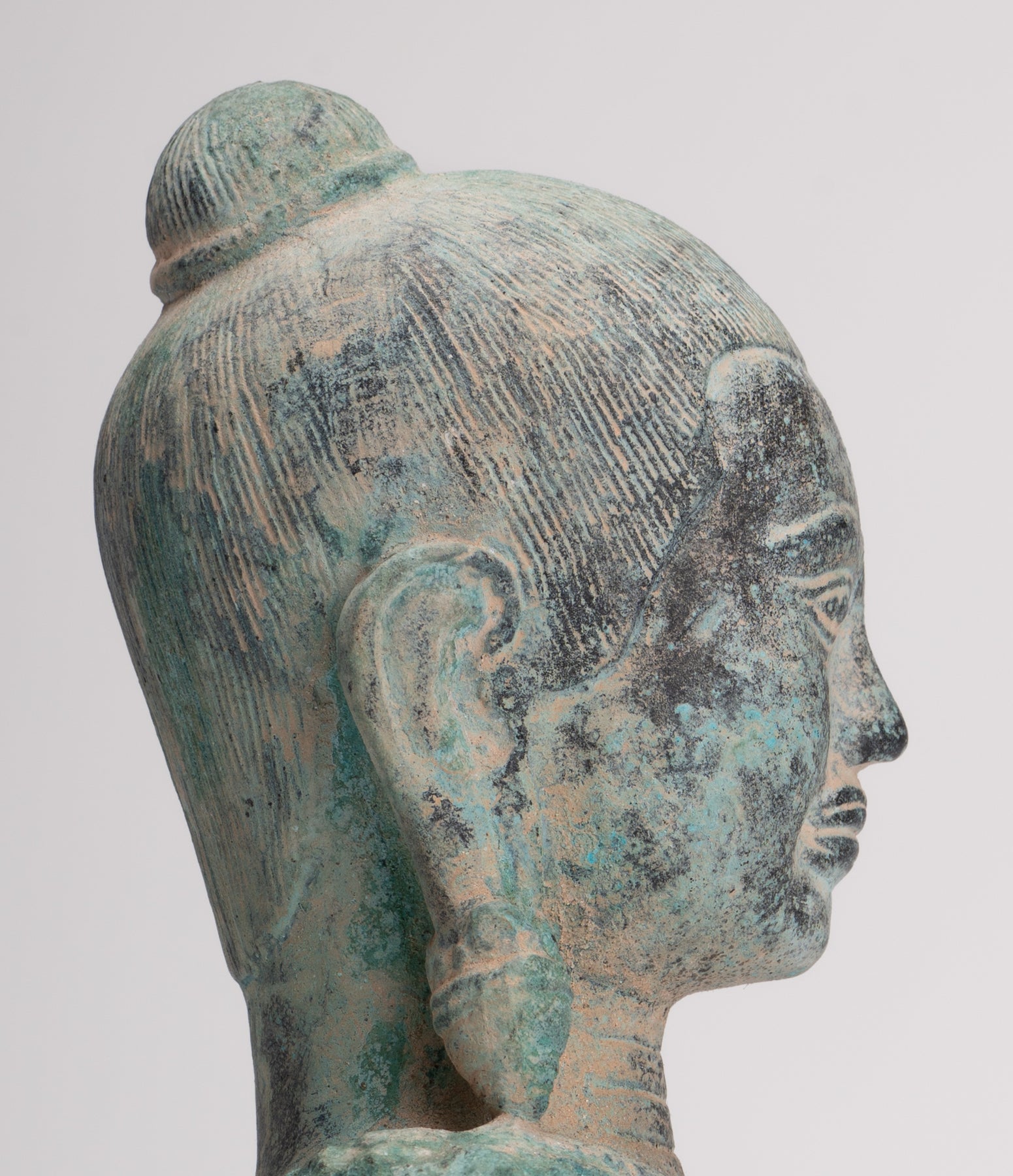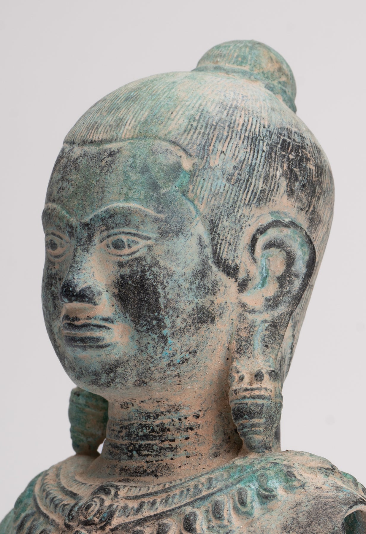 Diese Statue von König Jayavarman VII. weist keinerlei königliche oder göttliche Eigenschaften auf und stellt einen Mann in nachdenklicher Meditation dar. Wie es traditionell ist, werden seine Haare zurückgebunden und zu einem kleinen Dutt wie einem Chignon zusammengebunden. Sein Gesichtsausdruck wird durch weit geöffnete Augen, ein leichtes Lächeln, eine große Stirn, Lippen, die weder dünn noch dick sind, und lange Ohrläppchen betont.