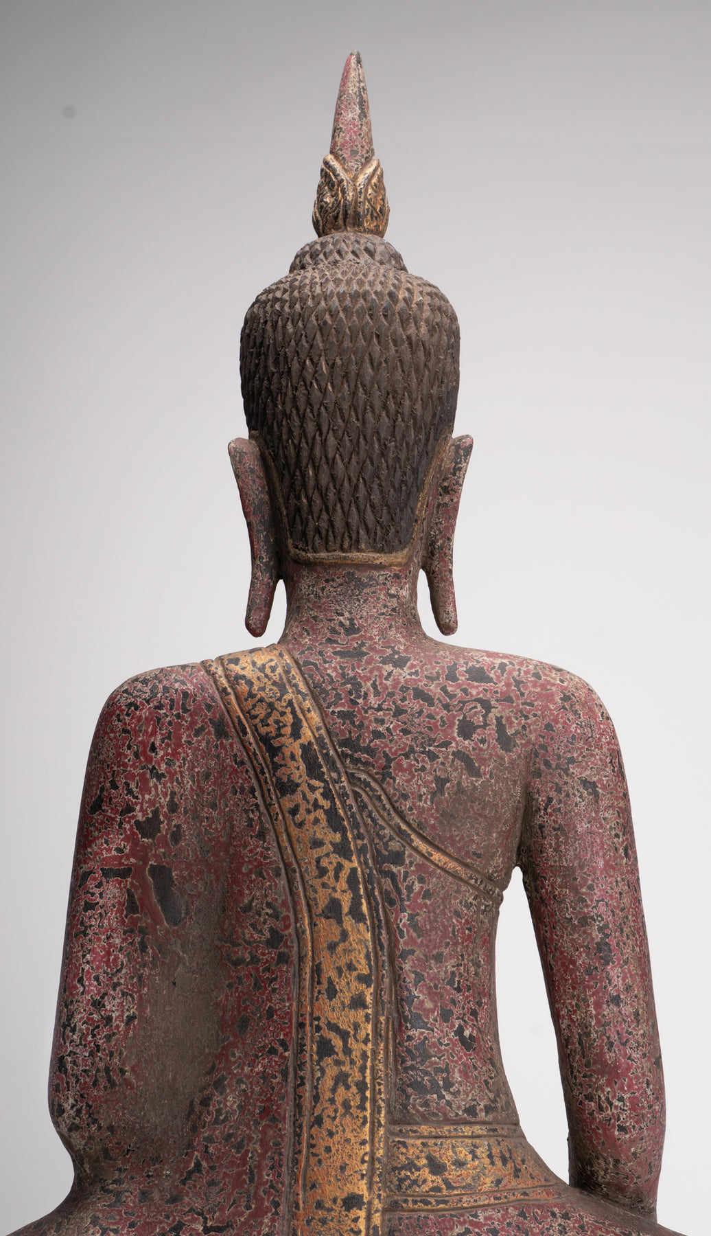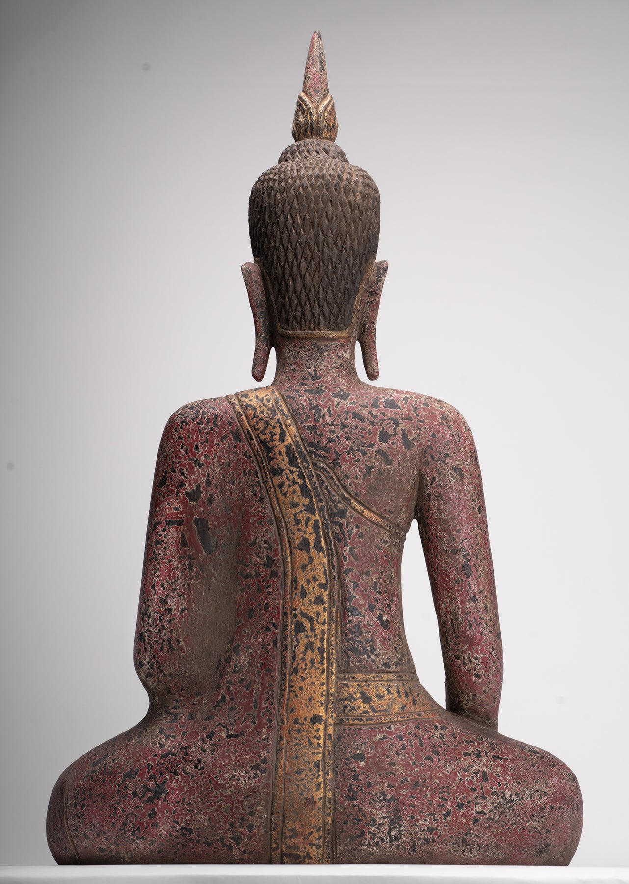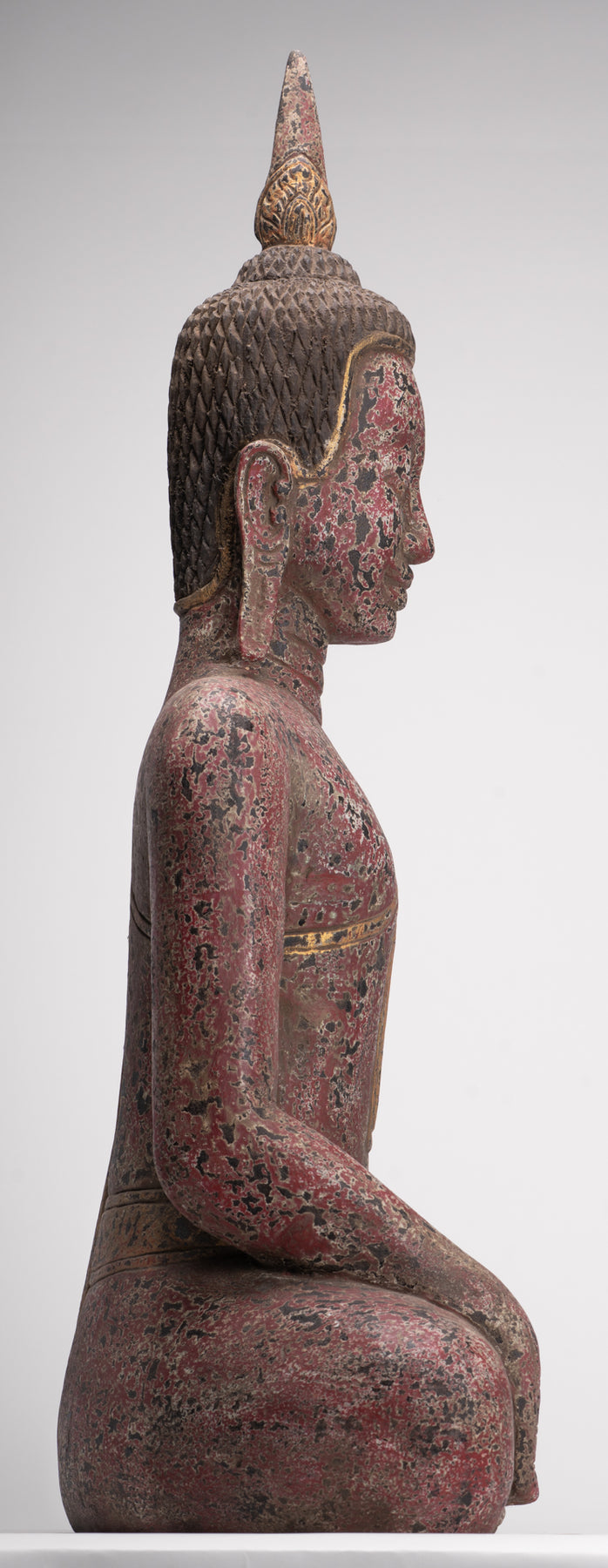 Er sitzt im halben Lotussitz und hat auf seinem Kopf einen großen, lotusblütenförmigen Ushnisha-Vorsprung, der sein hohes Maß an spiritueller Entwicklung symbolisiert.