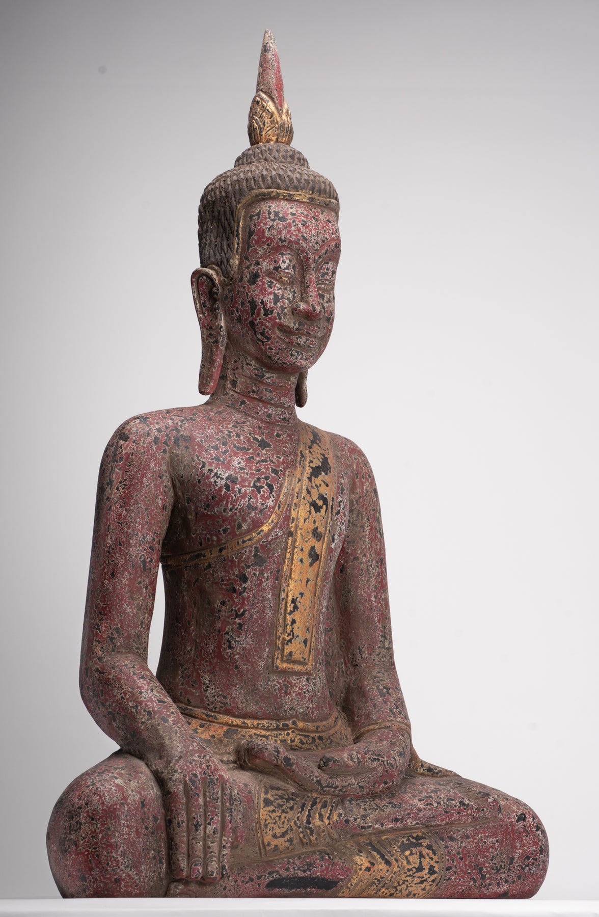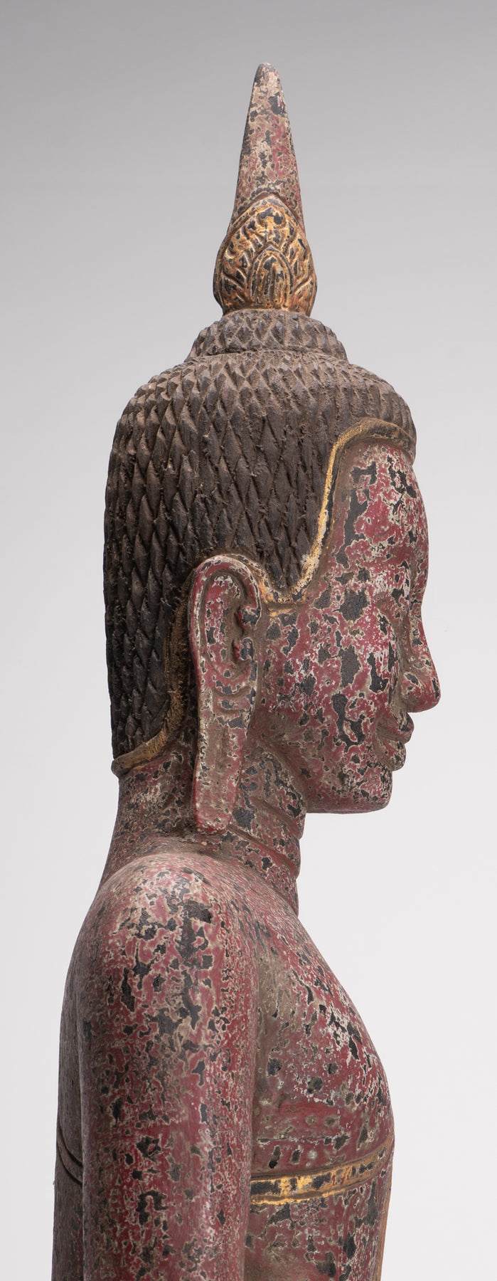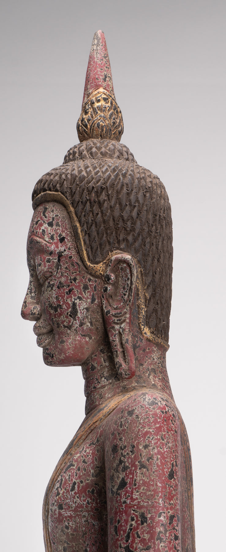 Der Buddha hat ein friedliches Gesicht mit gesenktem, nachdenklichem Blick und einer festen Stirn. Seine Ohrläppchen sind langgestreckt, weil er als Prinz schwere goldene Ohrringe trug.