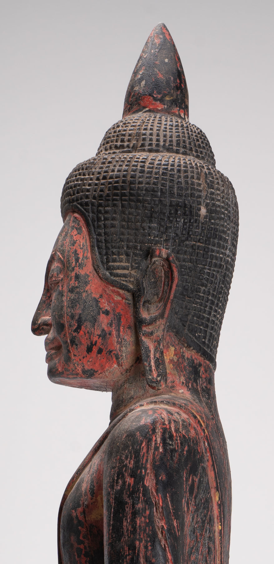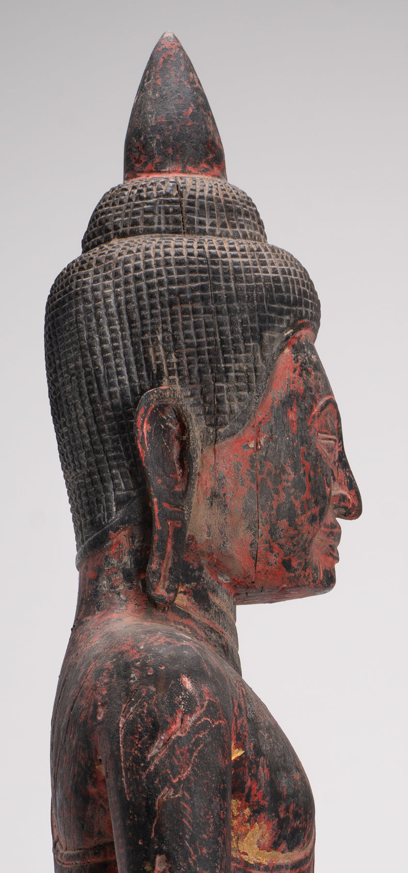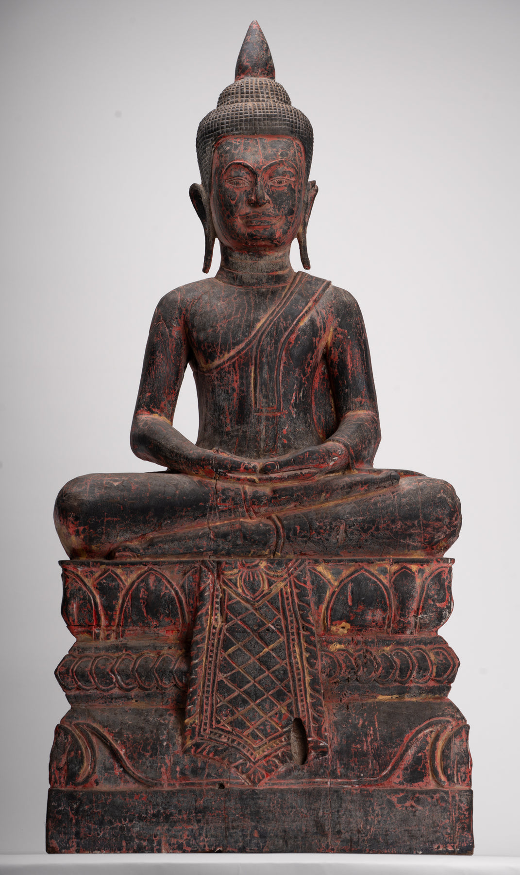 Antike sitzende Meditations-Buddha-Statue aus Holz im südöstlichen Khmer-Stil – 85 cm.