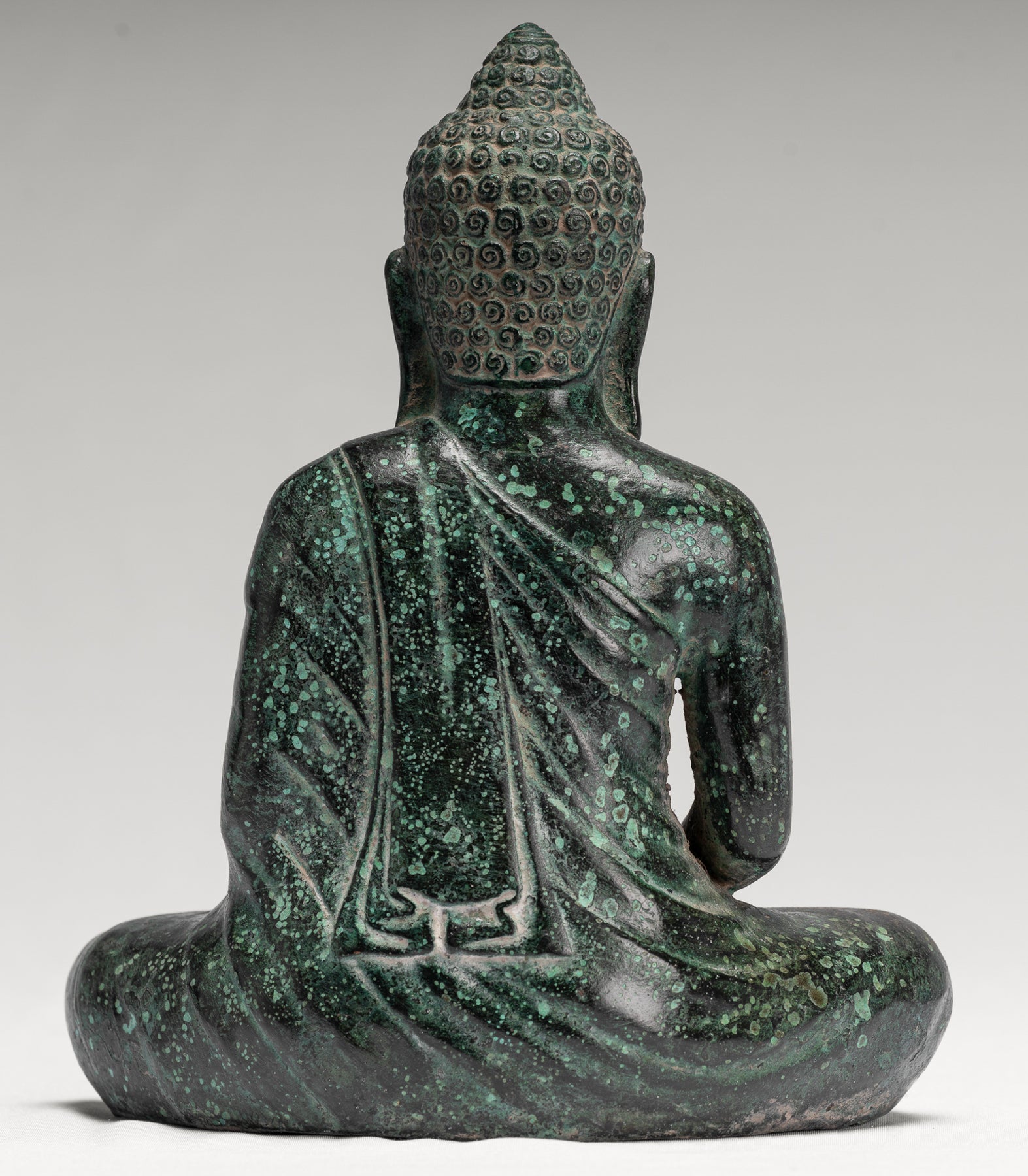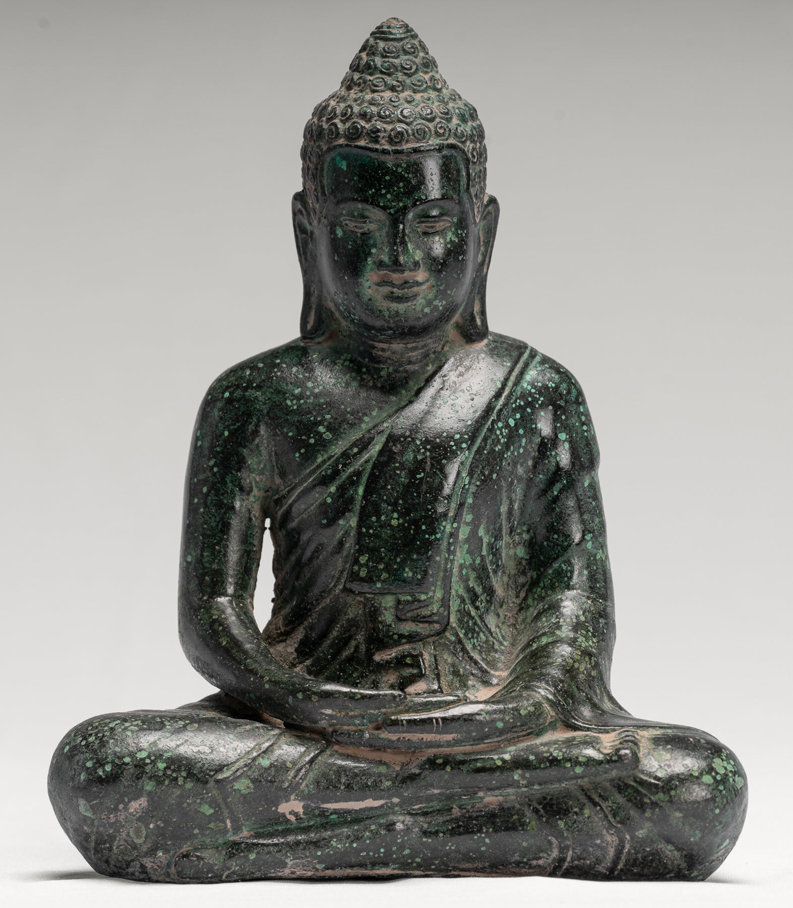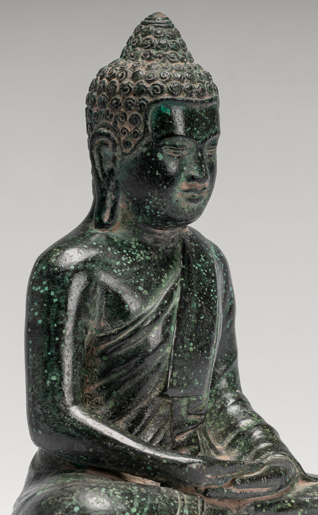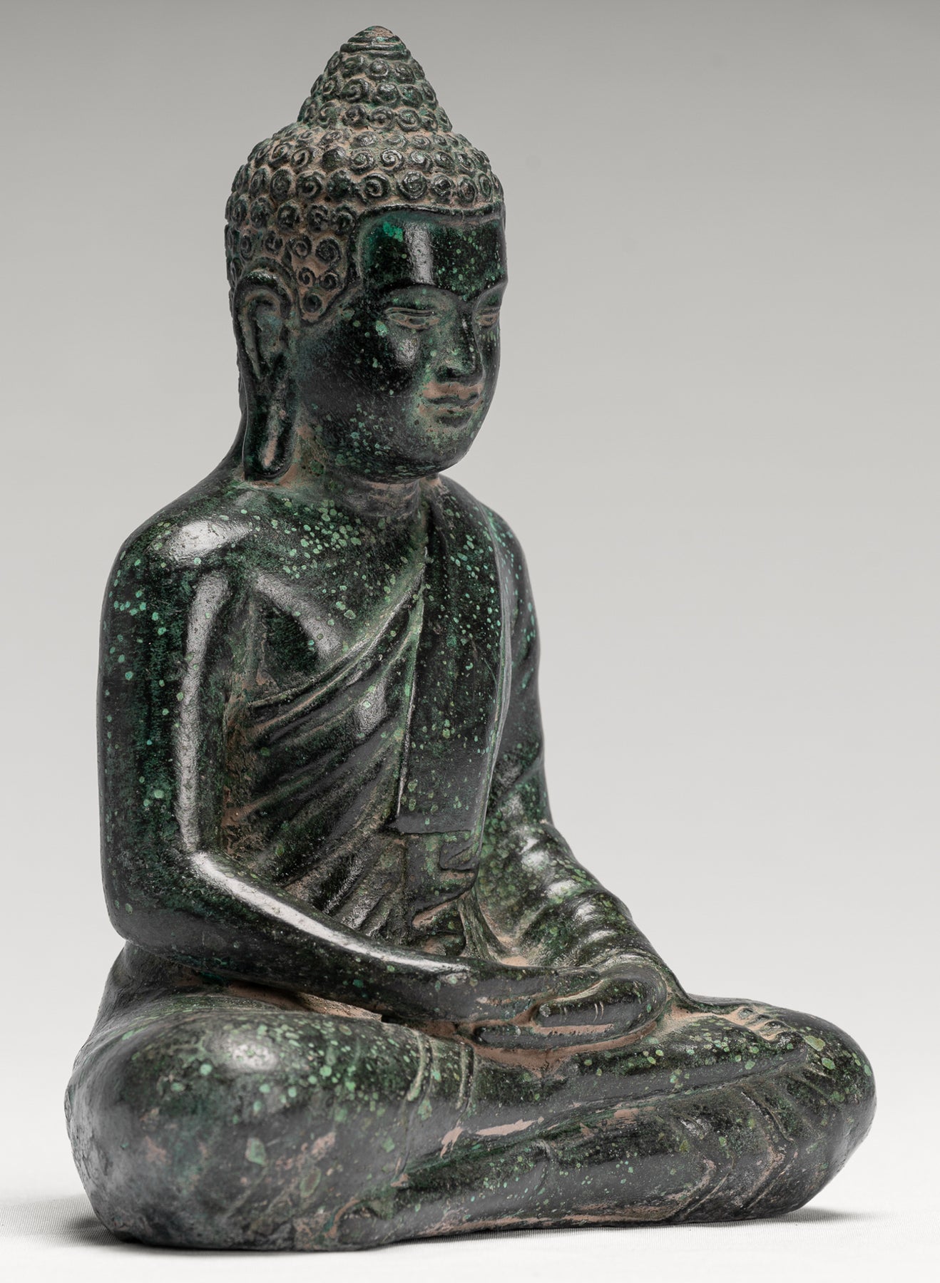 Antike sitzende Bronze-Buddha-Statue im Khmer-Stil, Meditations-Mudra, 19 cm.