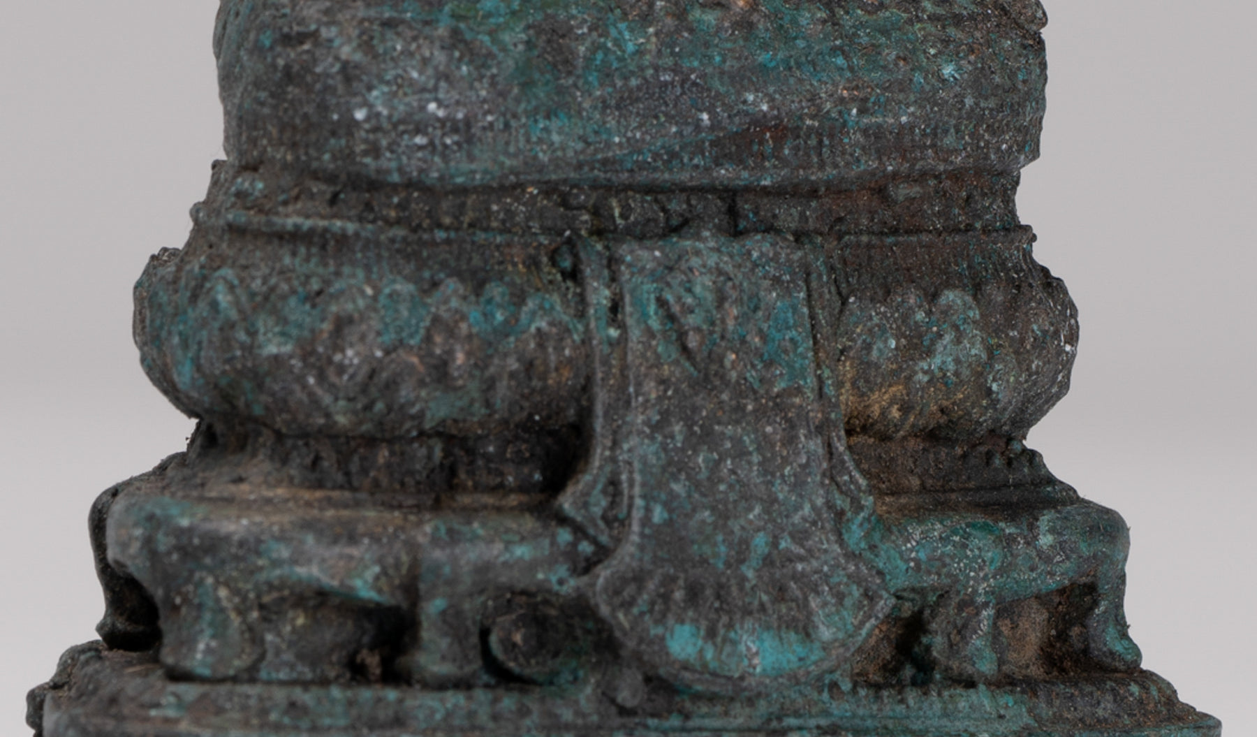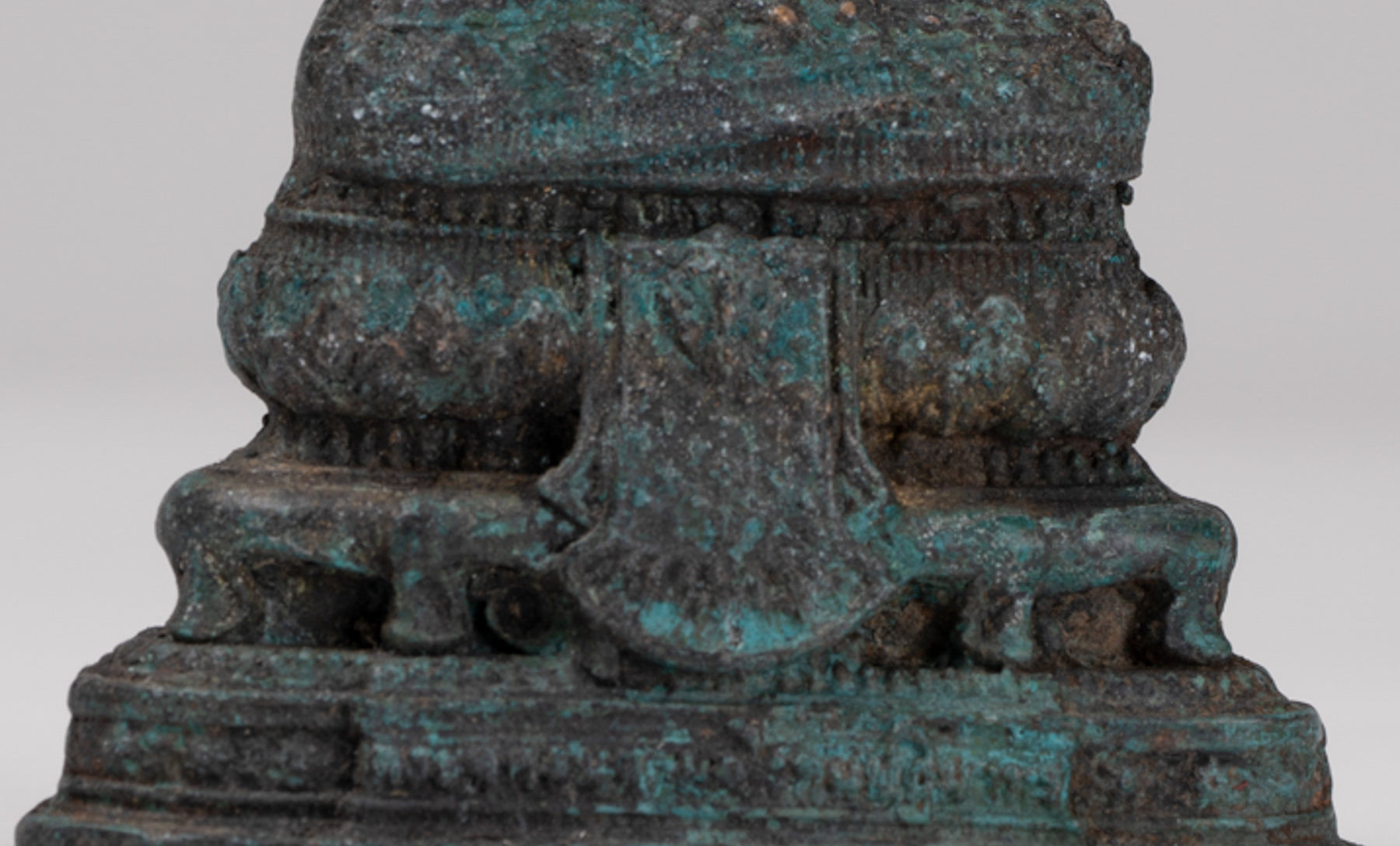 Der Buddha sitzt auf einem dekorierten Lotusblatt -Sockel in der Dhyana Mudra oder der „Meditationsposition“. Diese Handgeste fördert die Energie der Meditation, die tiefe Kontemplation und die Einheit mit höherer Energie.