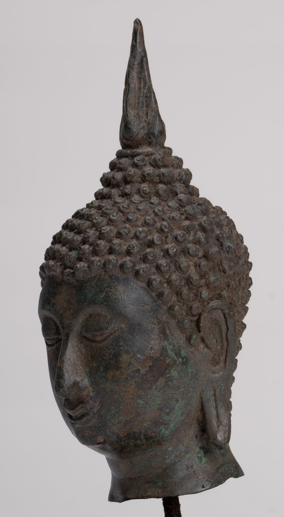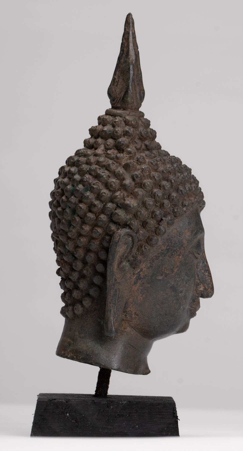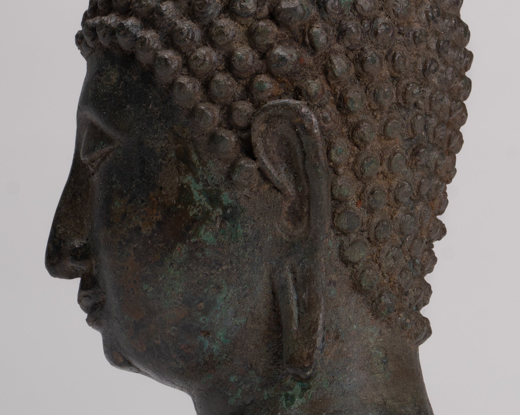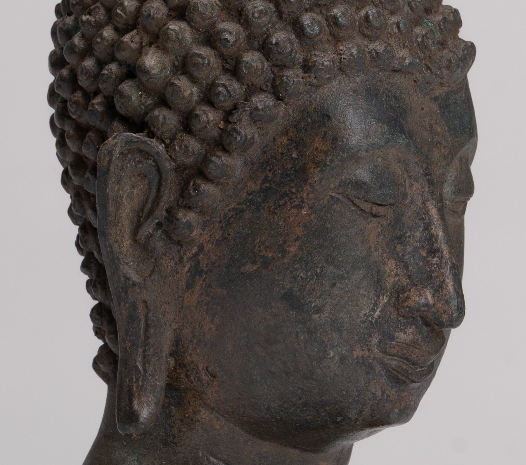 Buddha Kopf - Antike thailändische Sukhothai -Bronze -Buddha -Kopf - 22 cm/9 "