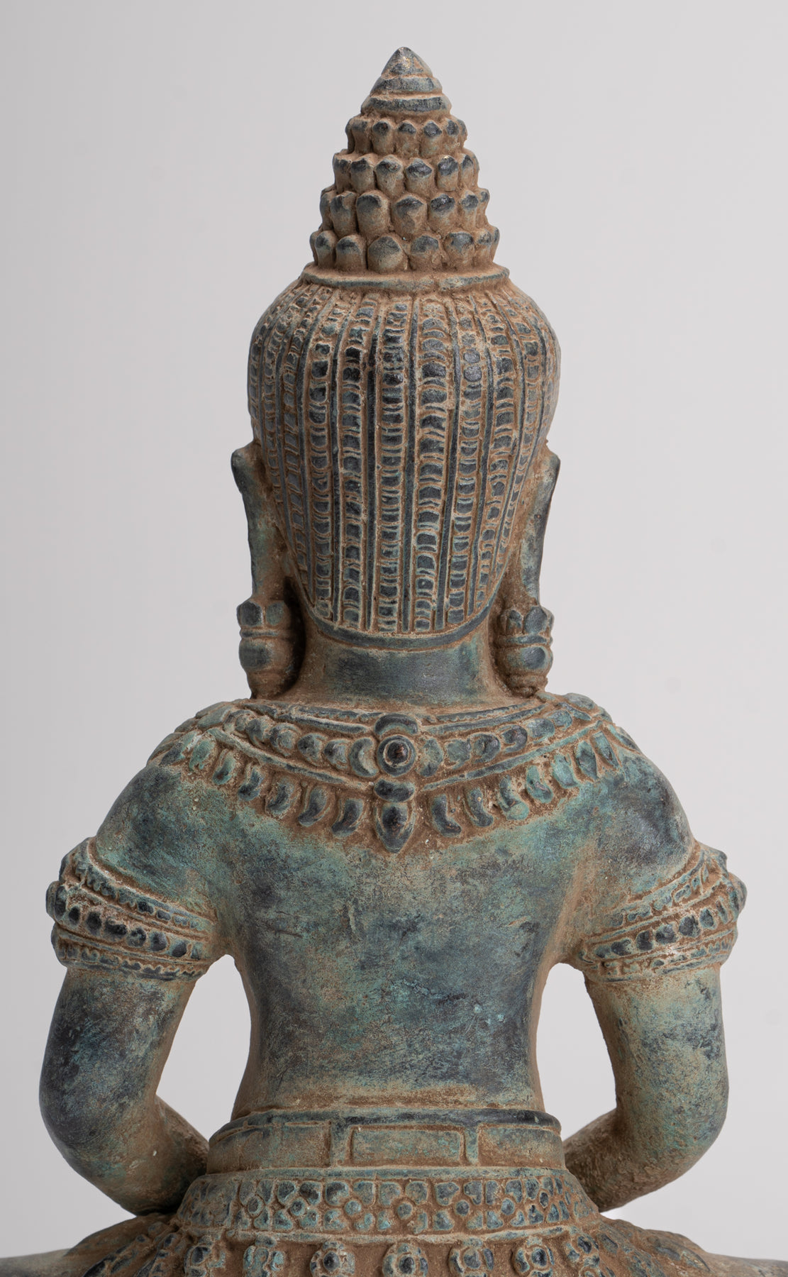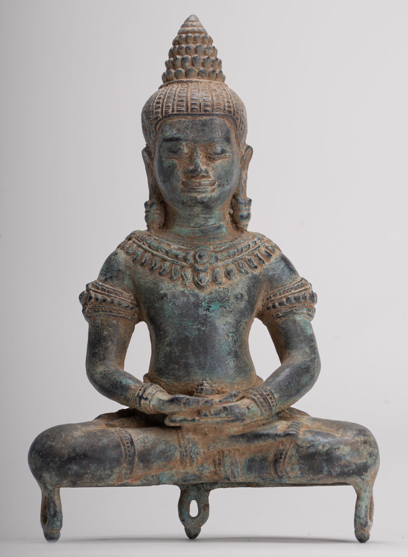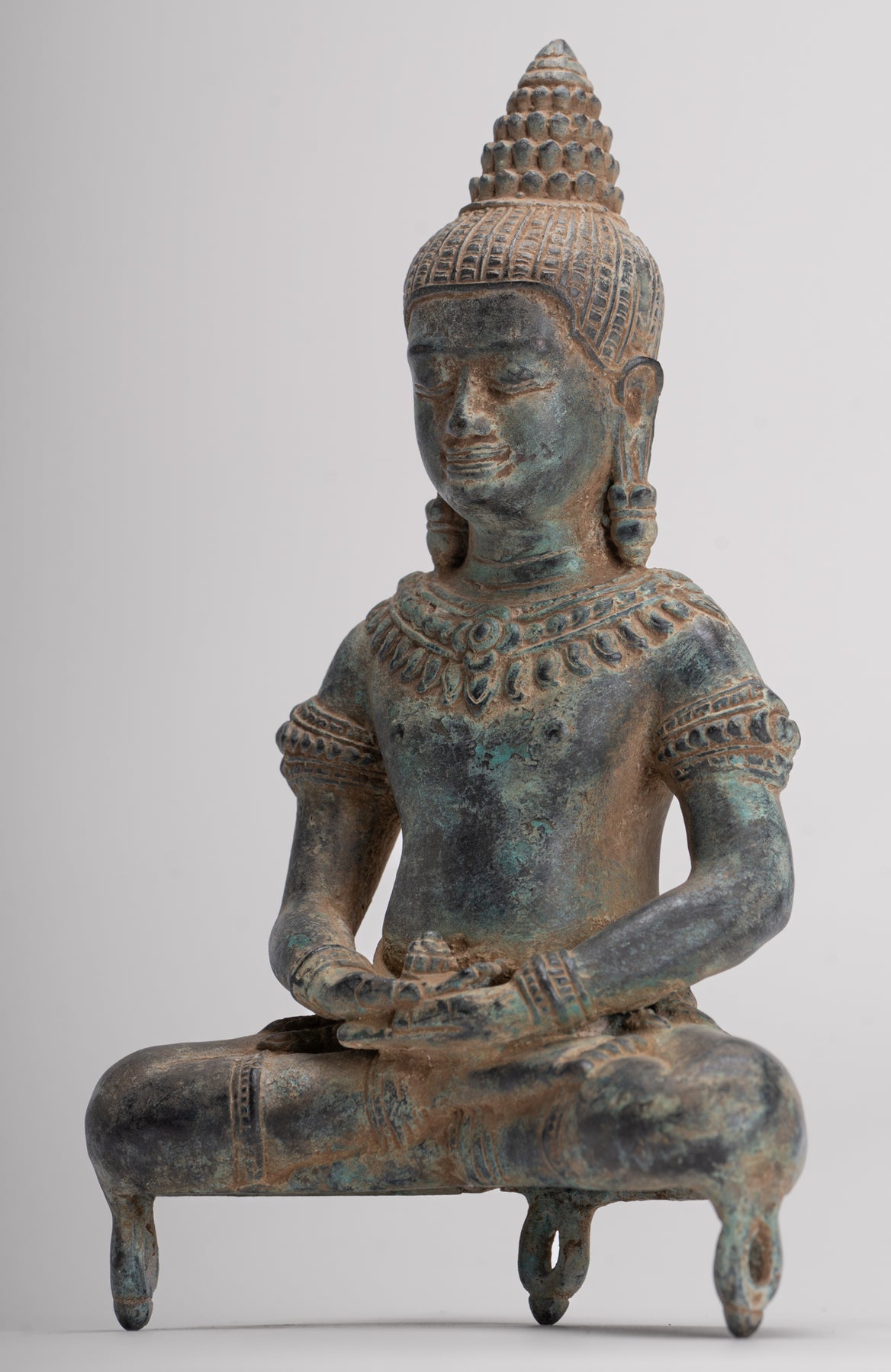 Antike sitzende Meditations-Buddha-Statue aus Bronze im Khmer-Stil – 22 cm.