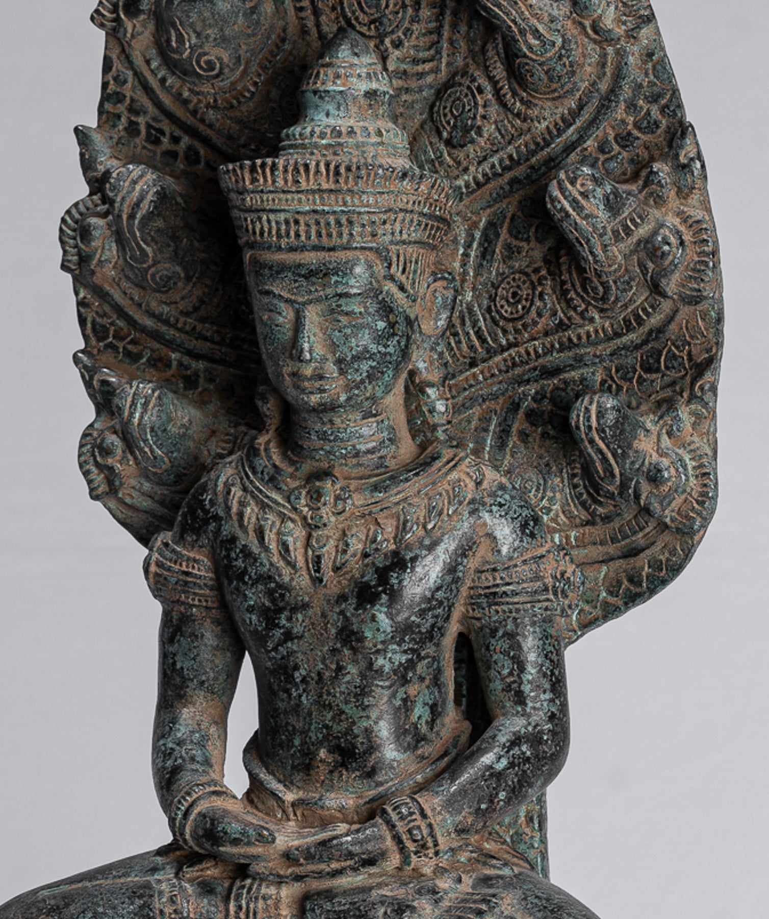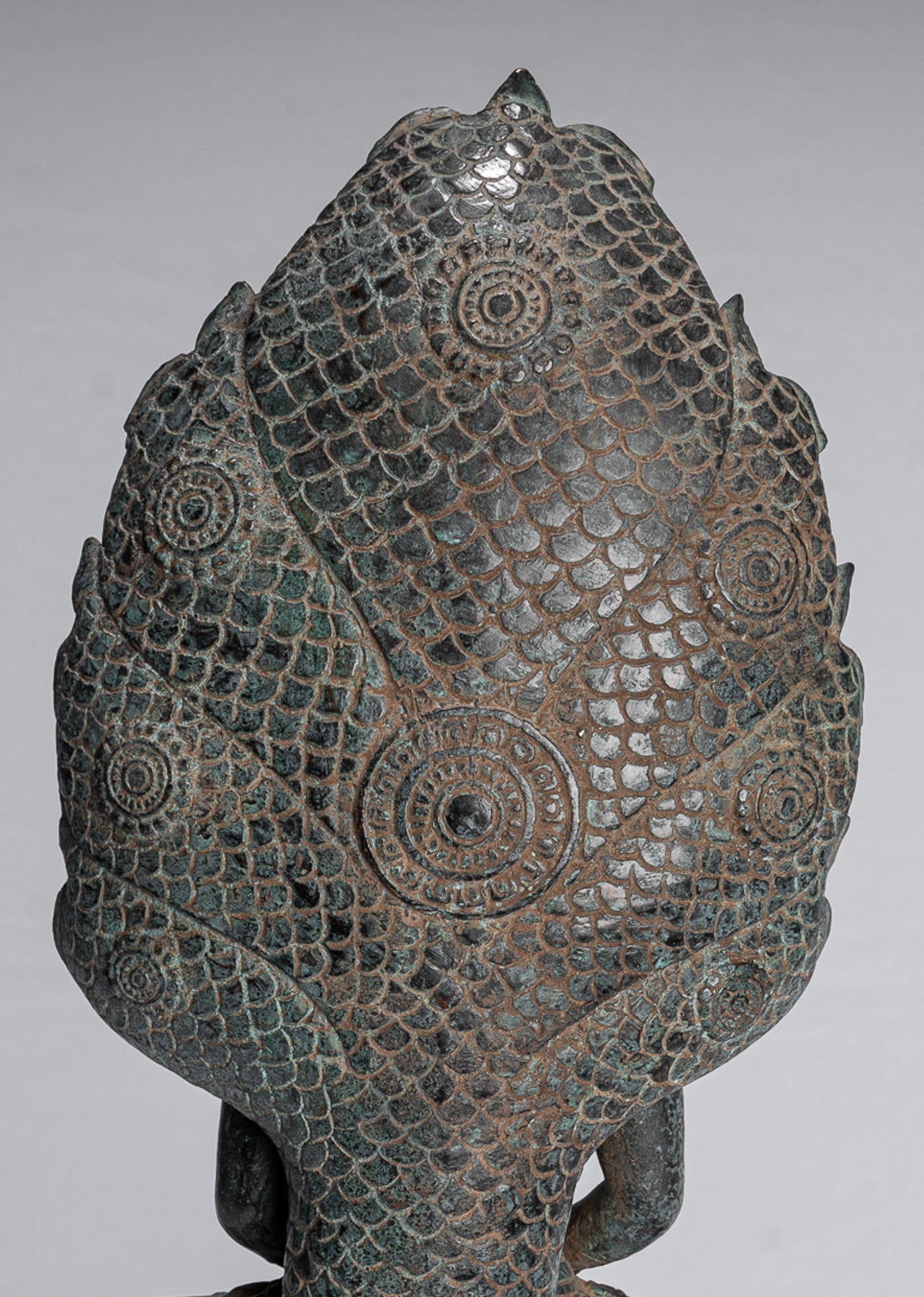 Antike sitzende Naga-Buddha-Statue aus Bronze im Khmer-Stil – 46 cm.