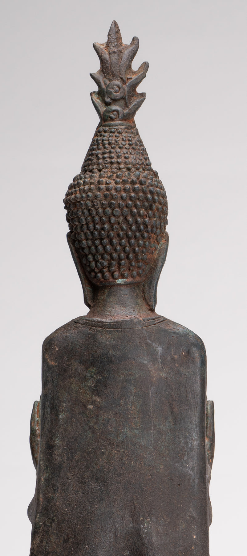 Gesichtsstruktur: Das Gesicht des Buddha ist langgestreckt und mit einem sanften, heiteren Lächeln versehen. Die Augenbrauen sind anmutig geschwungen und die Nase ist fein proportioniert, was zum Gesamtgefühl von Ruhe und Anmut beiträgt.