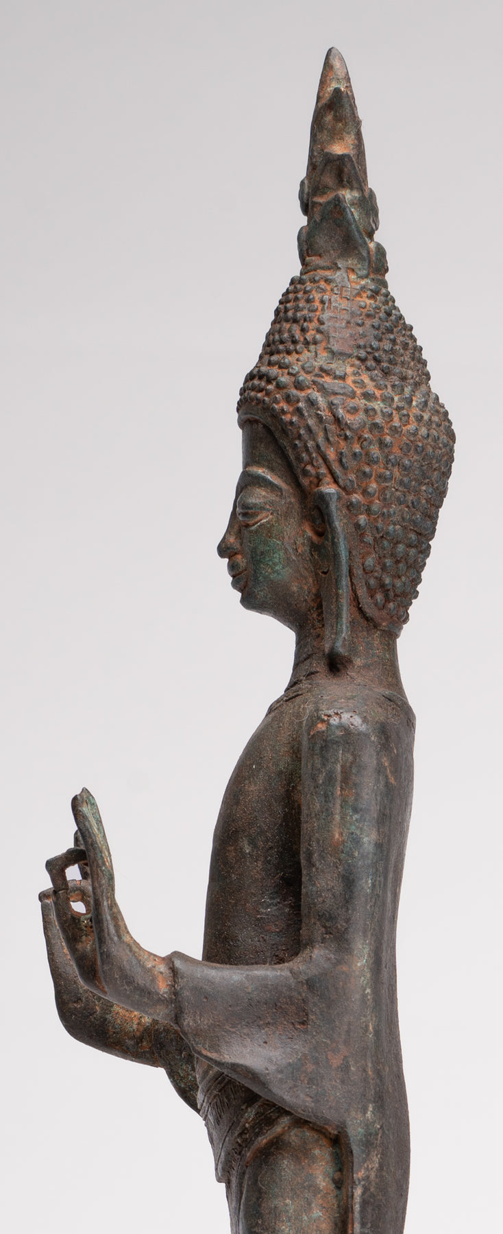 Körperproportionen: Der Körper des Laoten Der lehrende Buddha ist schlank und länglich und spiegelt eine idealisierte Form wider, die eher spirituelle als physische Eigenschaften betont. Die Standhaltung ist stabil und ausgeglichen und verstärkt das Thema des inneren Friedens.