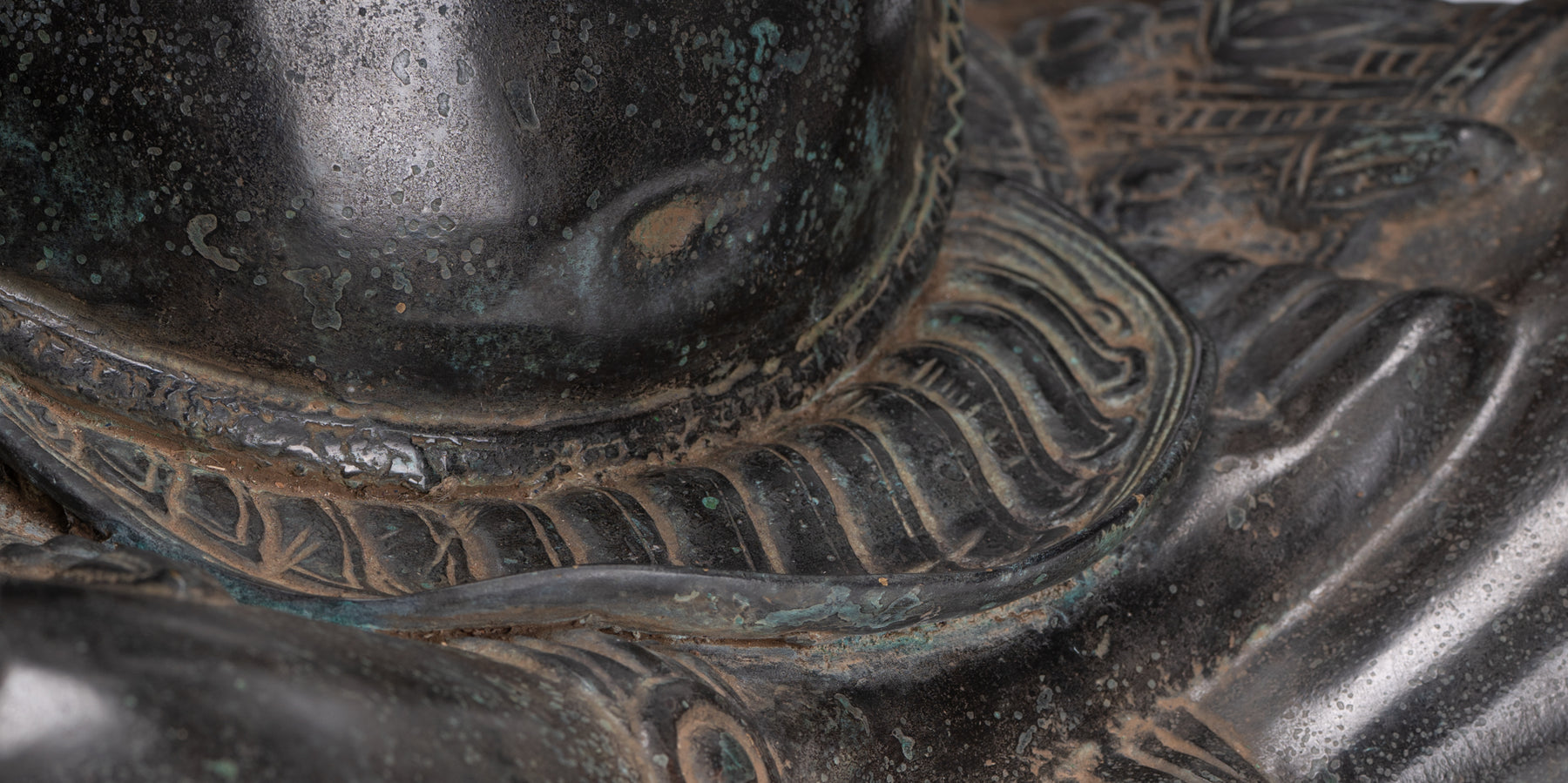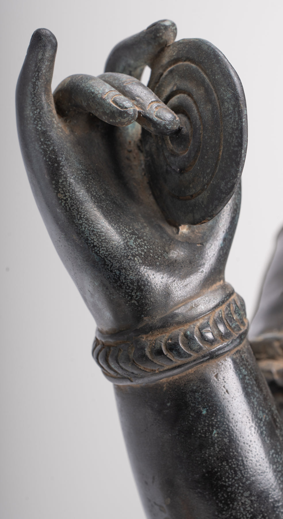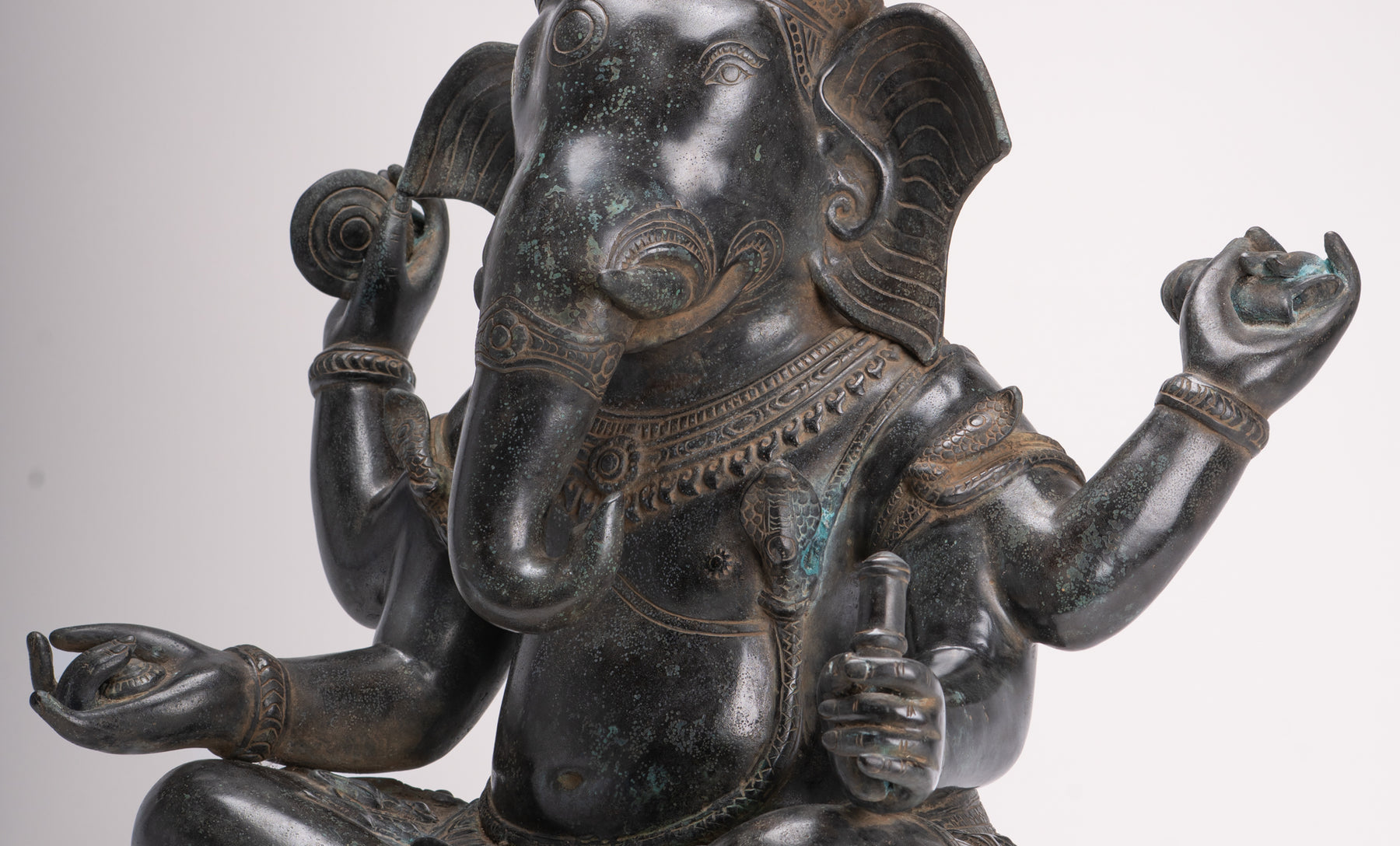Dieser wunderschöne 4-armige Ganesha aus Bronze hat Gesichtszüge und kunstvollen Schmuck, der typisch für den Angkor Wat-Stil ist. Das zylindrische Auftürmen der Haare zu einem hohen Dutt und die reglementierten Haarlocken verdeutlichen den ökumenischen Charakter der Ikonographie in der Angkor-Wat-Zeit, wobei Ersteres mit der höchsten Form von Vishnu, Letzteres mit Shiva in Verbindung gebracht wird.