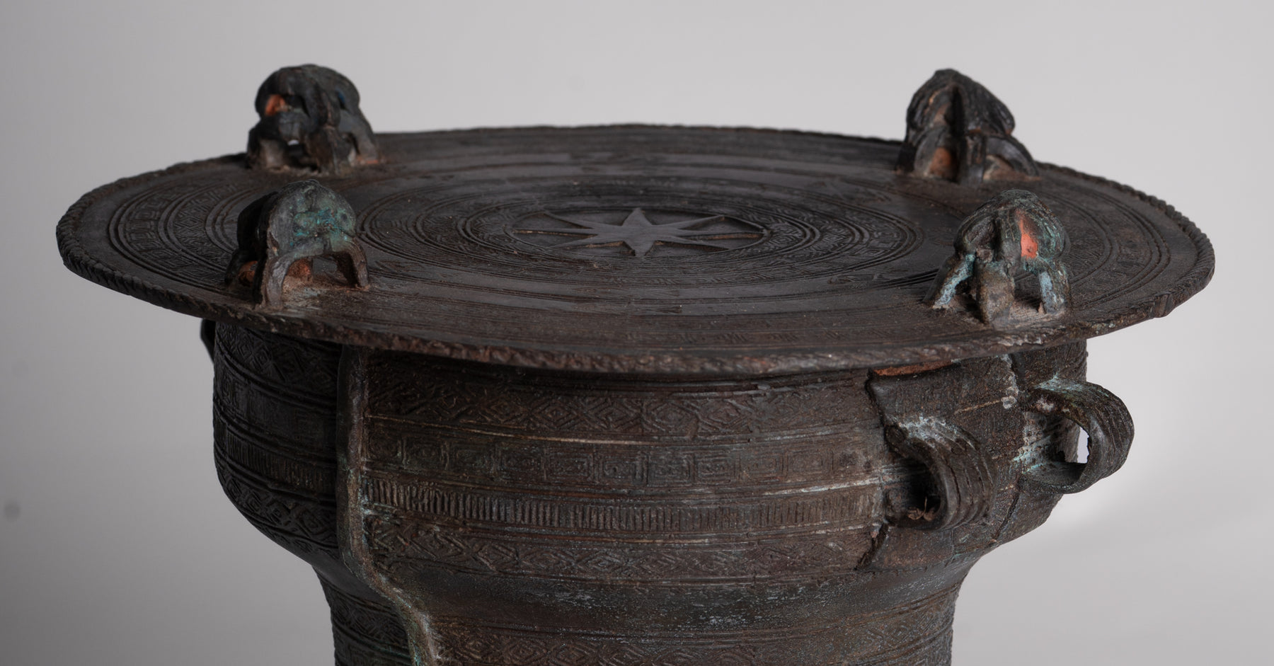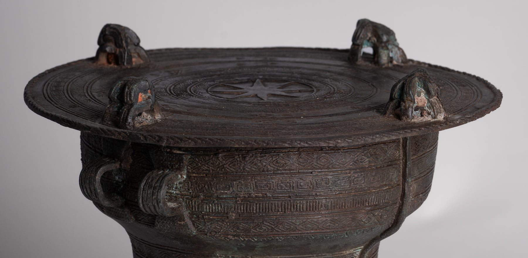 Das Instrument selbst ist ein massive, runde Bronzetrommel mit einem taillierte Basis und einer fein eingegossenen Oberfläche konzentrische Zierbänder. In seiner Mitte ruht das Rad des Dharma, das die Lehren und den Weg Buddhas zum Nirvana darstellt. Den Rand umgeben sind stilisierte Froschmotive, sorgfältig im Relief aufgetragen, während die Seiten mit verziert sind Paar kleine Schlaufengriffe zum Tragen. Die Elefanten- und Lotus-Designs entlang des Trommelkörpers unterstreichen ihre Bedeutung noch weiter – der Elefant symbolisiert Stärke und Weisheit und der Lotus verkörpert sie Reinheit, Mitgefühl und das Aufblühen der Freude.