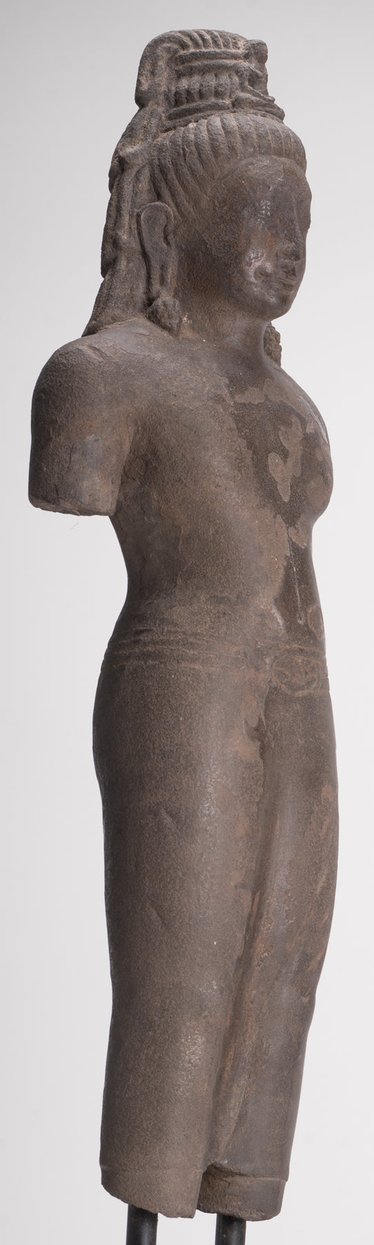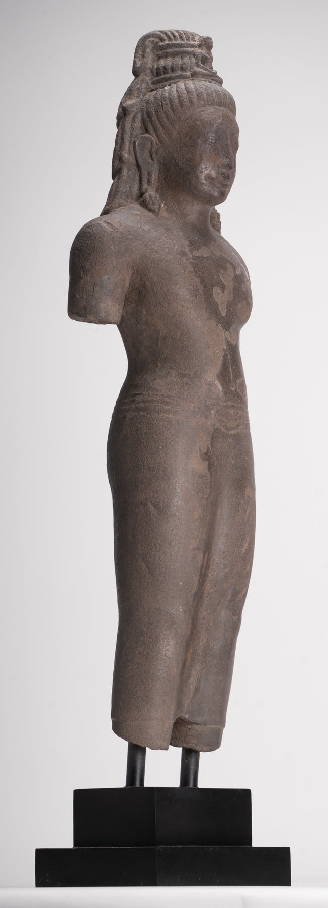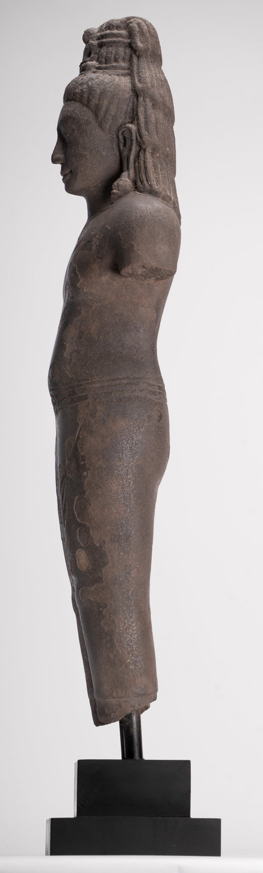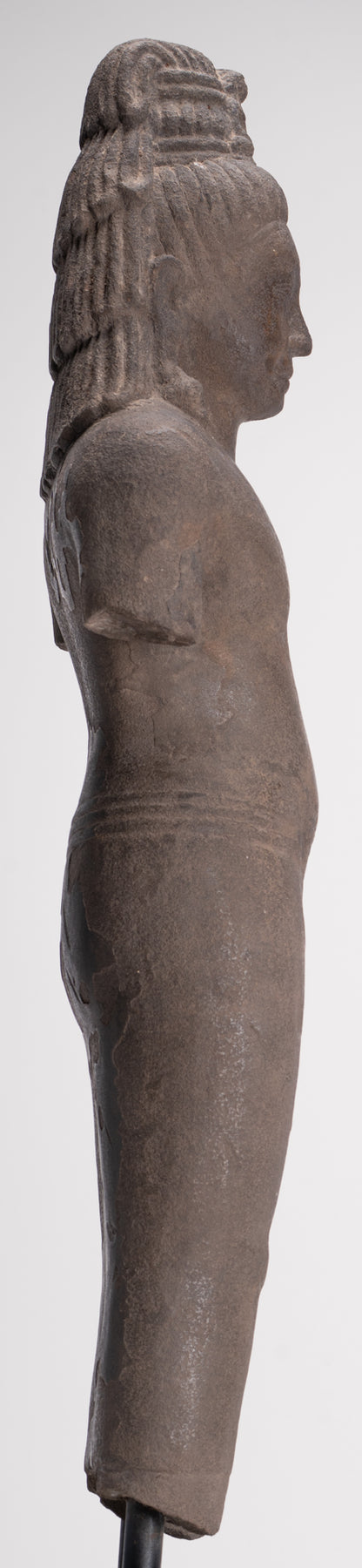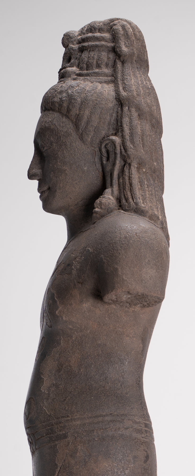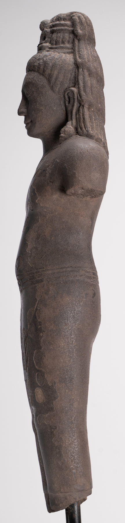 Here, the bodhisattva of compassion is shown with an ascetic’s refinement, dressed in a simple waistcloth secured with a cord, the incised folds following the contours of the torso. The cult of Avalokiteshvara assumed special prominence in Mahayana Buddhism during this period and, having developed in India, was soon embraced by Buddhist communities across Southeast Asia.