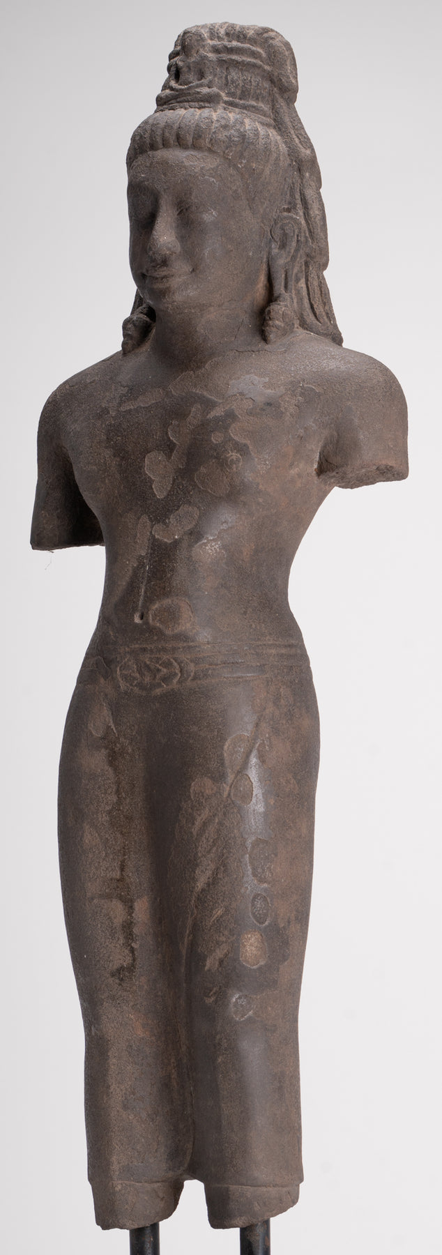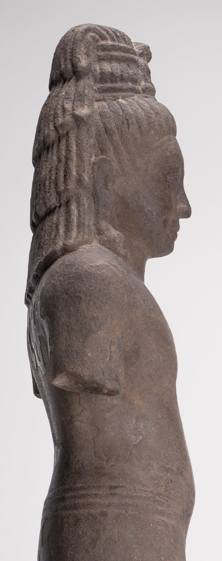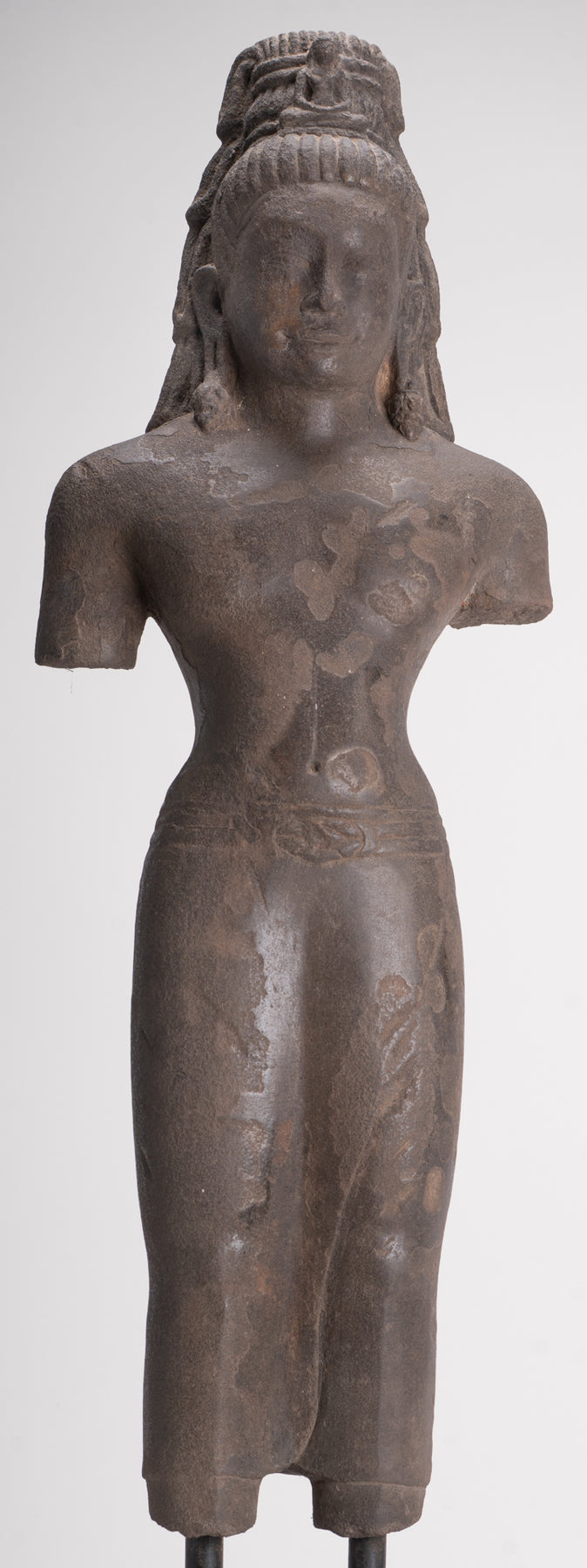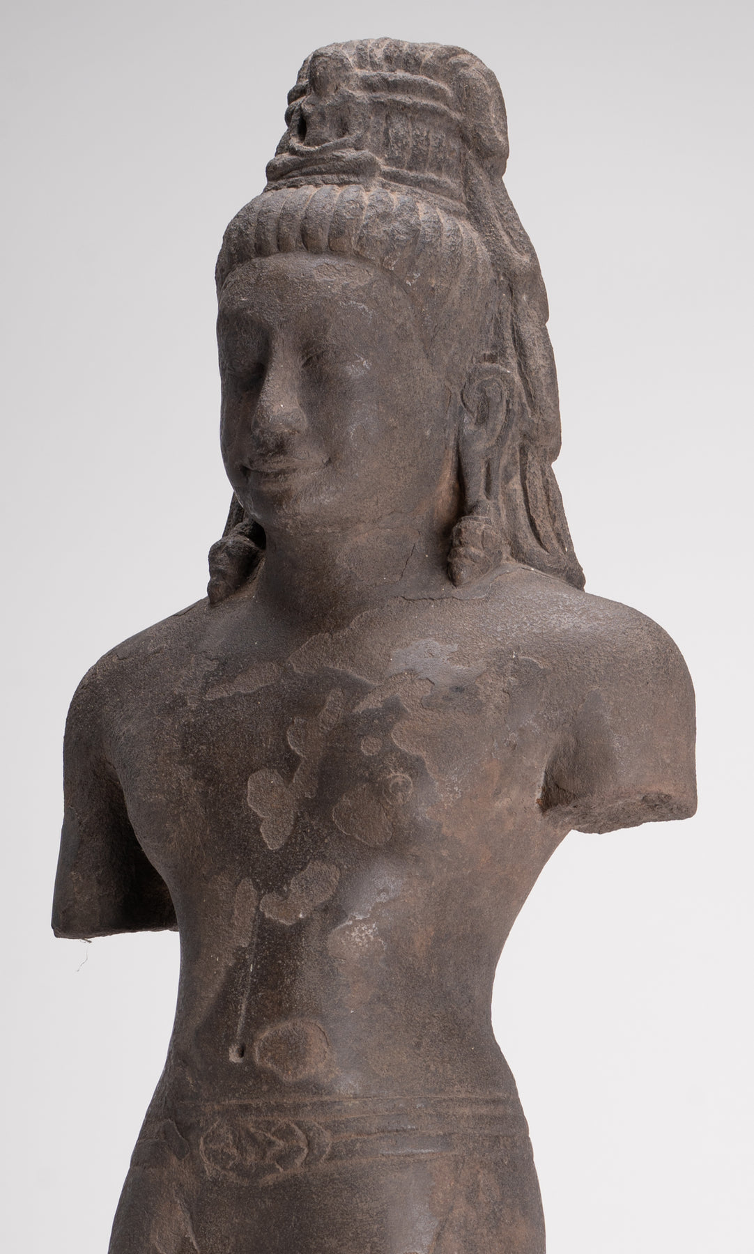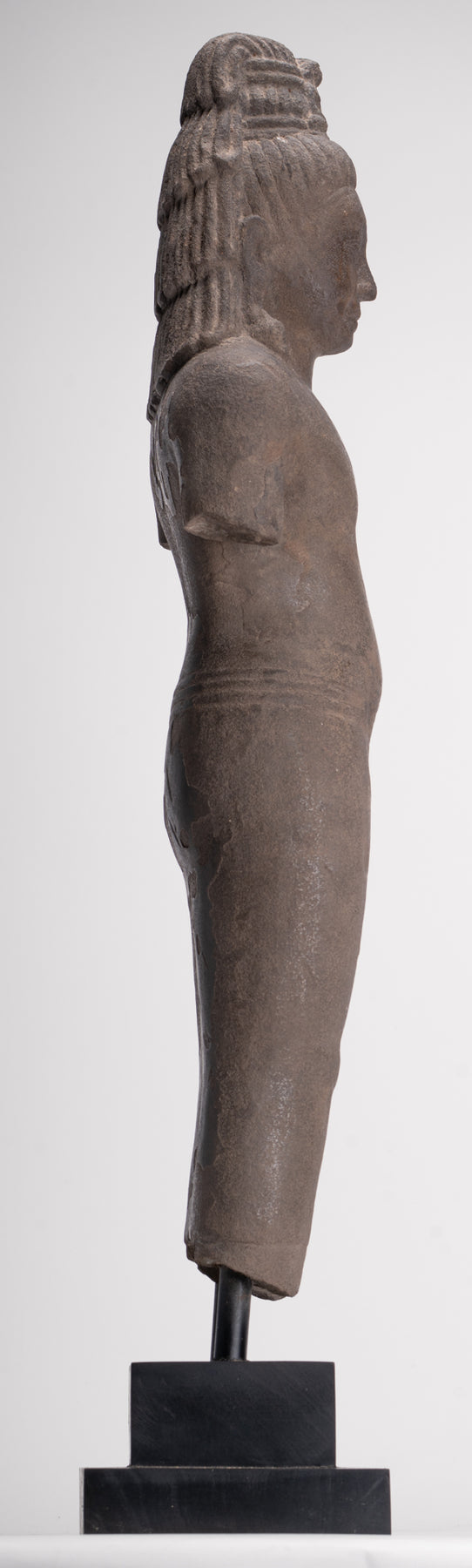 Here, the bodhisattva of compassion is shown with an ascetic’s refinement, dressed in a simple waistcloth secured with a cord, the incised folds following the contours of the torso. The cult of Avalokiteshvara assumed special prominence in Mahayana Buddhism during this period and, having developed in India, was soon embraced by Buddhist communities across Southeast Asia.