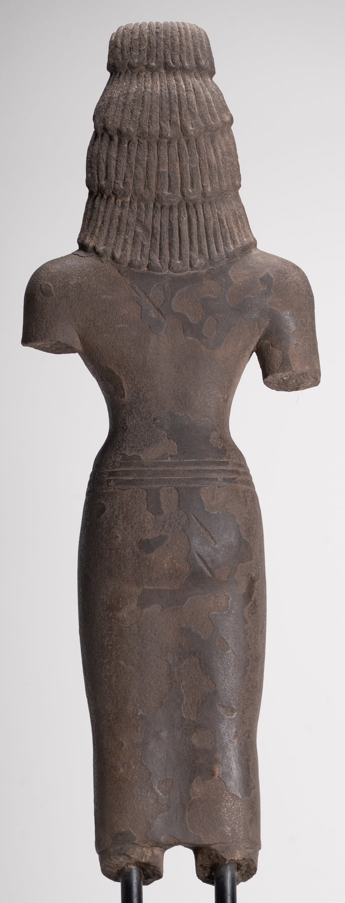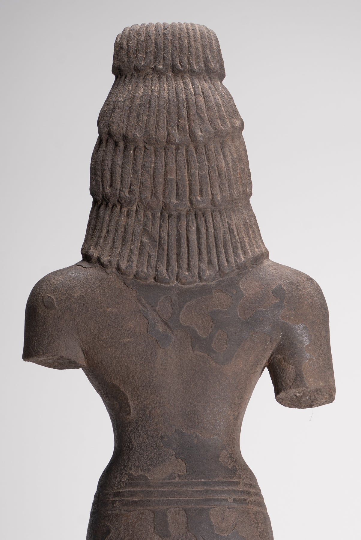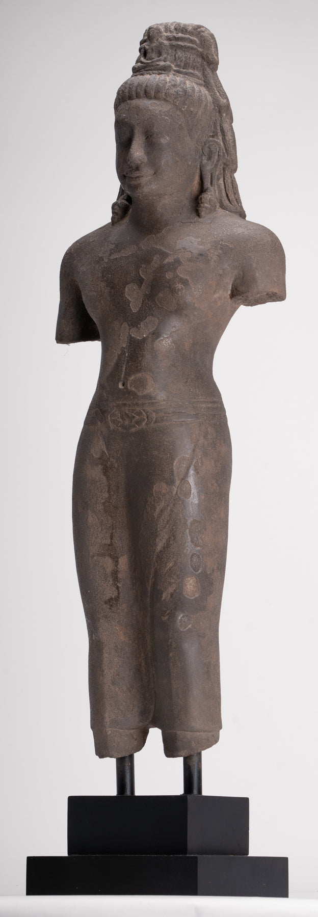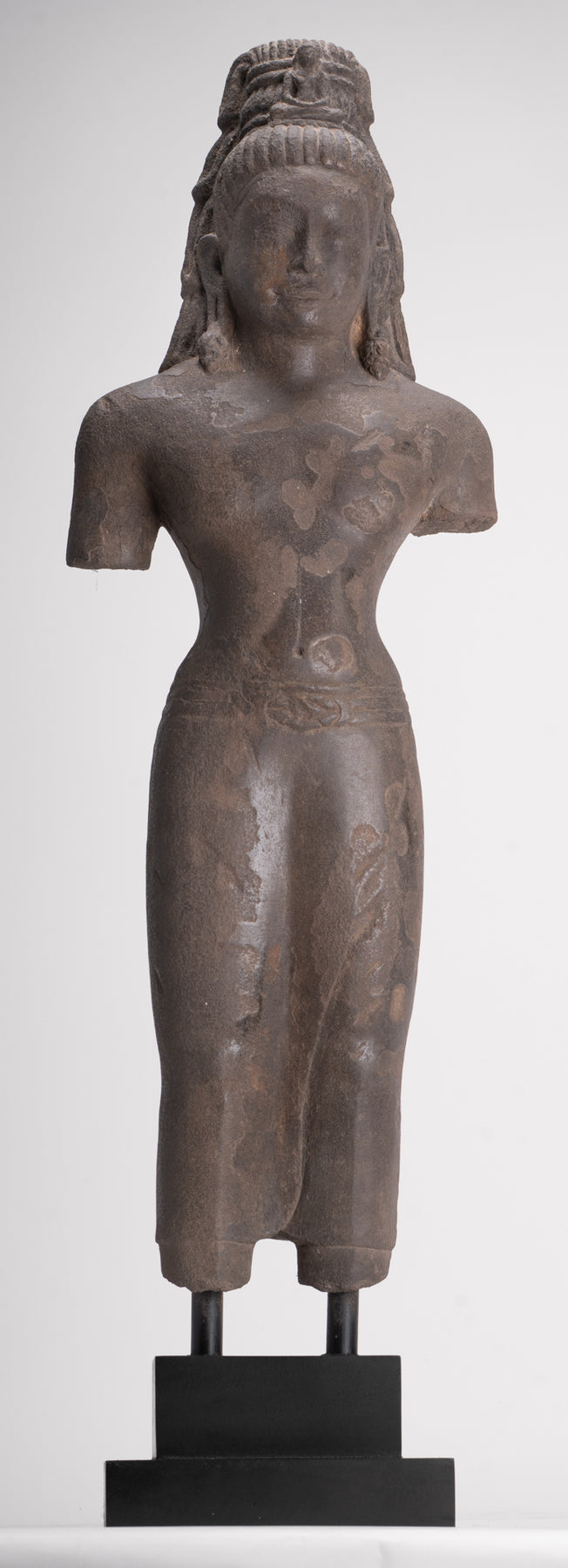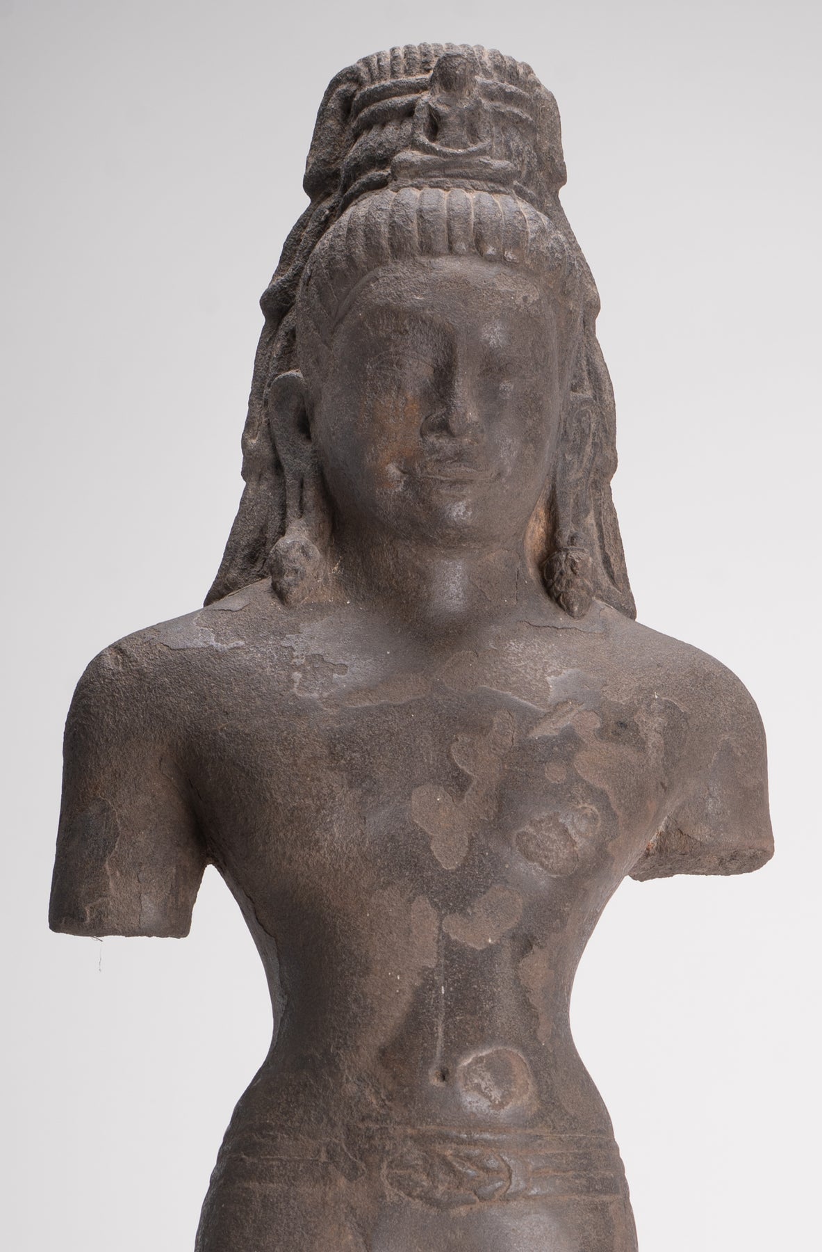 Here, the bodhisattva of compassion is shown with an ascetic’s refinement, dressed in a simple waistcloth secured with a cord, the incised folds following the contours of the torso. The cult of Avalokiteshvara assumed special prominence in Mahayana Buddhism during this period and, having developed in India, was soon embraced by Buddhist communities across Southeast Asia.