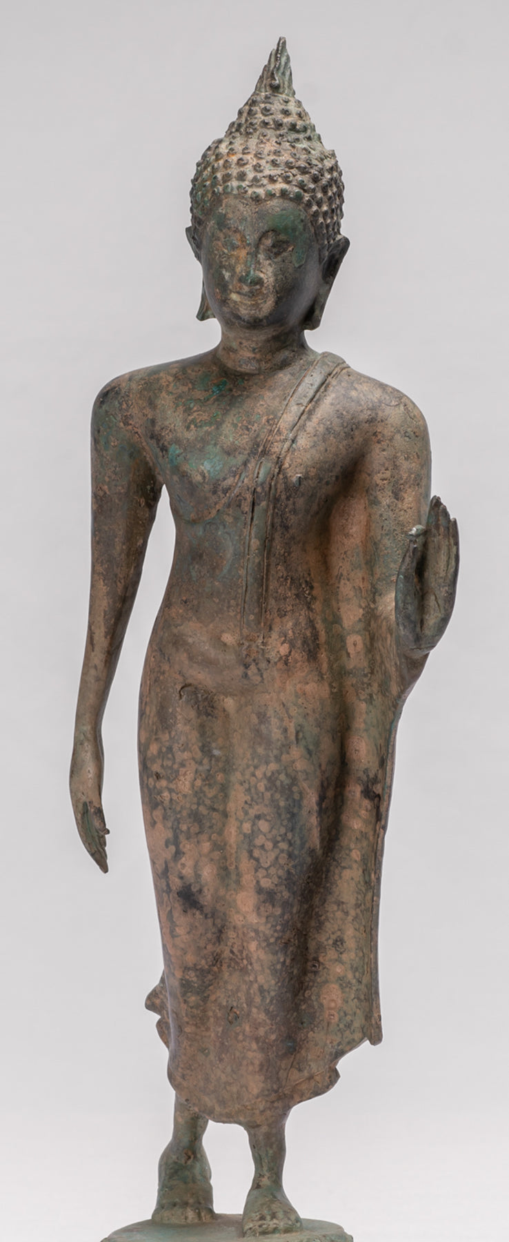 • Antique Sukhothai Style Standing Bronze Protection Walking Buddha Statue - 42cm/17"