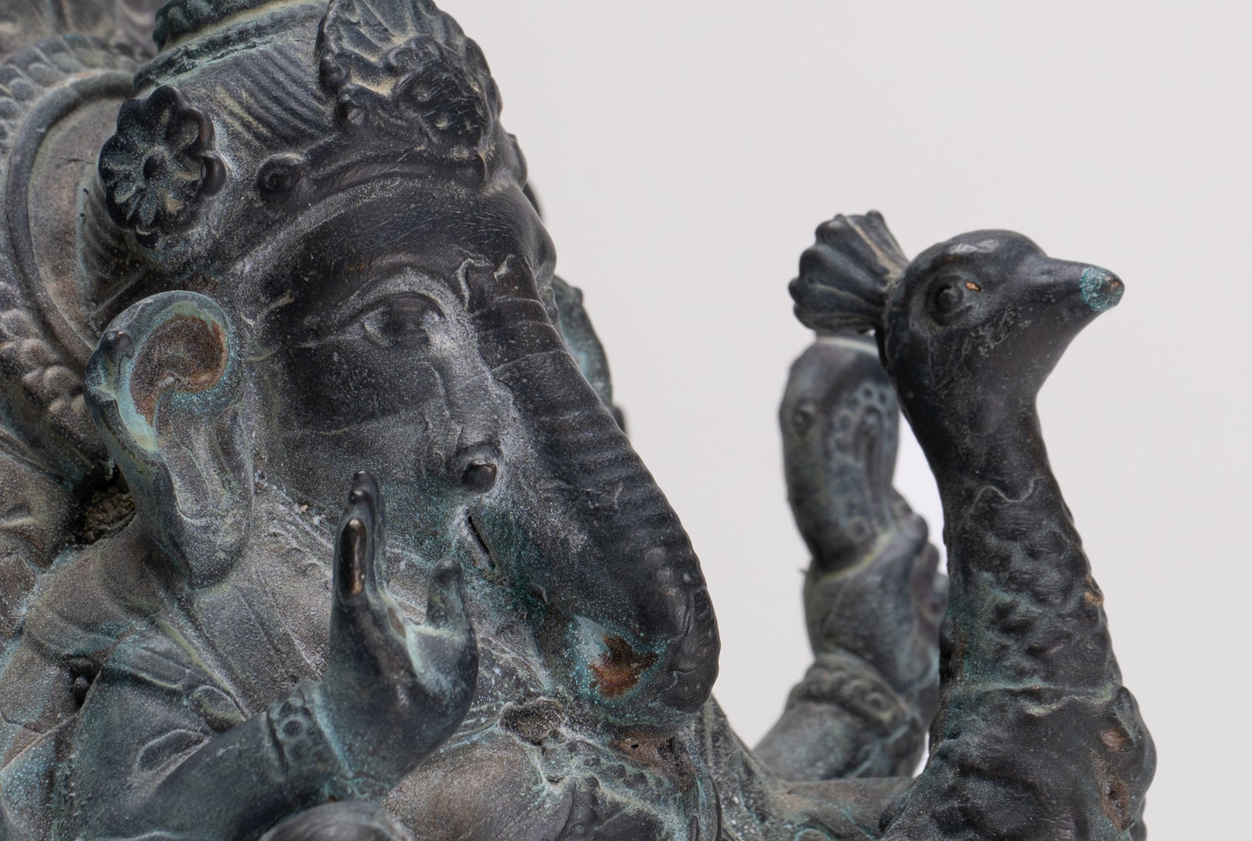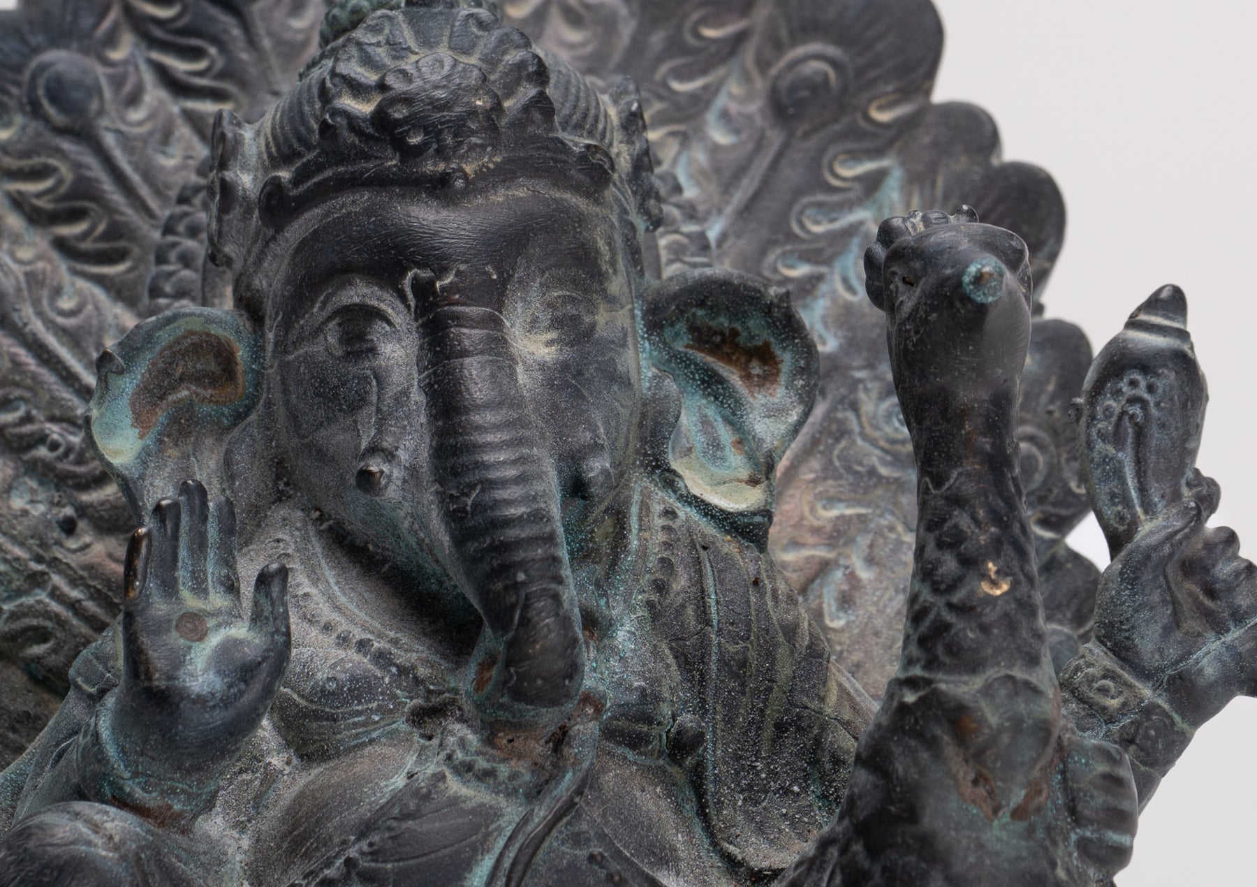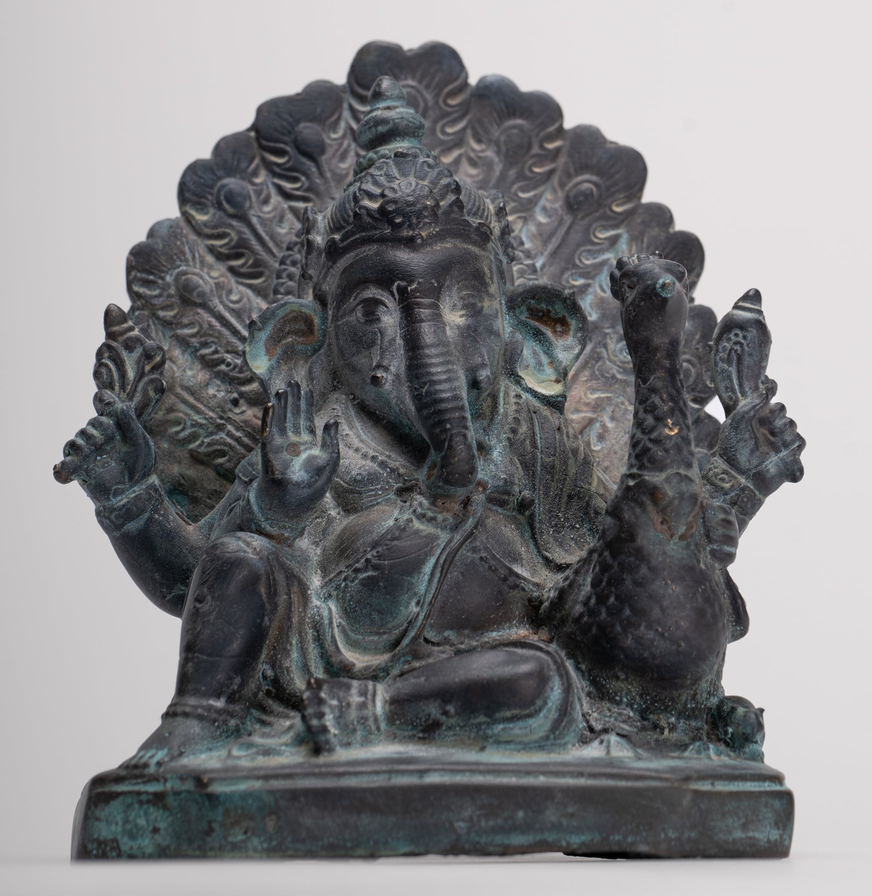 An antique Thai style bronze seated Mayuresha Ganapathy.