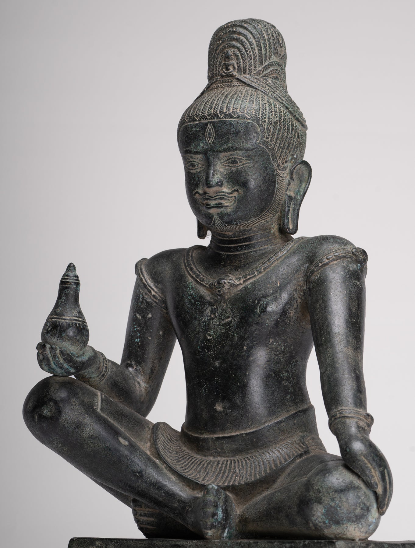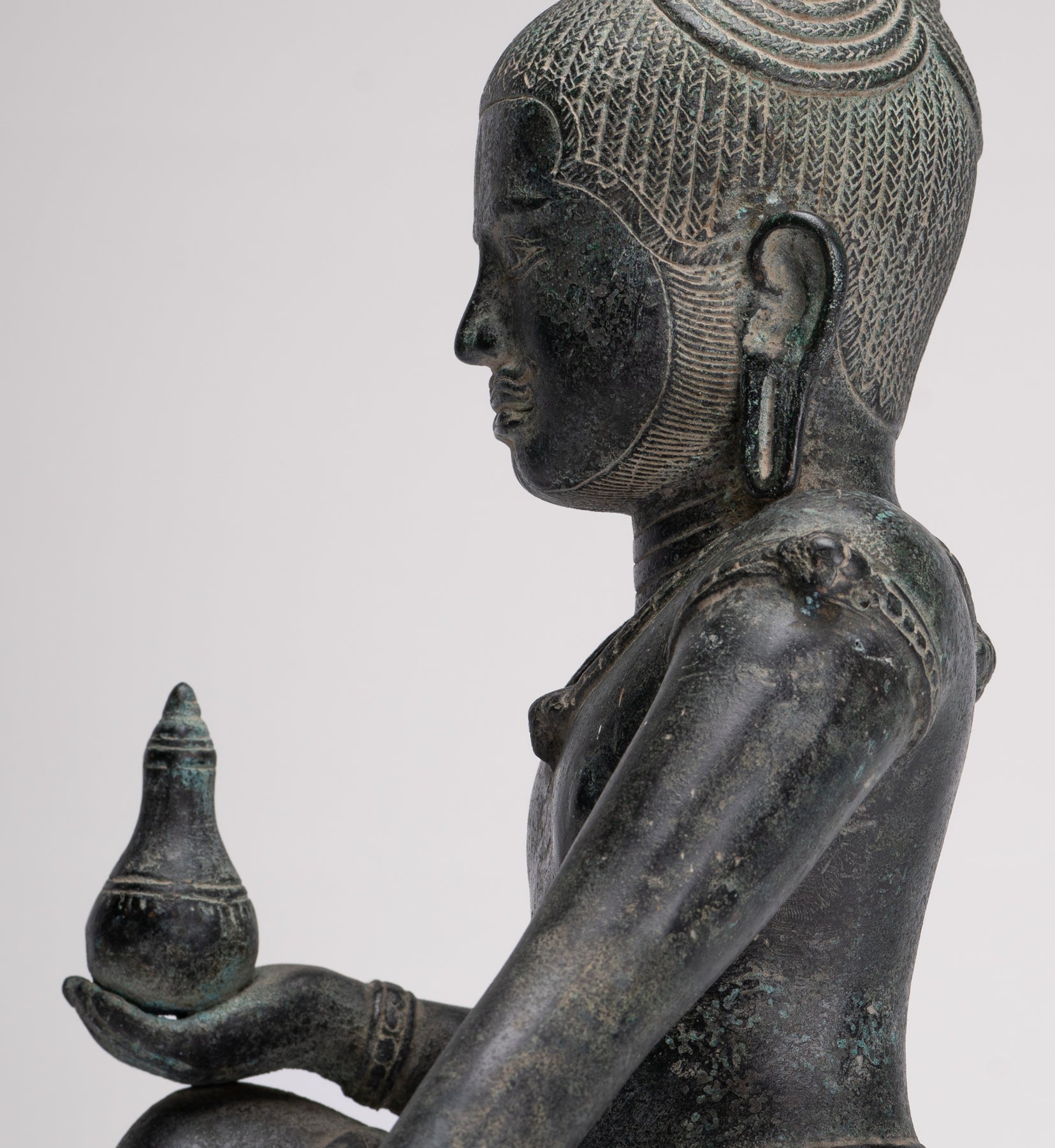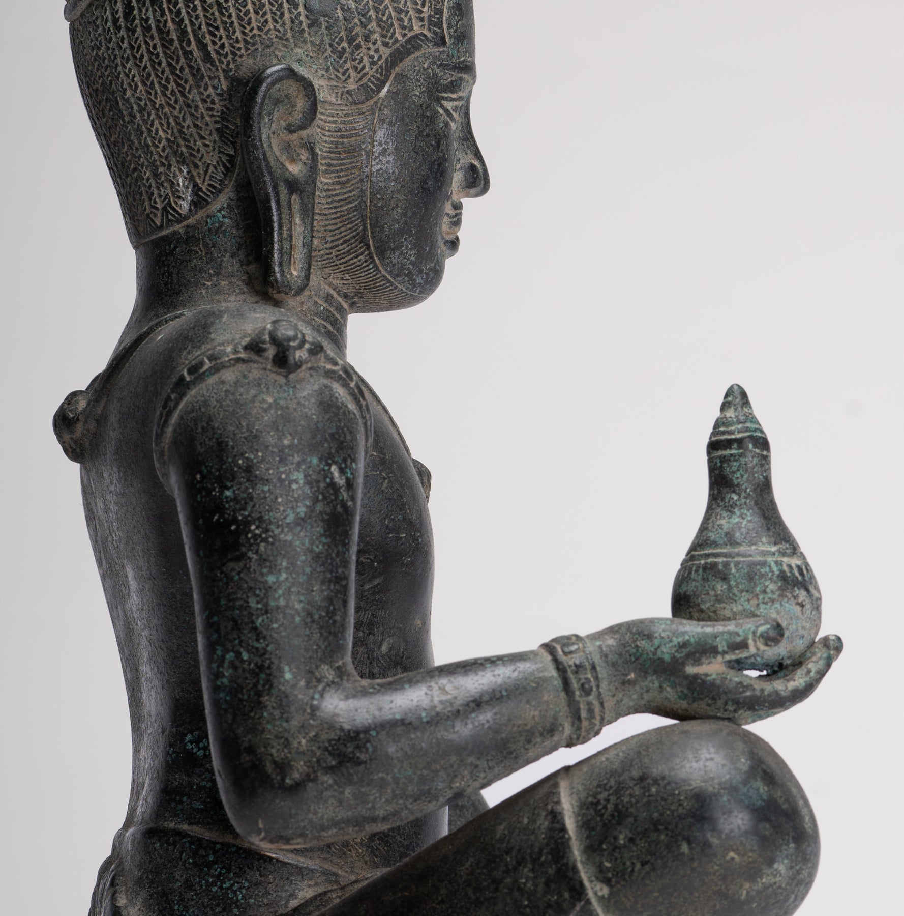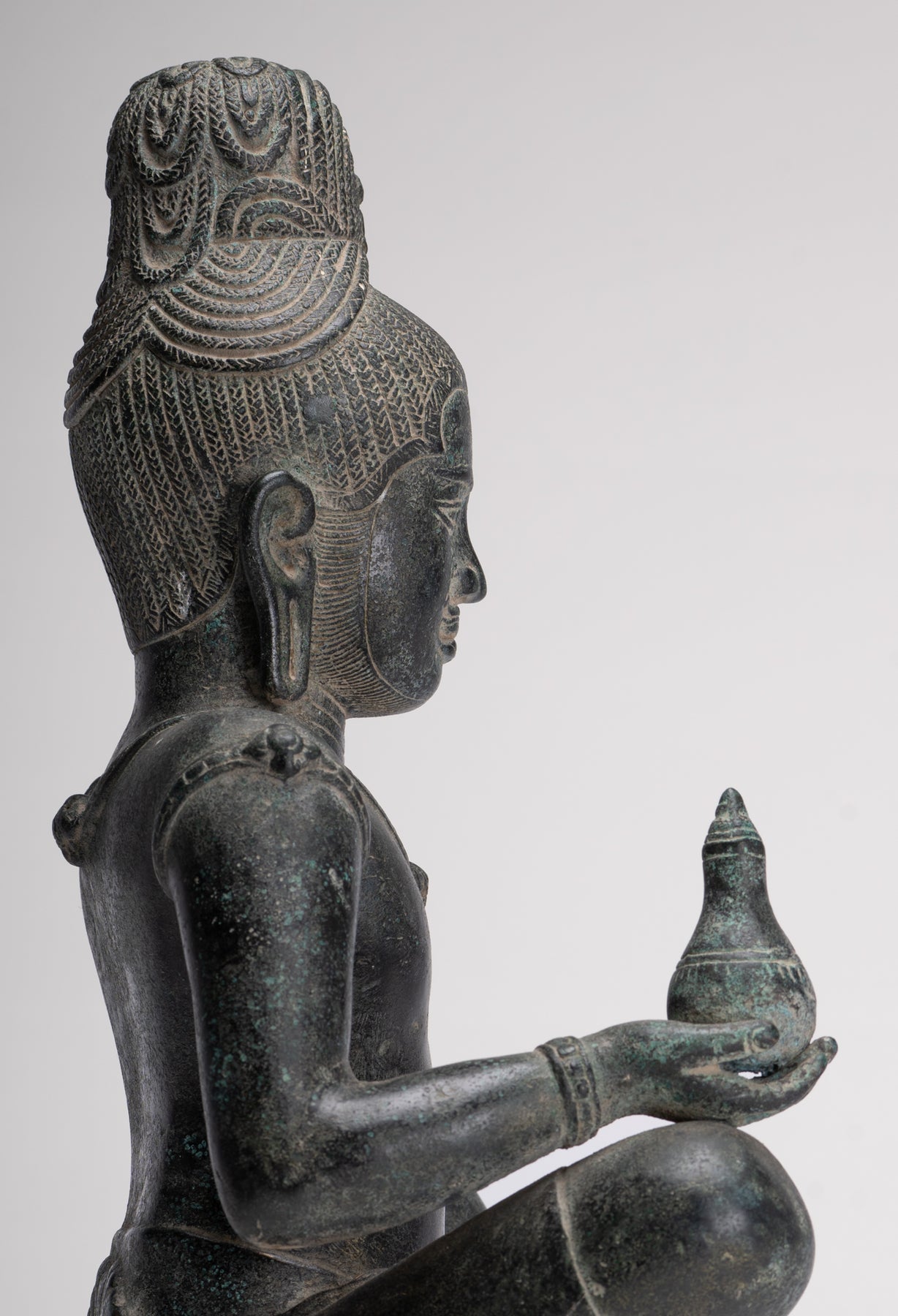 In his right hand, Lokeshvara holds a kalasha, the sacred vessel revered in Vedic tradition. The kalasha, often described as an “overflowing full vase,” is believed to contain amrita—the elixir of immortality. Within Hindu and Buddhist symbolism alike, it represents abundance, wisdom, and the source of life itself. In this sculpture, the vessel gently reinforces Lokeshvara’s role as a benevolent bestower of compassion and eternal vitality.
