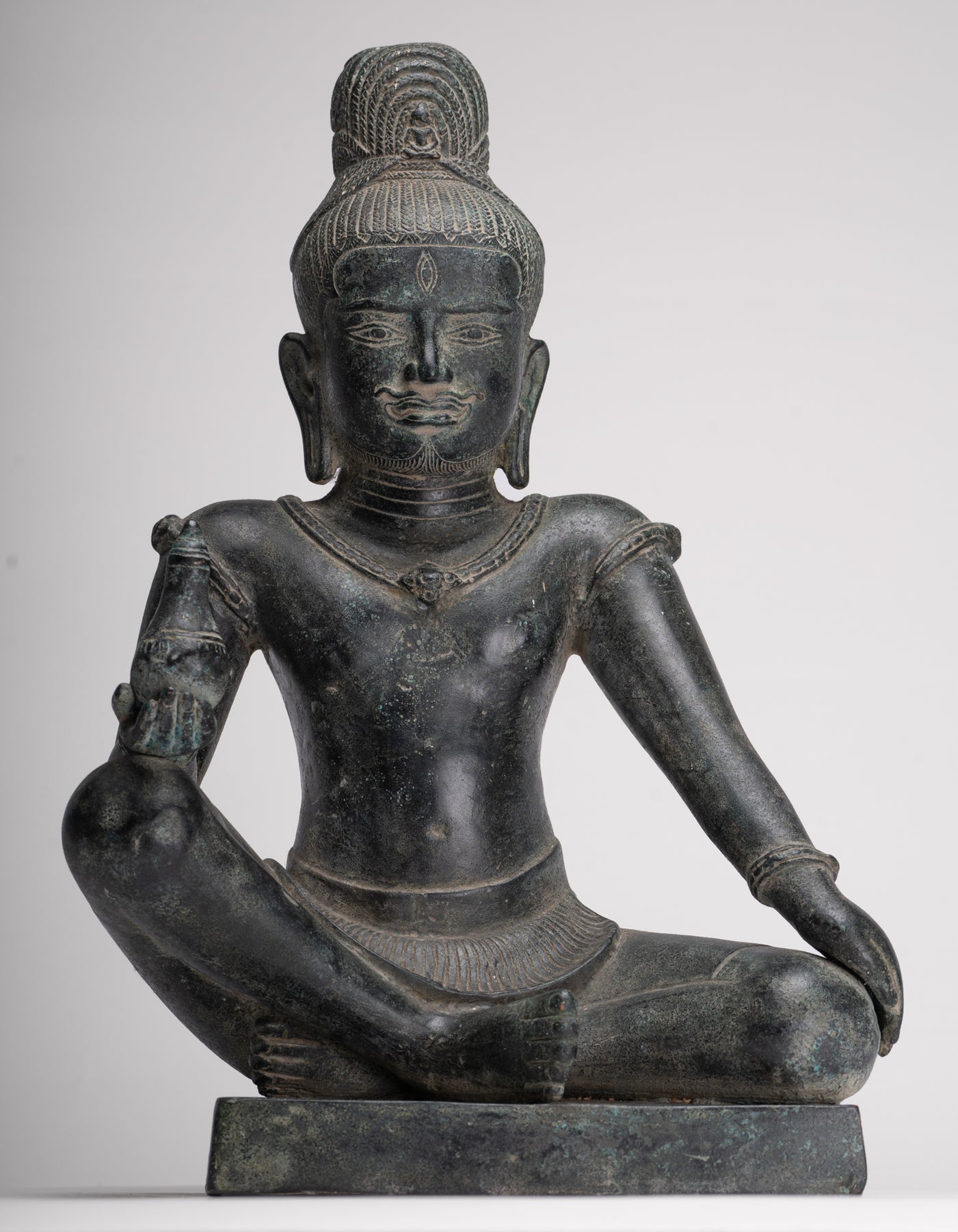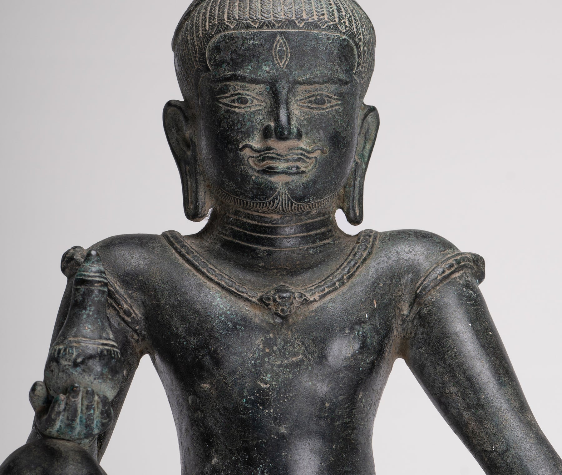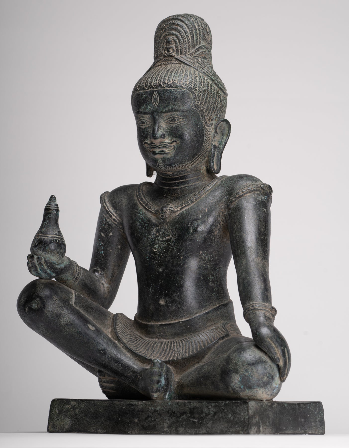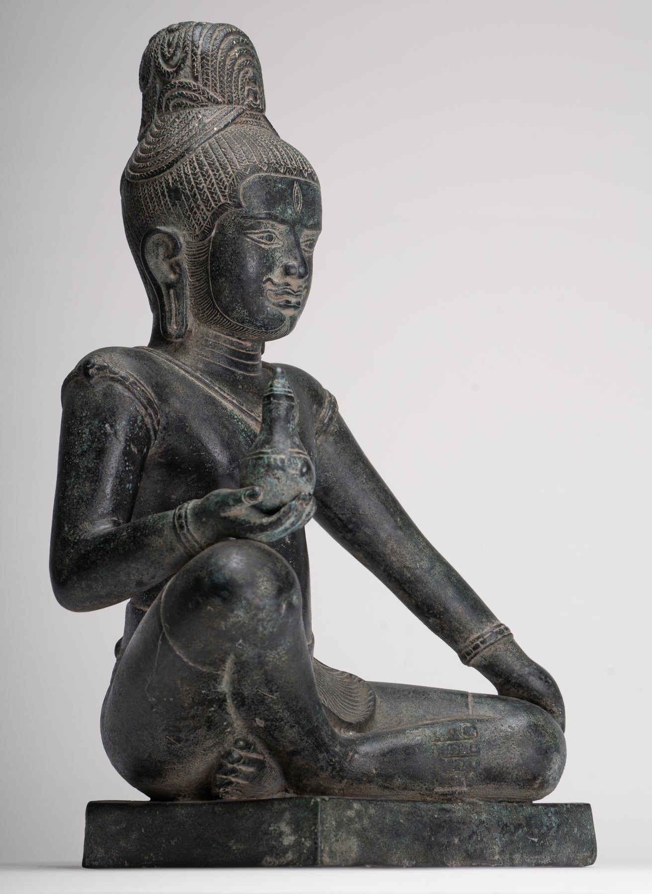 In his right hand, Lokeshvara holds a kalasha, the sacred vessel revered in Vedic tradition. The kalasha, often described as an “overflowing full vase,” is believed to contain amrita—the elixir of immortality. Within Hindu and Buddhist symbolism alike, it represents abundance, wisdom, and the source of life itself. In this sculpture, the vessel gently reinforces Lokeshvara’s role as a benevolent bestower of compassion and eternal vitality.