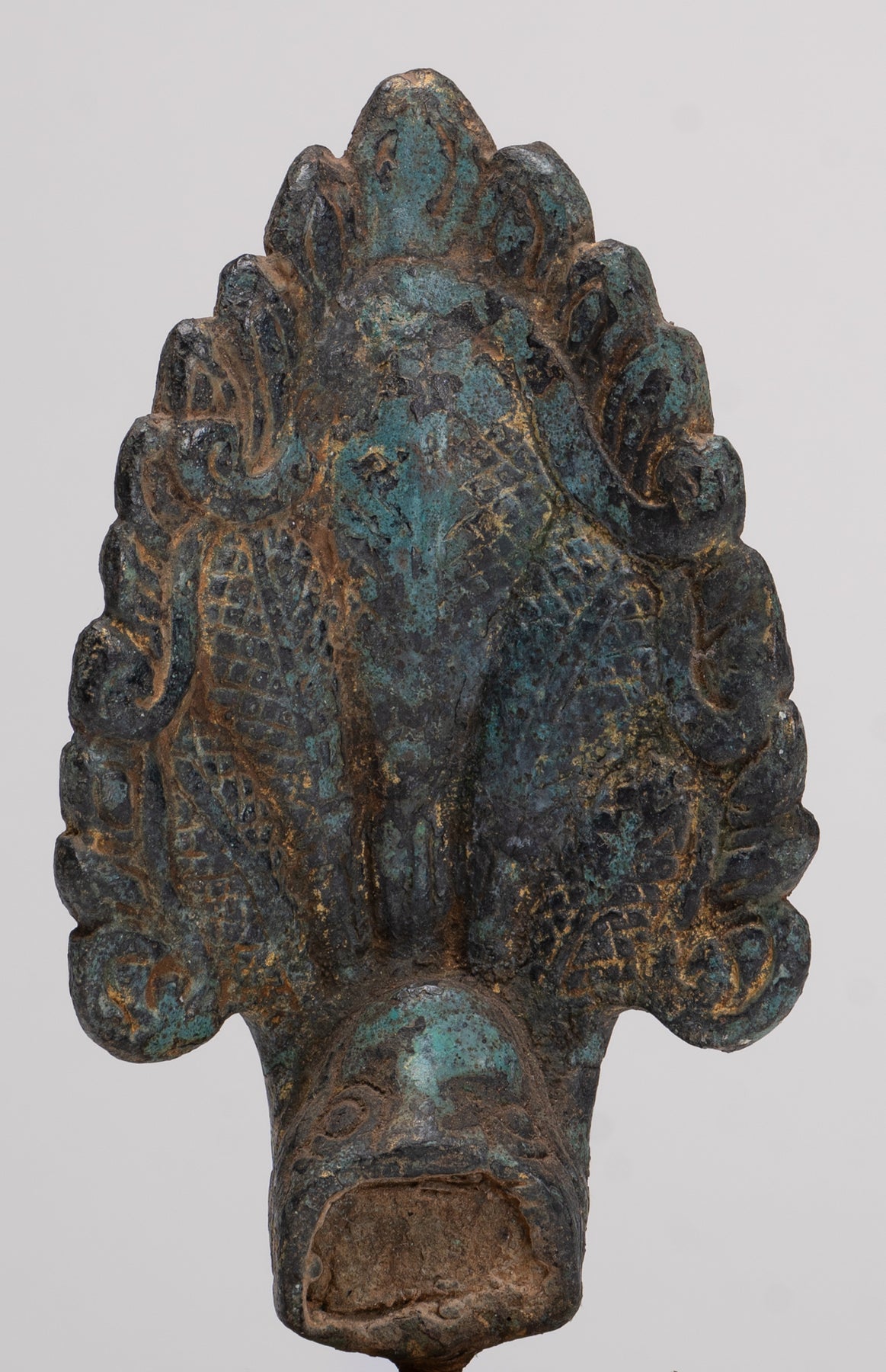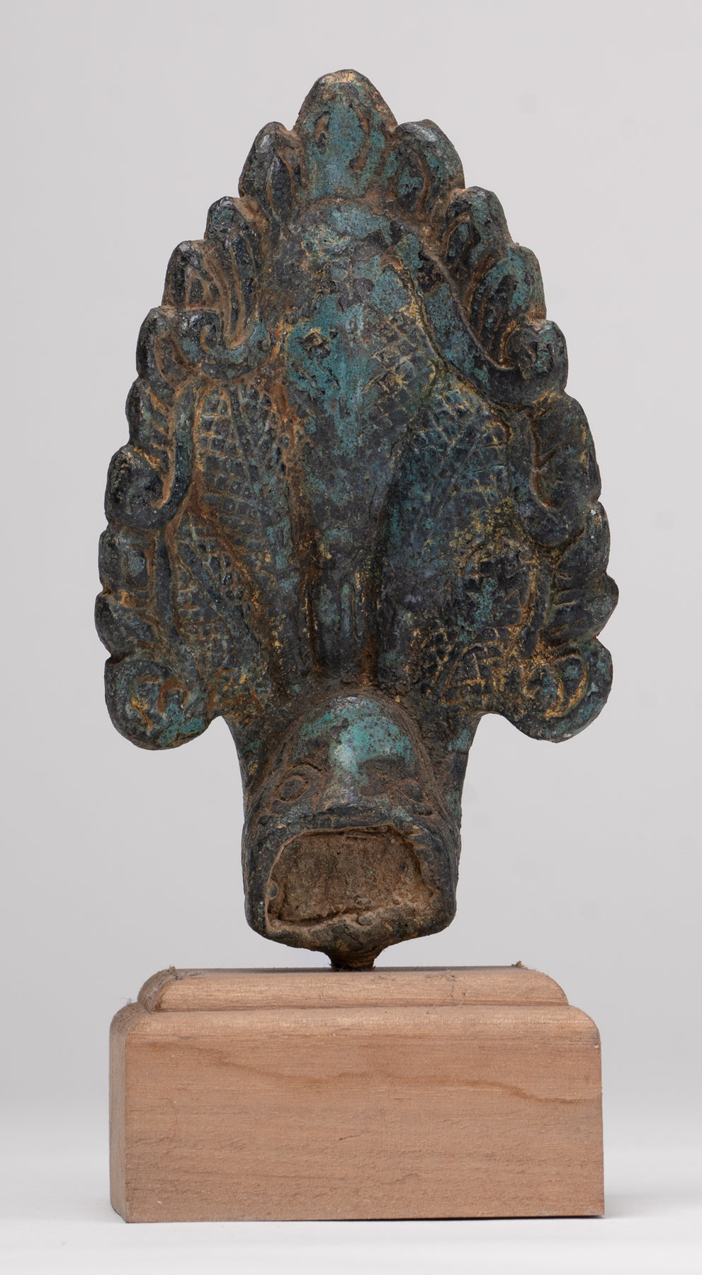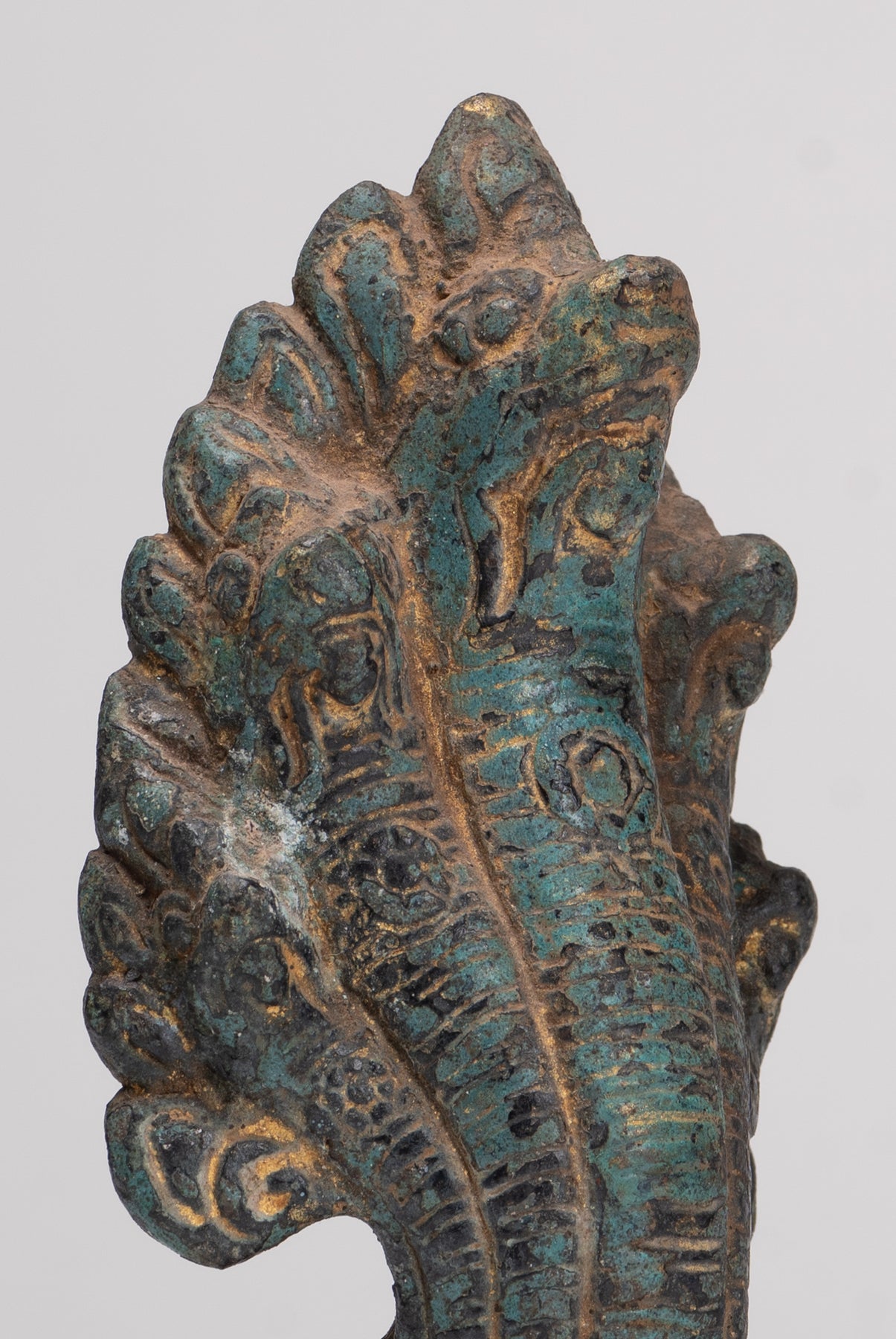 Antique Khmer Style Mounted Bronze Protective Naga, Snake or Serpent Statue - 17cm/7"