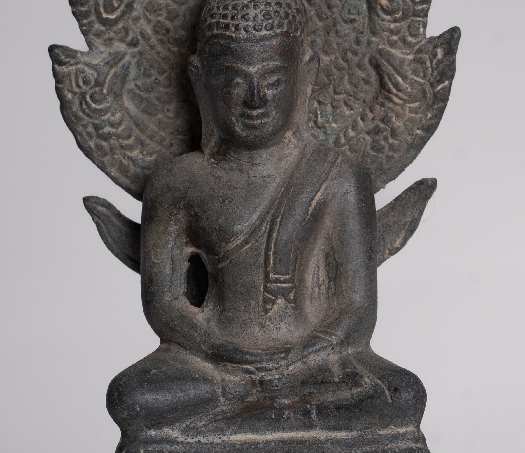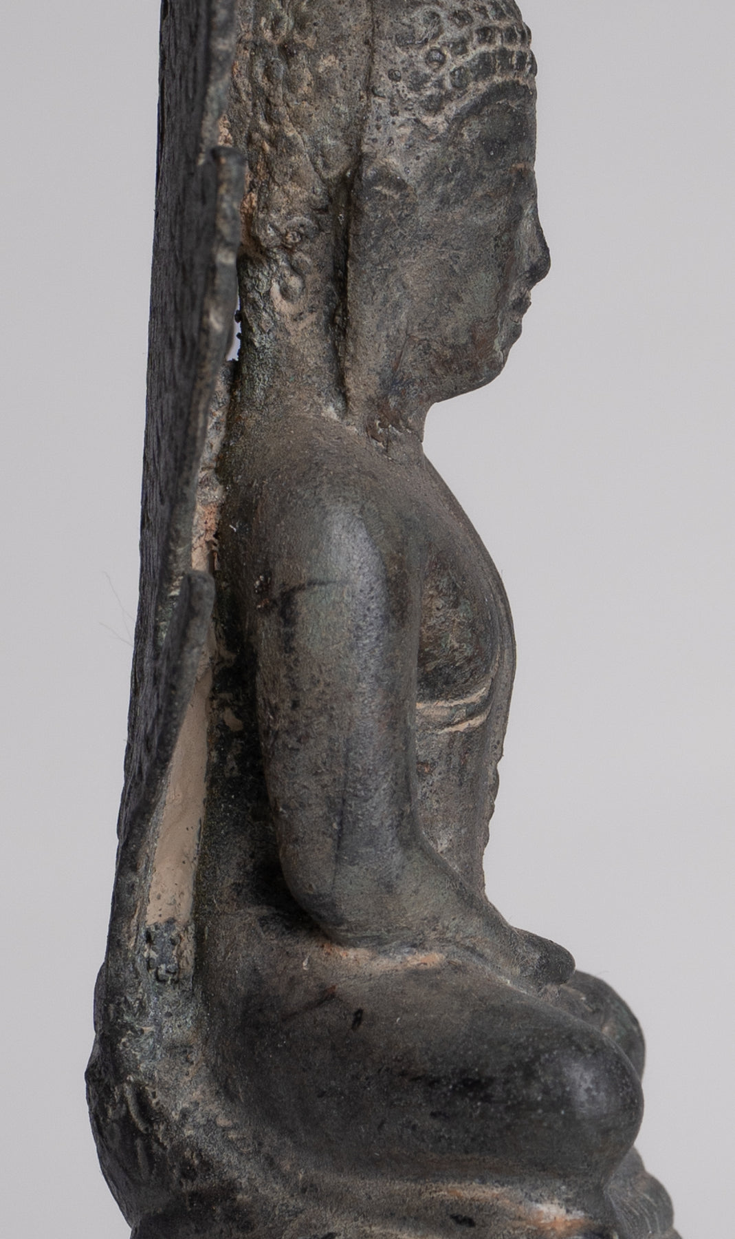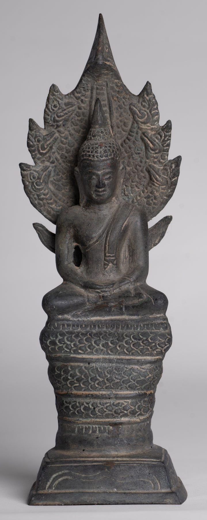 Buddha Statue - Antique Sukhothai Style Bronze Meditating Naga Buddha Statue - 21cm/8"