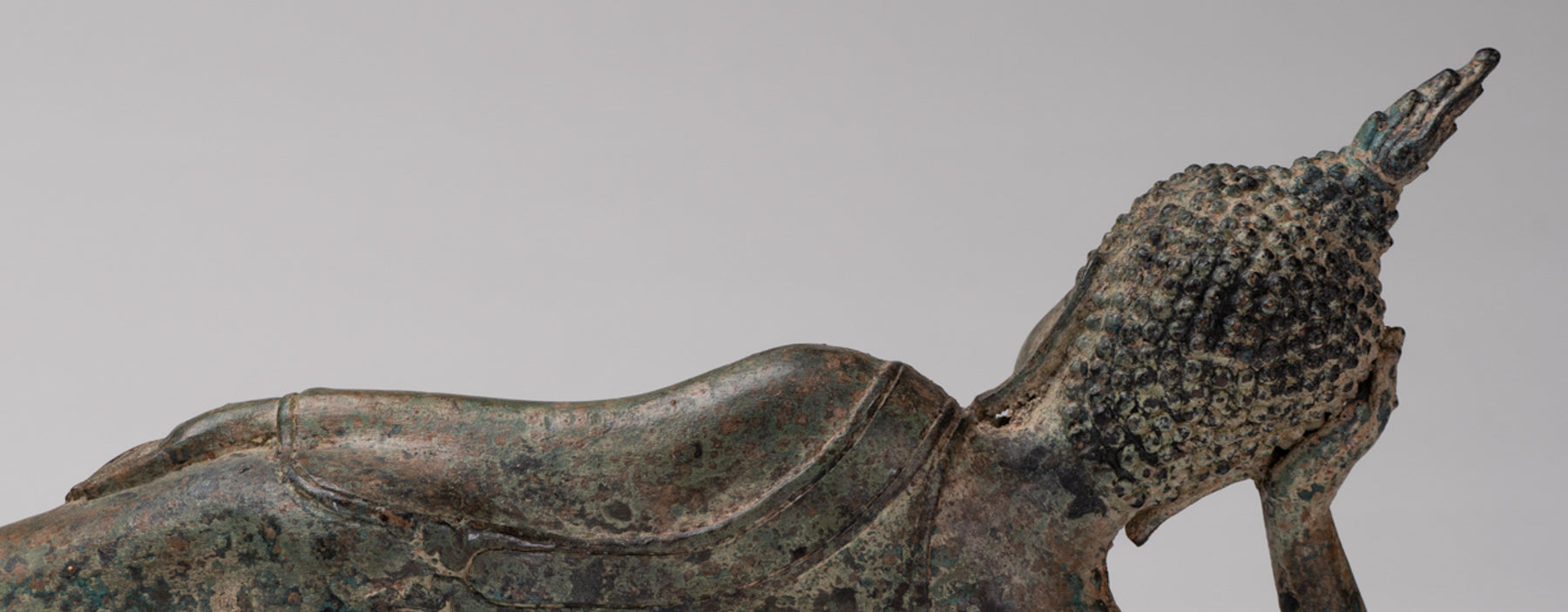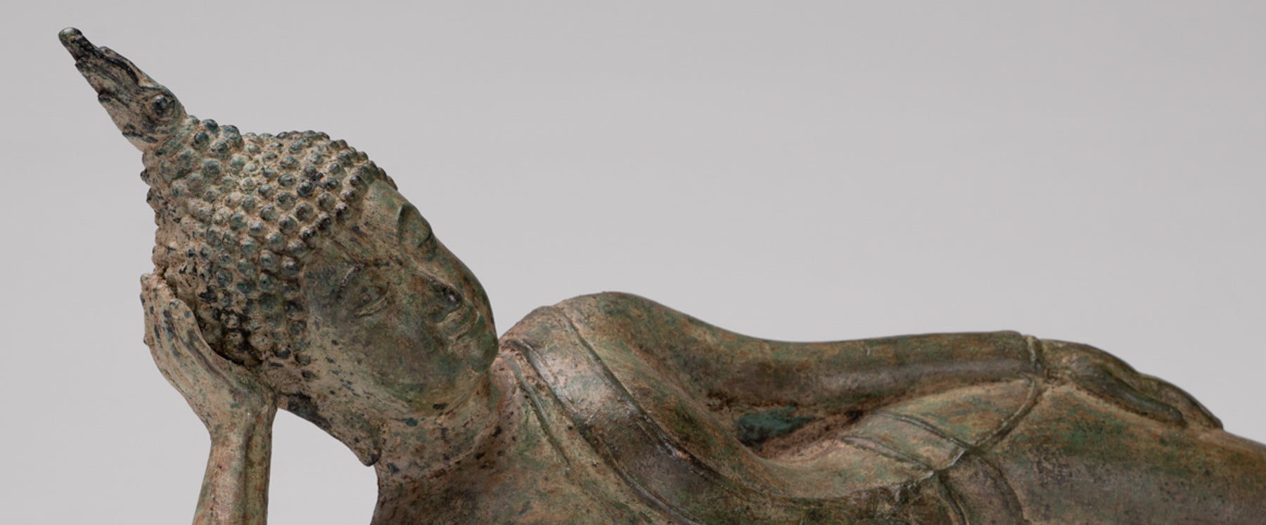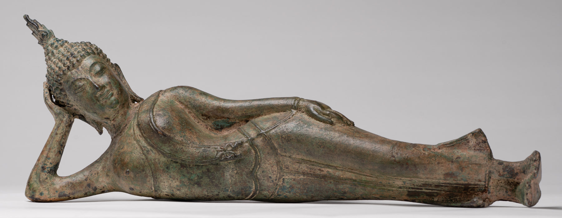 An antique Thai style Sukhothai style Buddha that depicts the Buddha in nirvana or enlightened pose.