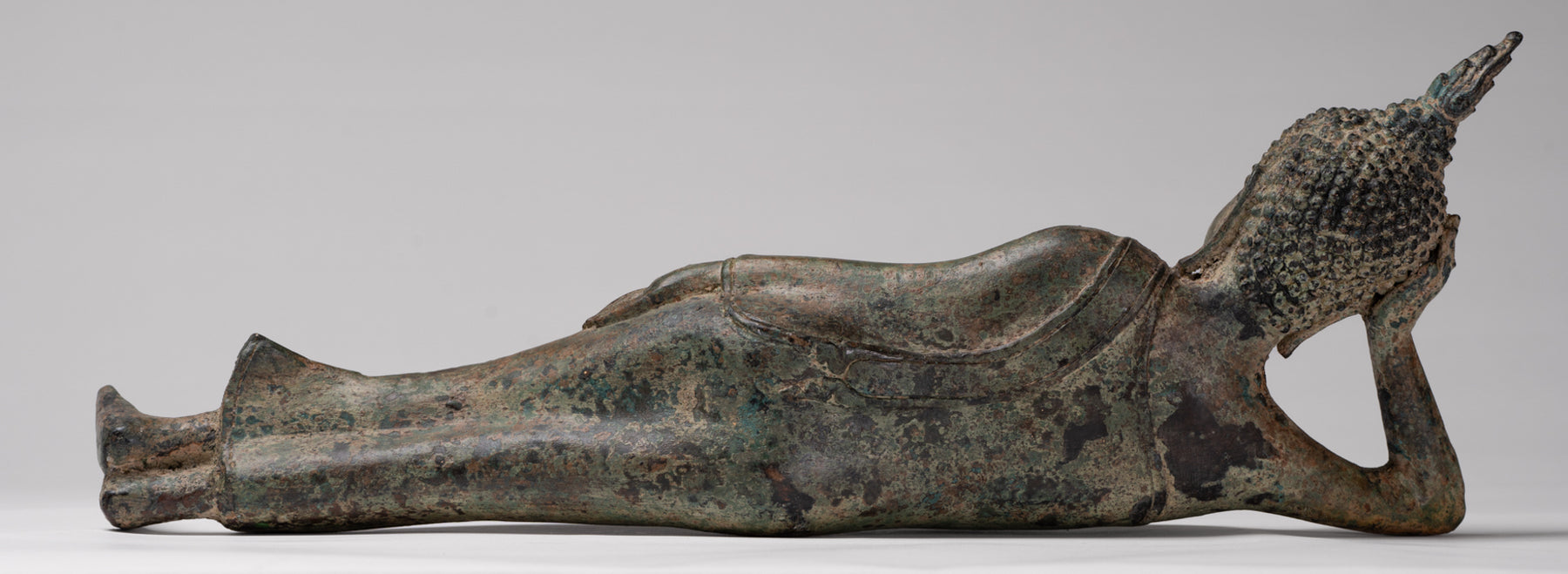 • Antique Thai Style Bronze Sukhothai Reclining Nirvana Buddha Statue - 43cm/17"