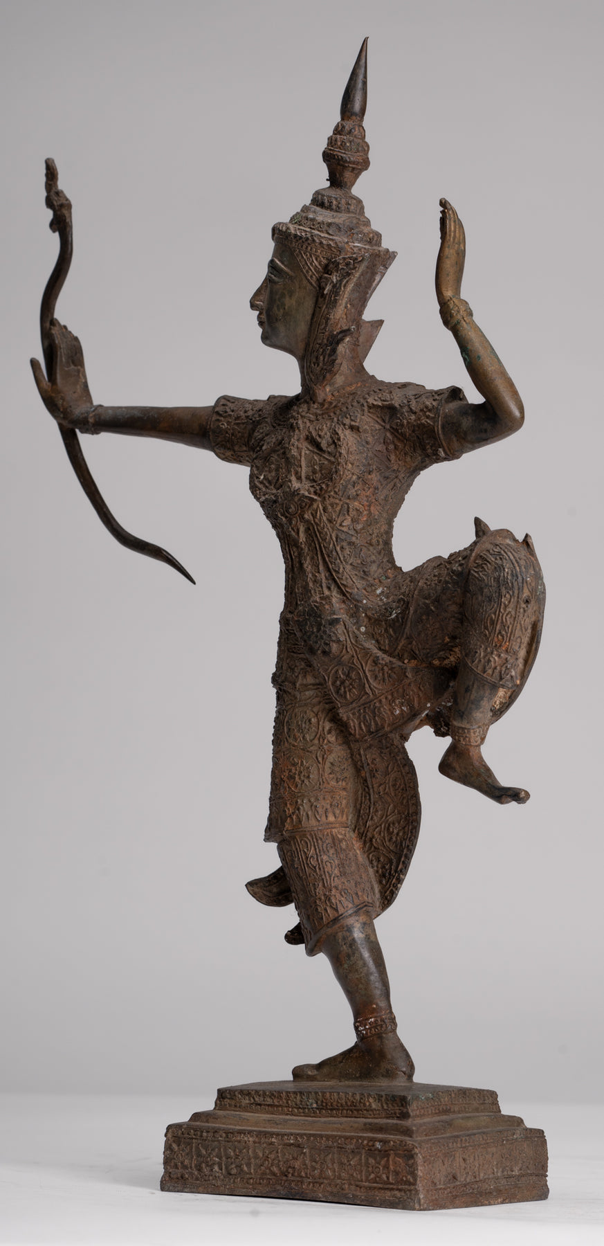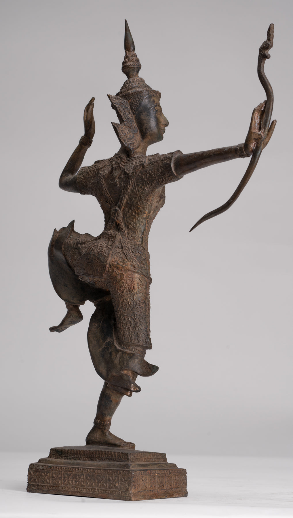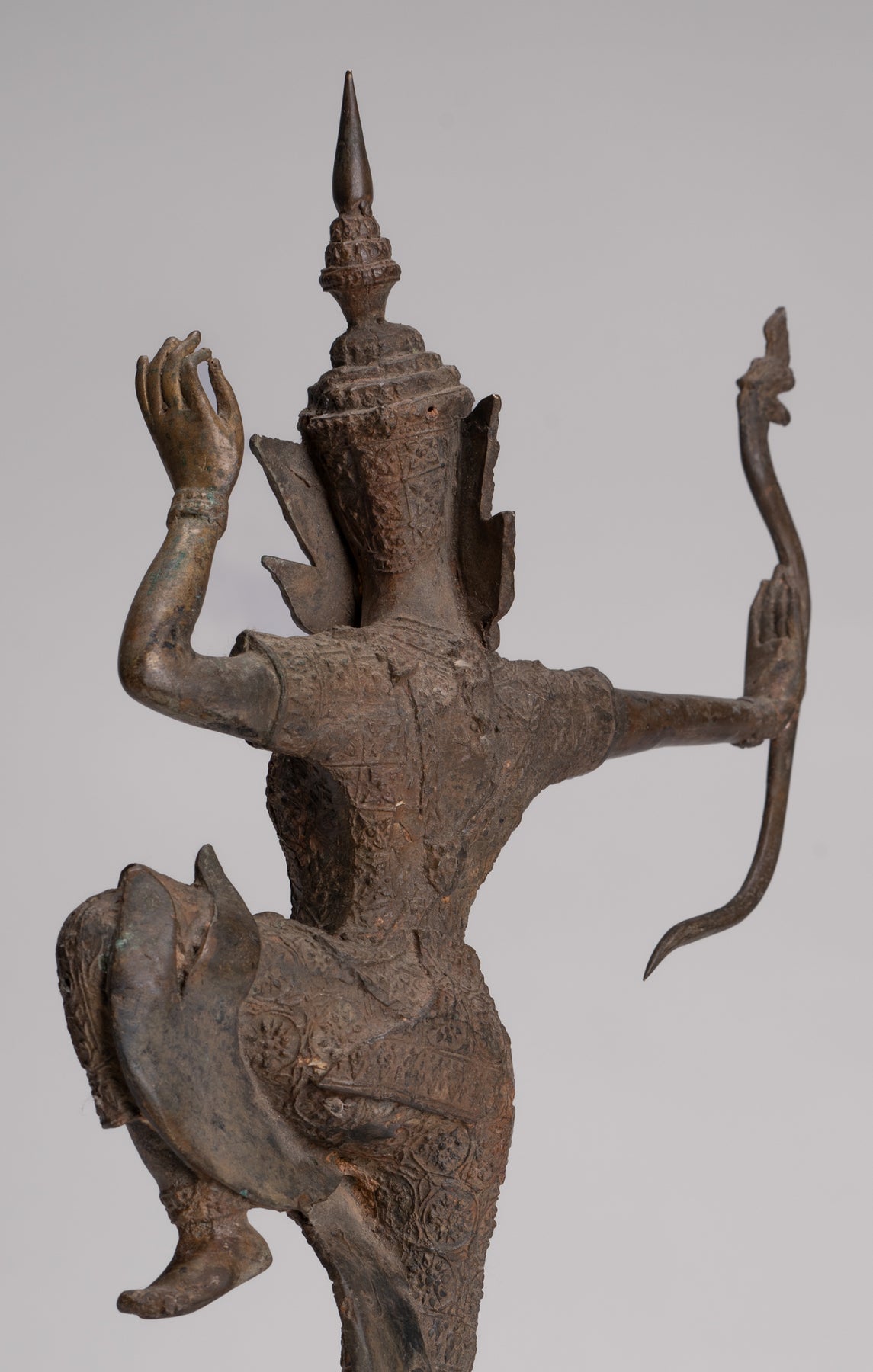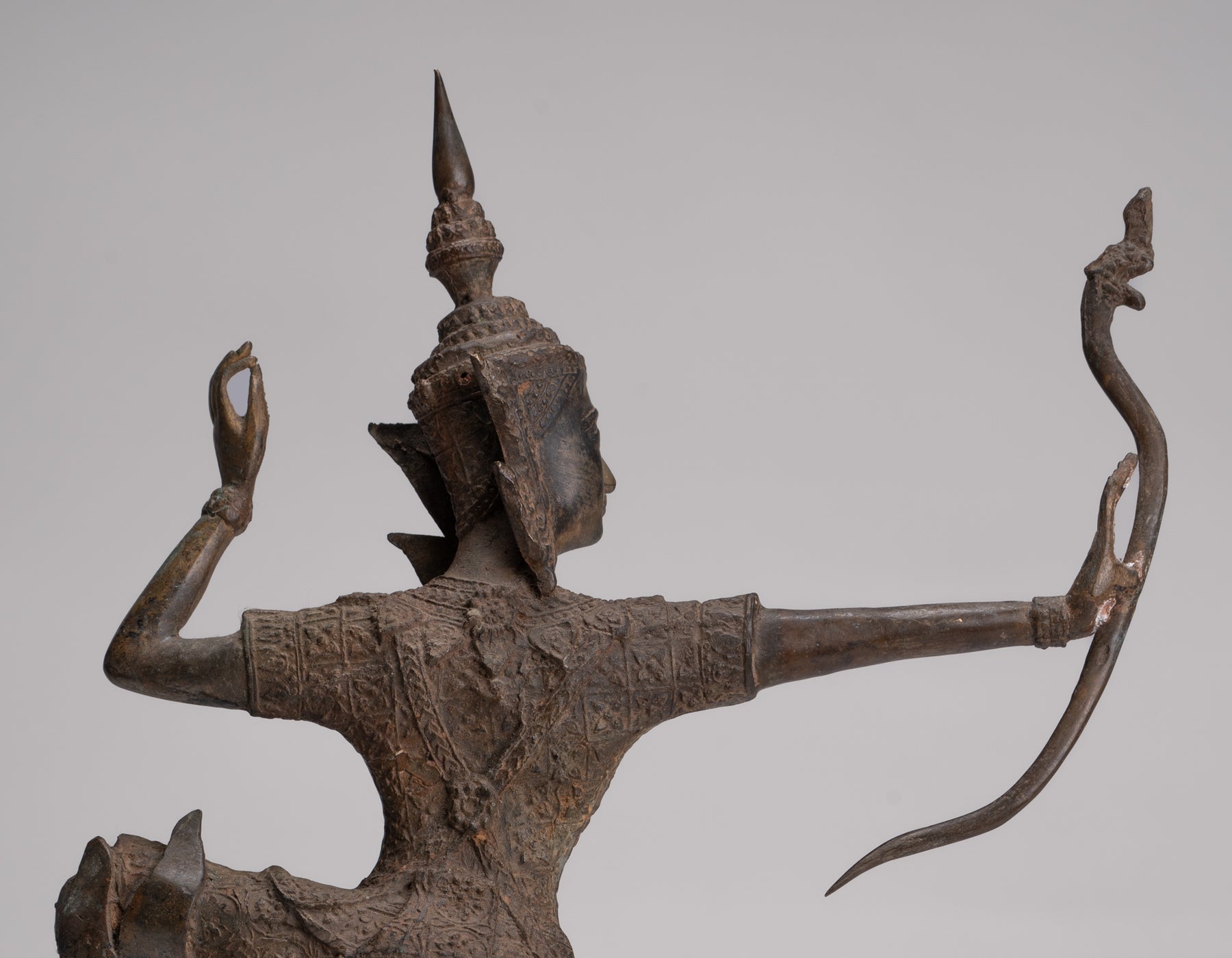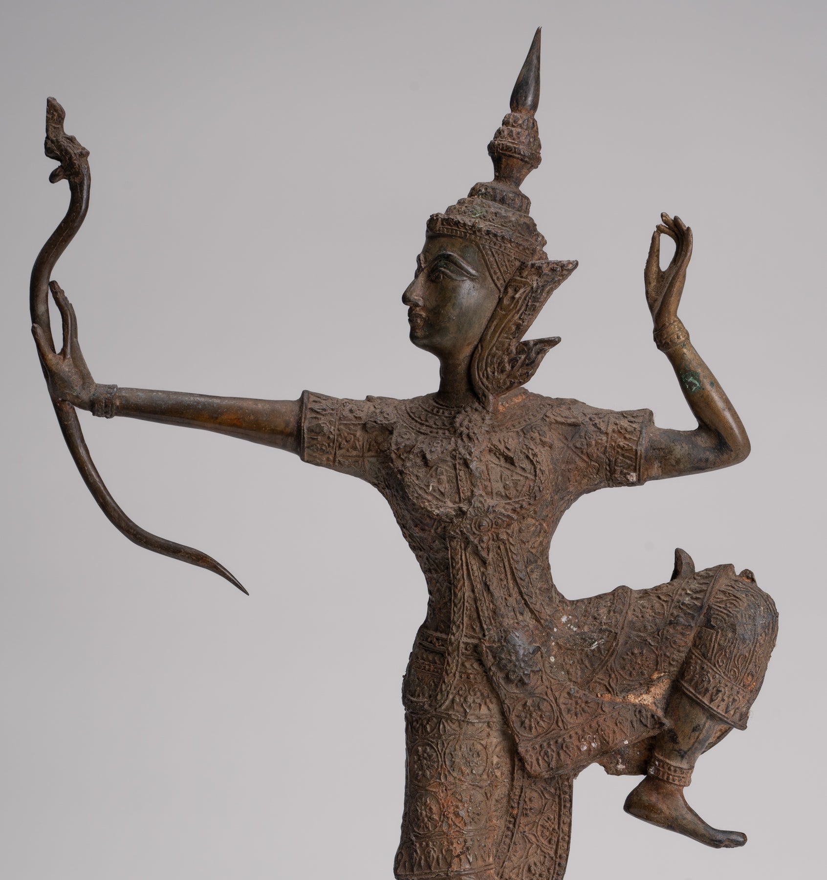 The Rama has perfect balance and proportions. The casting is beautiful as you can see in the fine details of the bow. Each detail is rendered perfectly. The distinctive azurite and malachite patina of the piece is also particularly delightful.