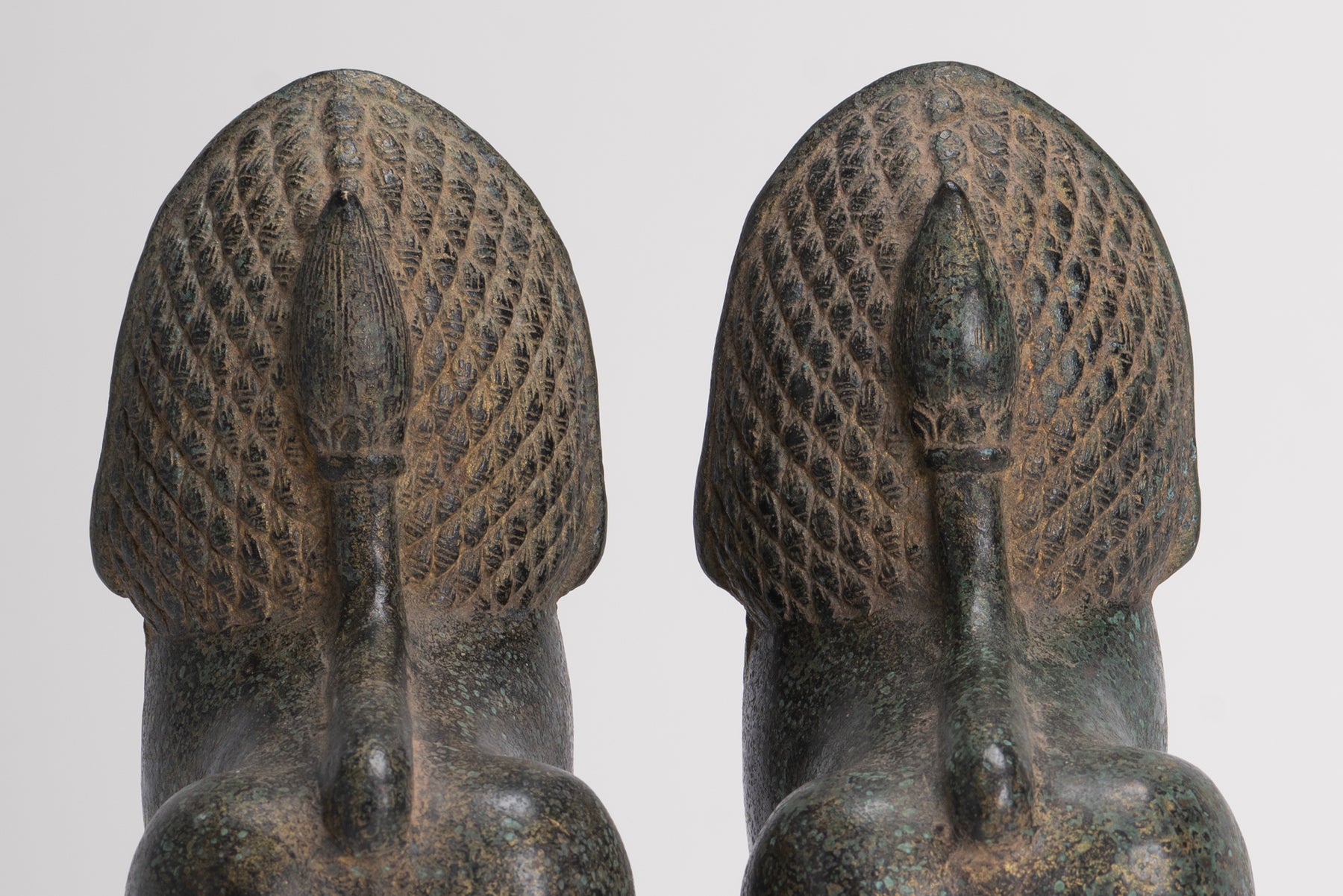 Each statue is cast in the round to show a strength body with an ornate coiffure with full lips and almond-shaped eyes with incised pupils beneath gently curving brows.