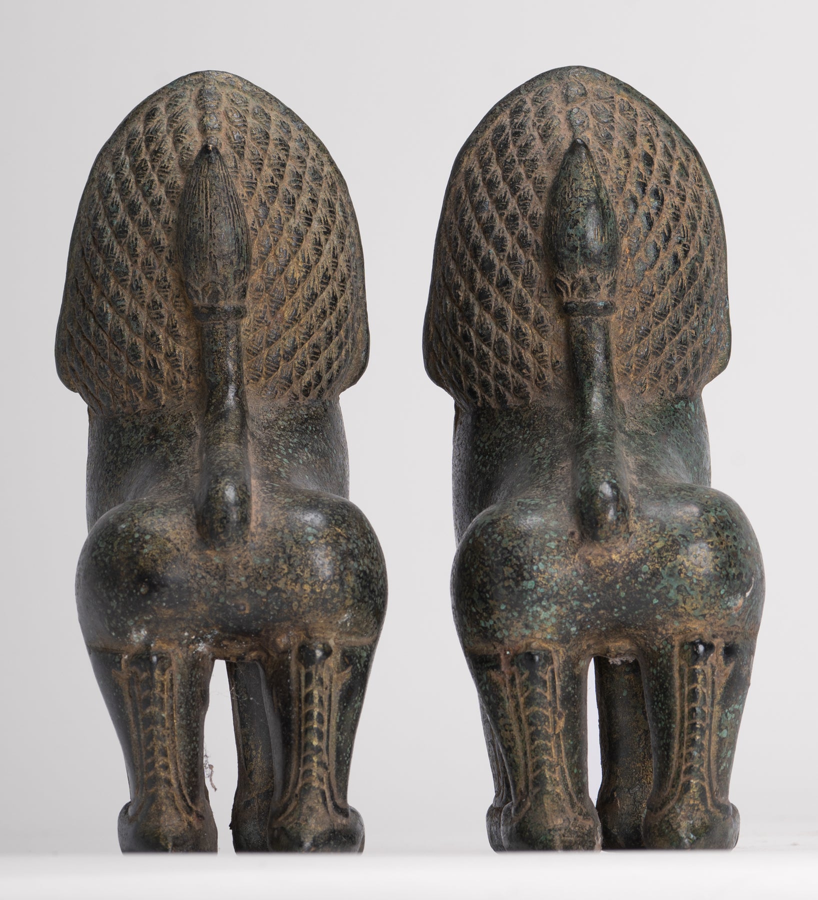 • Antique Khmer Style Bronze Standing Temple Guardian or Lions (Pair) - 20cm/8"