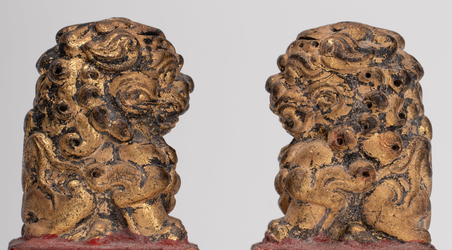 Cada león aquí está tallado completamente en forma redonda, con un cuerpo fuerte y musculoso y un peinado elaborado. Los rostros son especialmente expresivos, con labios carnosos y ojos almendrados, con las pupilas finamente incisas debajo de cejas suavemente arqueadas para transmitir alerta alerta y tranquila autoridad.